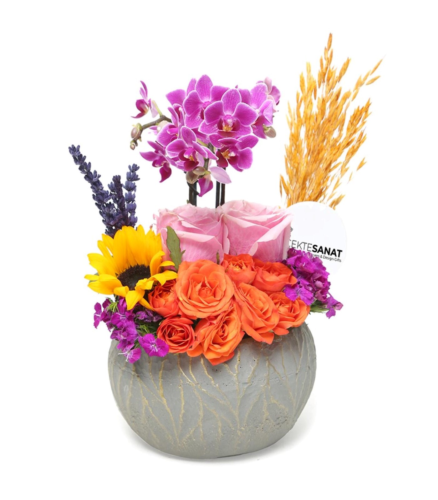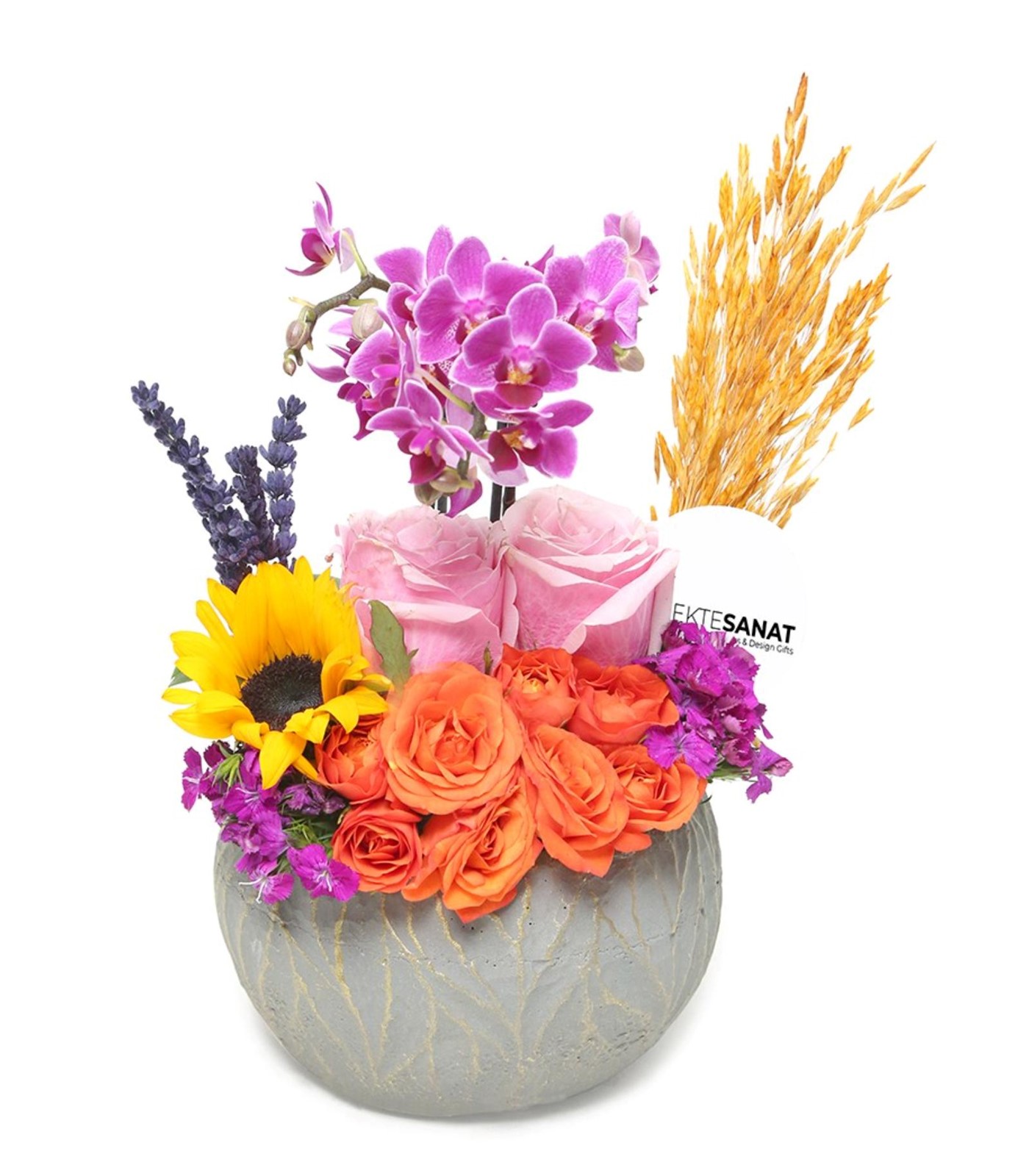Ürünümüzün içerisinde Mini Orkide,Turuncu Çardak Gül,Ayçiçeği, Pembe Gül ve Kuru Çiçekler mevcut olup sevdiklerinizin gündelik hayatına keyif katabilecek harika bir hediyedir.