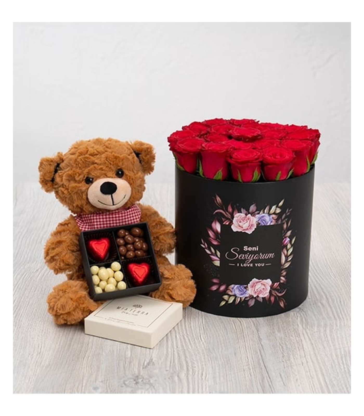 Seni Seviyorum Büyük Silindir Kutuda Güller Peluş oyuncak ve Çikolata