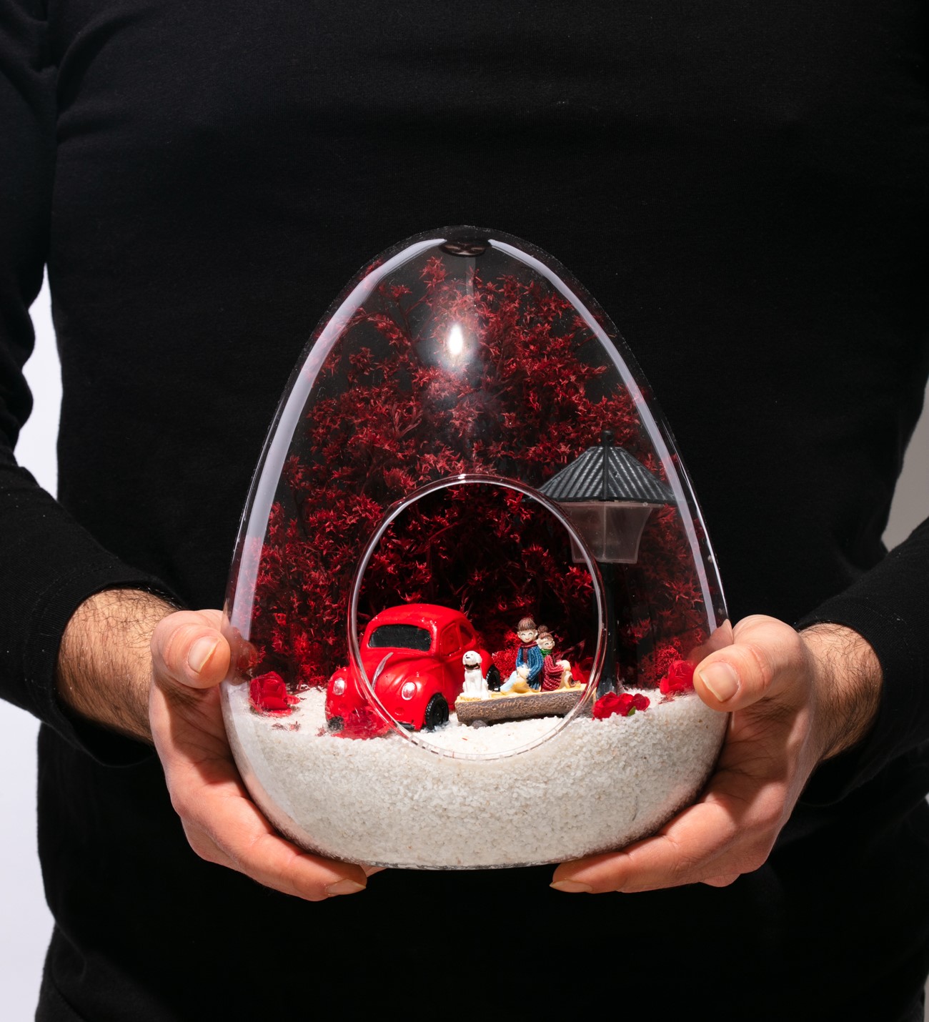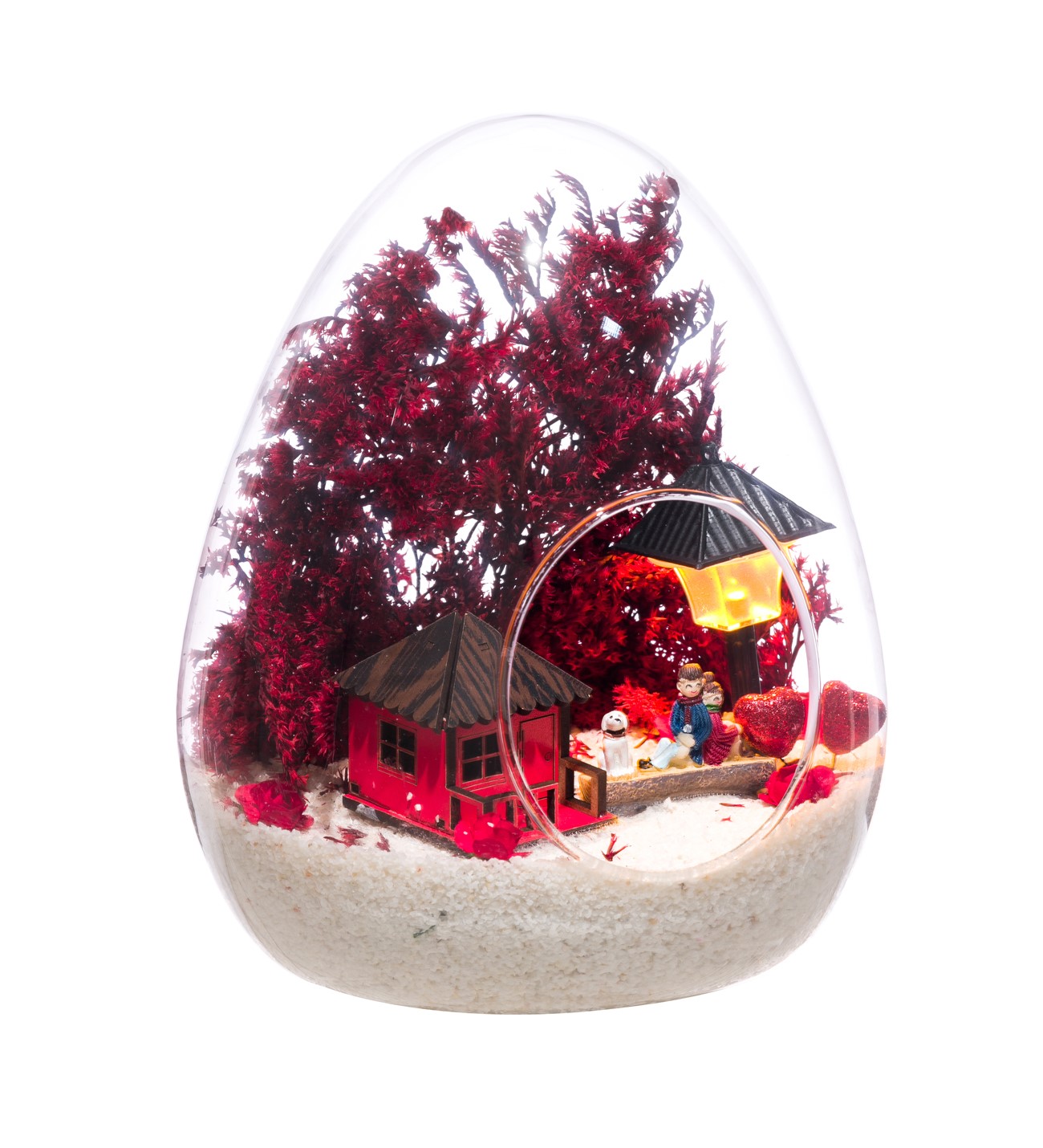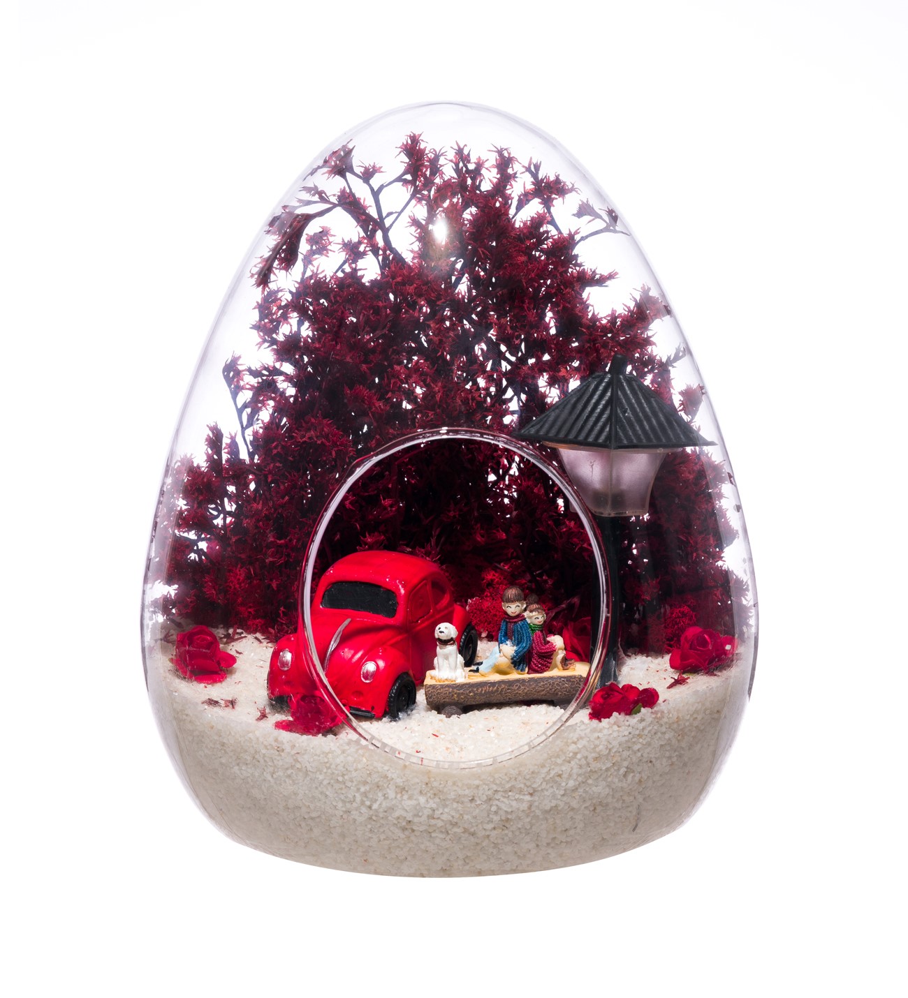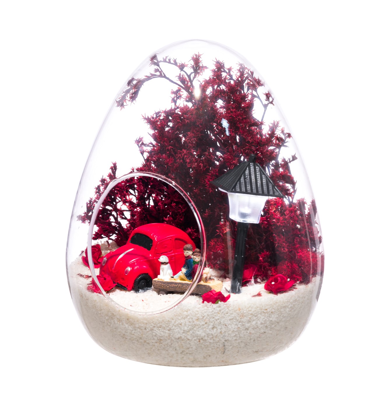 Küçük boy yumurta cam fanus içerisinde tasarladığımız bu güzel teraryum; beyaz kum, kurutulmuş bitkiler, şoklanmış yosunlar, yapay güller, bir adet kırmızı otomobil görseli, bir adet ışığı iki farklı renkte yanan led sokak lambası görseli ve bir adet bankta köpekleriyle oturan aşıkları simgeleyen obje ile kurgulanarak tamamlanmıştır. Ev ve ofis ortamlarının tamamında sergilenebilir teraryumun içinde, kurutulmuş ve şoklanmış bitkiler bulunduğundan hava alması önemlidir. Açık olan kısmının kapatılmaması veya büfe vb. kapalı alanlara konulmaması gereklidir. Özellikle her ortamda yıllarca, zevkle izlenebilecek özel bir teraryumdur. Yaklaşık Ölçüleri: 18x22cm NOT: Teraryumlarda kullanılan camlar, üfleme cam işçiliğiyle üretildiğinden bazı detaylarda farklılıklar gözlenebilir. Örneğin, yumurta şekli ve ağız bitiş noktalarının her biri kendine özgüdür.
