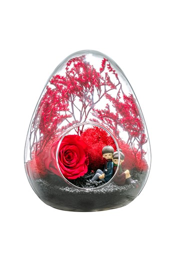 Küçük boy yumurta cam fanus içerisinde tasarladığımız bu güzel teraryum; beyaz kum, kurutulmuş bitkiler, şoklanmış yosunlar, yapay güller, bir adet mavi otomobil görseli, bir adet ışığı iki farklı renkte yanan led sokak lambası görseli ve bir adet bankta köpekleriyle oturan aşıkları simgeleyen obje ile kurgulanarak tamamlanmıştır. Ev ve ofis ortamlarının tamamında sergilenebilir teraryumun içinde, kurutulmuş ve şoklanmış bitkiler bulunduğundan hava alması önemlidir. Açık olan kısmının kapatılmaması veya büfe vb. kapalı alanlara konulmaması gereklidir. Özellikle her ortamda yıllarca, zevkle izlenebilecek özel bir teraryumdur. Yaklaşık Ölçüleri: 18x22cm NOT: Teraryumlarda kullanılan camlar, üfleme cam işçiliğiyle üretildiğinden bazı detaylarda farklılıklar gözlenebilir. Örneğin, yumurta şekli ve ağız bitiş noktalarının her biri kendine özgüdür.