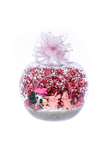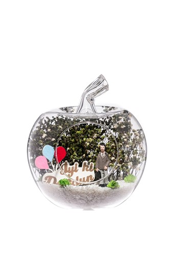 Küçük boy yumurta cam fanus içerisinde tasarladığımız bu güzel teraryum; beyaz kum, kurutulmuş bitkiler, şoklanmış yosunlar, yapay güller, bir adet sarı otomobil görseli, bir adet ışığı iki farklı renkte yanan led sokak lambası görseli ve bir adet bankta köpekleriyle oturan aşıkları simgeleyen obje ile kurgulanarak tamamlanmıştır. Ev ve ofis ortamlarının tamamında sergilenebilir teraryumun içinde, kurutulmuş ve şoklanmış bitkiler bulunduğundan hava alması önemlidir. Açık olan kısmının kapatılmaması veya büfe vb. kapalı alanlara konulmaması gereklidir. Özellikle her ortamda yıllarca, zevkle izlenebilecek özel bir teraryumdur. Yaklaşık Ölçüleri: 18x22cm NOT: Teraryumlarda kullanılan camlar, üfleme cam işçiliğiyle üretildiğinden bazı detaylarda farklılıklar gözlenebilir. Örneğin, yumurta şekli ve ağız bitiş noktalarının her biri kendine özgüdür.