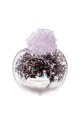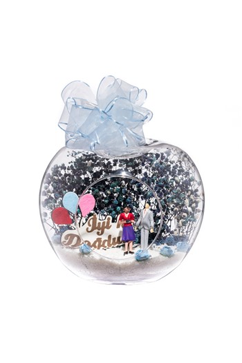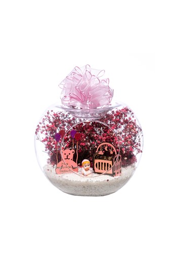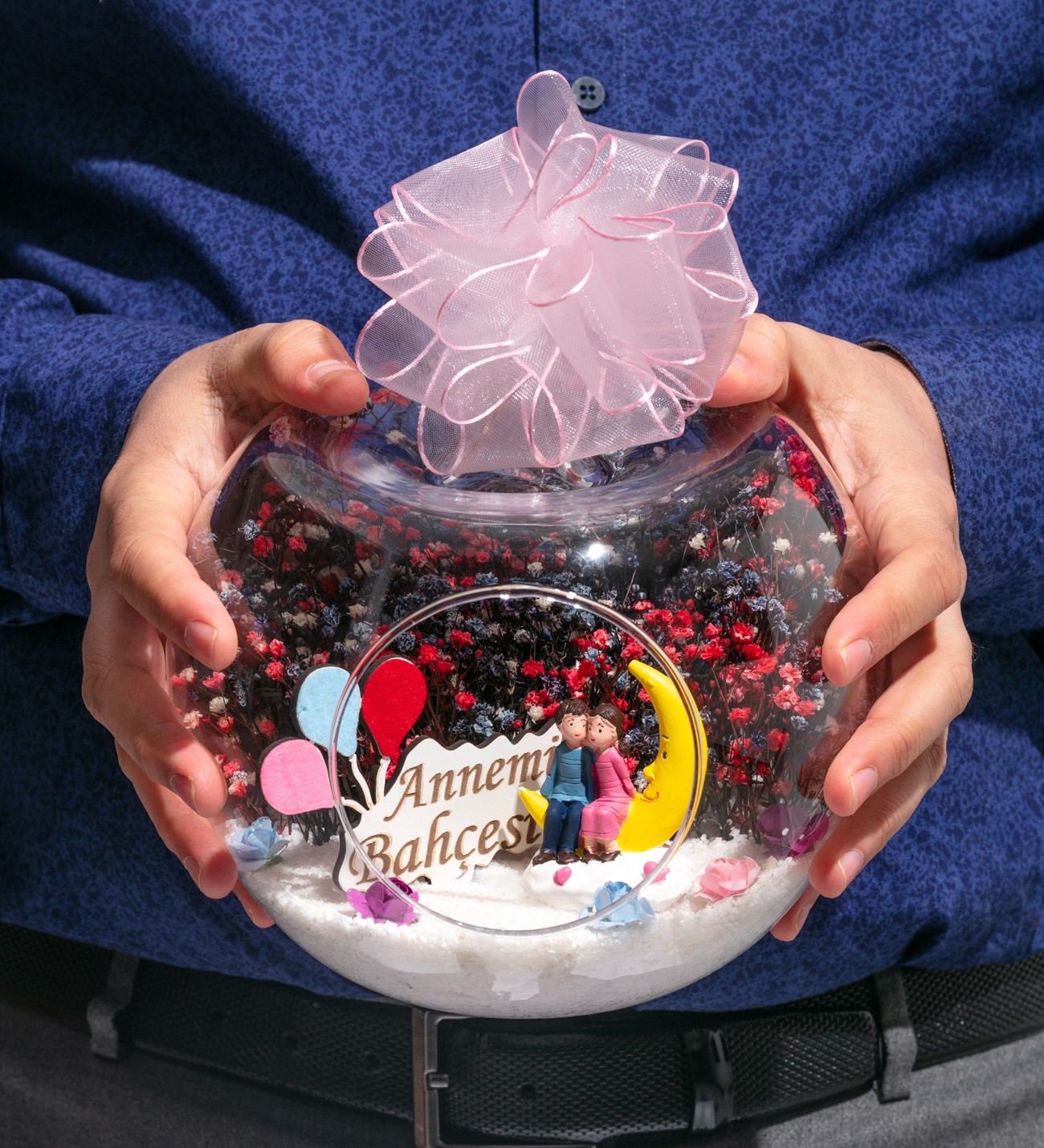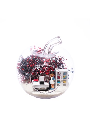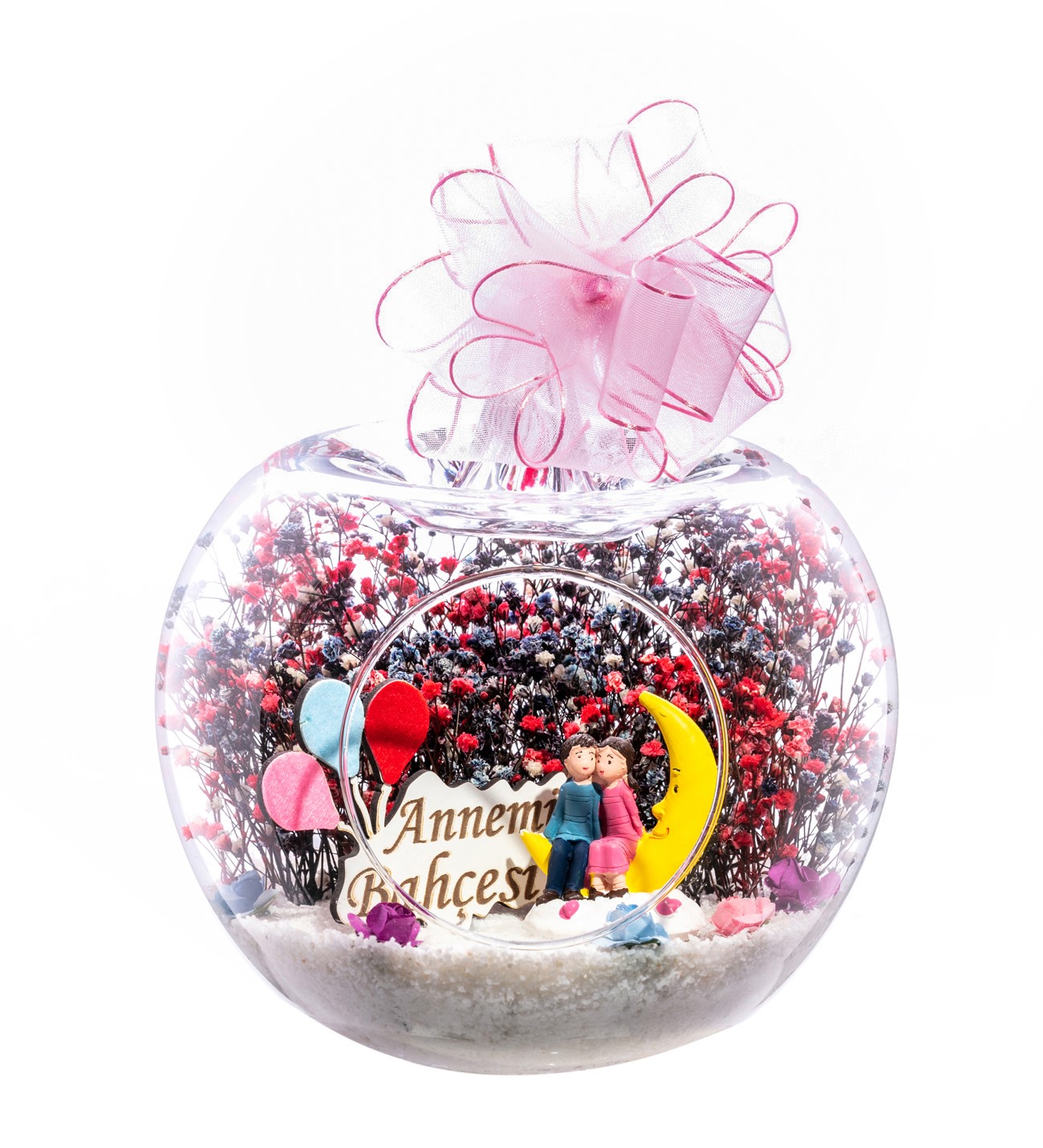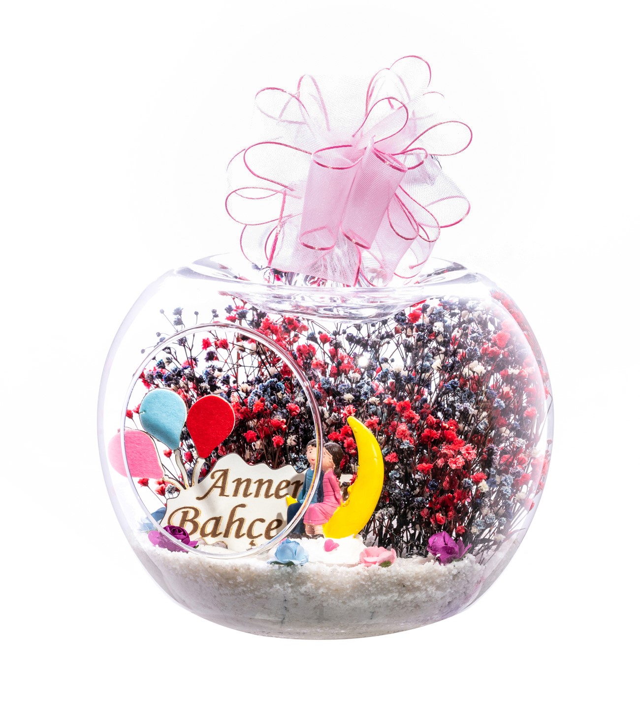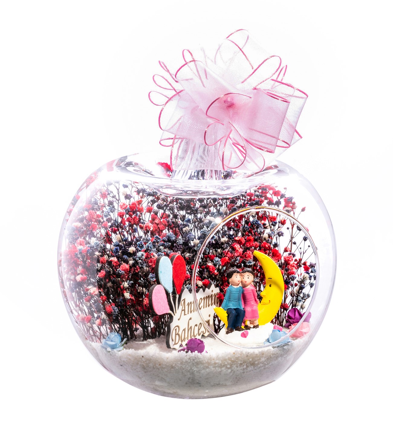Küçük boy elma cam fanus içerisinde tasarladığımız bu kurdeleli güzel teraryum; beyaz kum, karışık renkli kurutulmuş bitkiler, renkli yapay mini güller, bir adet ahşap annemin bahçesi yazılı balonlu tabela ve bir adet ay dede üzerinde yan yana oturan çifti simgeleyen objeler kullanılarak tamamlanmıştır. Ev ve ofis ortamlarının tamamında sergilenebilir teraryumun içinde, kurutulmuş bitkiler bulunduğundan hava alması önemlidir. Açık olan kısmının kapatılmaması veya büfe vb. kapalı alanlara konulmaması gereklidir. Özellikle her ortamda yıllarca, zevkle izlenebilecek özel bir teraryumdur. Yaklaşık Ölçüleri: 20x20cm NOT: Teraryumlarda kullanılan camlar, üfleme cam işçiliğiyle üretildiğinden bazı detaylarda farklılıklar gözlenebilir. Örneğin, sap kısmı ve ağız bitiş noktalarının her biri kendine özgüdür.
