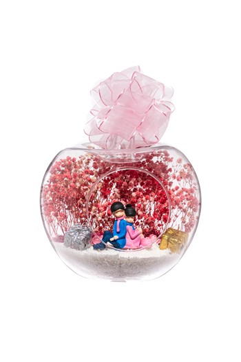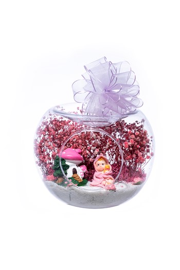 Küçük boy elma cam fanus içerisinde tasarladığımız bu kurdeleli güzel teraryum; beyaz kum, karışık renkli kurutulmuş bitkiler, renkli yapay mini güller, bir adet ahşap annemin bahçesi yazılı balonlu tabela ve bir adet evlerinin önünde yan yana oturan yaşlı çifti simgeleyen objeler kullanılarak tamamlanmıştır. Ev ve ofis ortamlarının tamamında sergilenebilir teraryumun içinde, kurutulmuş bitkiler bulunduğundan hava alması önemlidir. Açık olan kısmının kapatılmaması veya büfe vb. kapalı alanlara konulmaması gereklidir. Özellikle her ortamda yıllarca, zevkle izlenebilecek özel bir teraryumdur. Yaklaşık Ölçüleri: 20x20cm NOT: Teraryumlarda kullanılan camlar, üfleme cam işçiliğiyle üretildiğinden bazı detaylarda farklılıklar gözlenebilir. Örneğin, sap kısmı ve ağız bitiş noktalarının her biri kendine özgüdür.