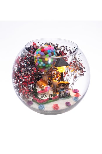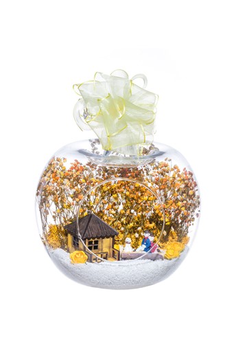 Küçük boy yumurta cam fanus içerisinde tasarladığımız teraryum; beyaz kum, kurutulmuş bitkiler, şoklanmış yosunlar, yapay mini güller, bir adet ahşap mavi ev, bir adet ahşap annemin bahçesi yazılı balonlu tabela ve bir adet bankta sırt sırta oturan çifti simgeleyen objelerle tamamlanmıştır. Ev ve ofis ortamlarının tamamında sergilenebilir teraryumun içinde canlı bitki bulunmadığından, herhangi bir bakıma ihtiyacı yoktur. Özellikle her ortamda yıllarca, zevkle izlenebilecek özel bir teraryumdur. Yaklaşık Ölçüleri: 18x22cm NOT: Teraryumlarda kullanılan camlar, üfleme cam işçiliğiyle üretildiğinden bazı detaylarda farklılıklar gözlenebilir. Örneğin, sap kısmı ve ağız bitiş noktalarının her biri kendine özgüdür.