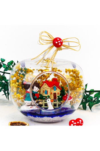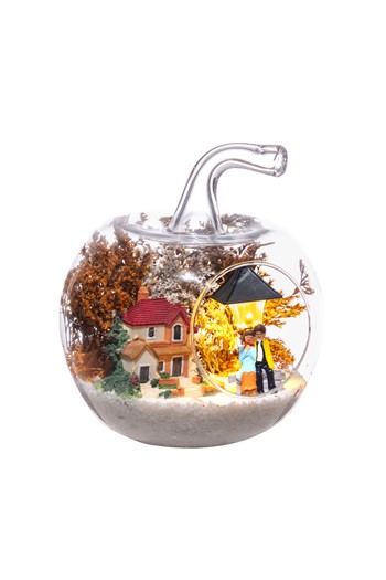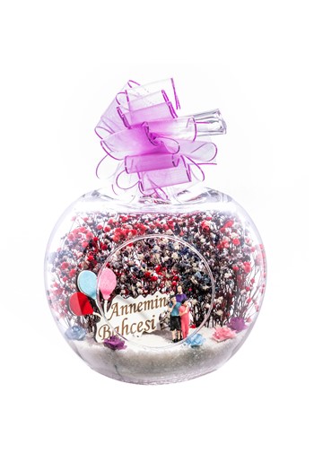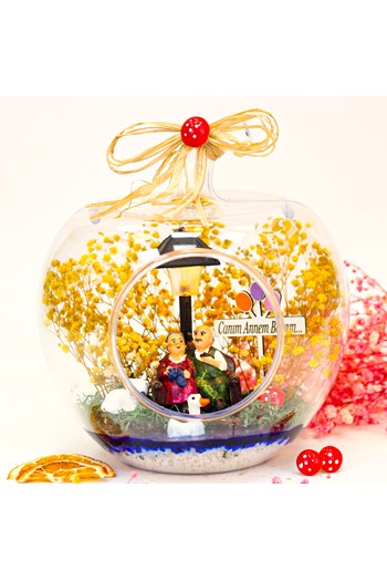 Küçük boy elma cam fanus içerisinde tasarladığımız bu kurdeleli güzel teraryum; beyaz kum, karışık renkli kurutulmuş bitkiler, renkli yapay mini güller, bir adet ahşap annemin bahçesi yazılı balonlu tabela ve bir adet yan yana bankta oturan çifti simgeleyen objeler kullanılarak tamamlanmıştır. Ev ve ofis ortamlarının tamamında sergilenebilir teraryumun içinde, kurutulmuş bitkiler bulunduğundan hava alması önemlidir. Açık olan kısmının kapatılmaması veya büfe vb. kapalı alanlara konulmaması gereklidir. Özellikle her ortamda yıllarca, zevkle izlenebilecek özel bir teraryumdur. Yaklaşık Ölçüleri: 20x20cm NOT: Teraryumlarda kullanılan camlar, üfleme cam işçiliğiyle üretildiğinden bazı detaylarda farklılıklar gözlenebilir. Örneğin, sap kısmı ve ağız bitiş noktalarının her biri kendine özgüdür.