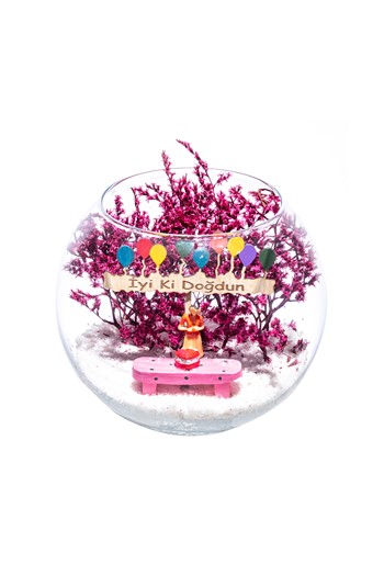 Küçük boy yumurta cam fanus içerisinde tasarladığımız teraryum; beyaz kum, kurutulmuş bitkiler, şoklanmış yosunlar, yapay mini güller, bir adet ahşap mavi ev, bir adet ahşap annemin bahçesi yazılı balonlu tabela ve bir adet bankta yan yana oturan çifti simgeleyen objelerle tamamlanmıştır. Ev ve ofis ortamlarının tamamında sergilenebilir teraryumun içinde canlı bitki bulunmadığından, herhangi bir bakıma ihtiyacı yoktur. Özellikle her ortamda yıllarca, zevkle izlenebilecek özel bir teraryumdur. Yaklaşık Ölçüleri: 18x22cm NOT: Teraryumlarda kullanılan camlar, üfleme cam işçiliğiyle üretildiğinden bazı detaylarda farklılıklar gözlenebilir. Örneğin, sap kısmı ve ağız bitiş noktalarının her biri kendine özgüdür.
