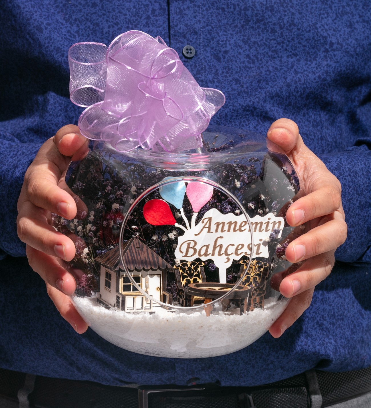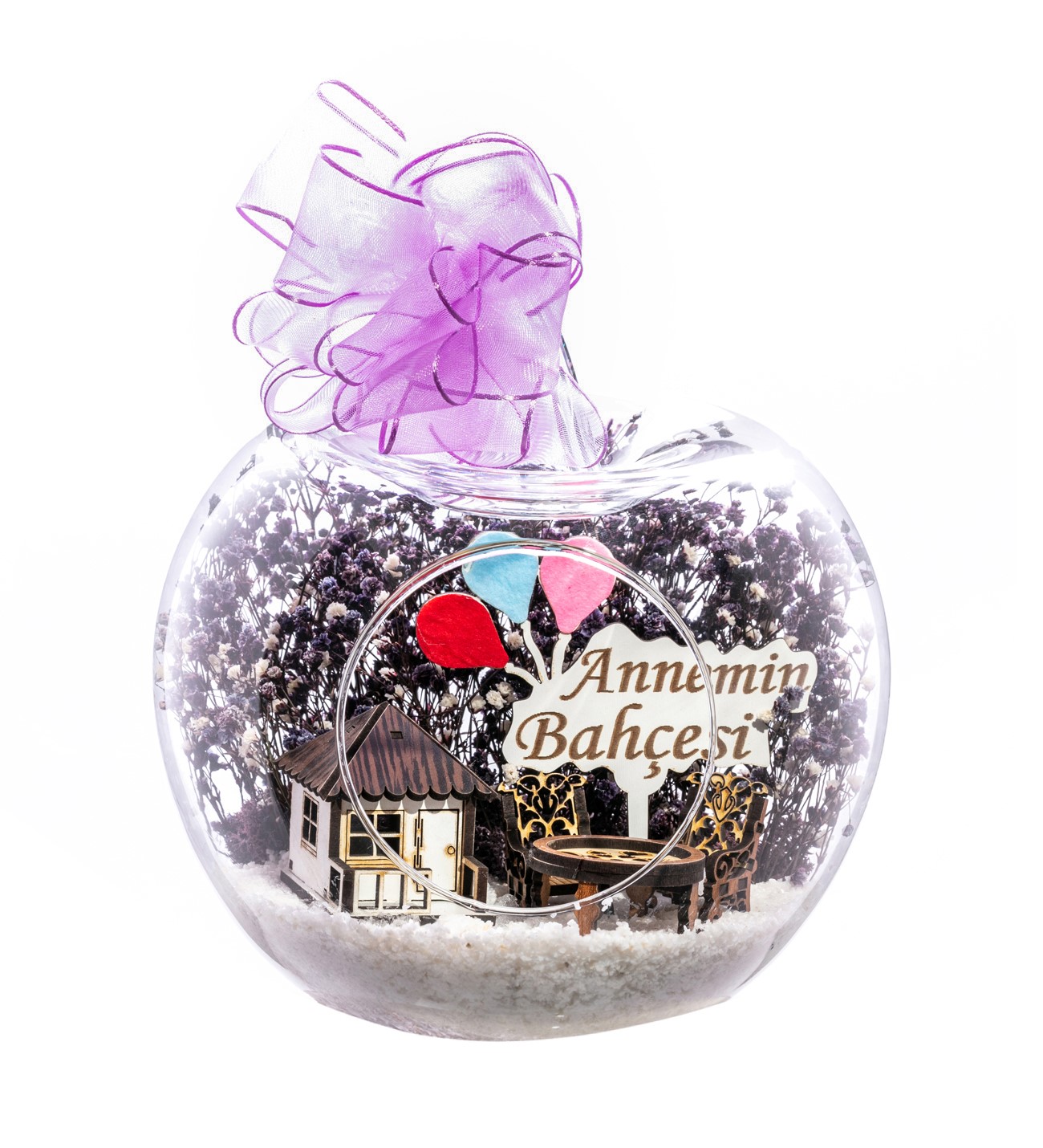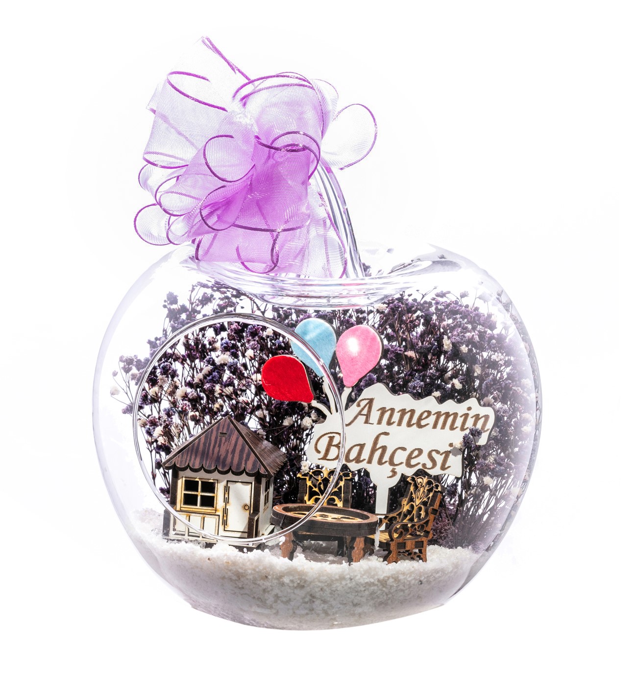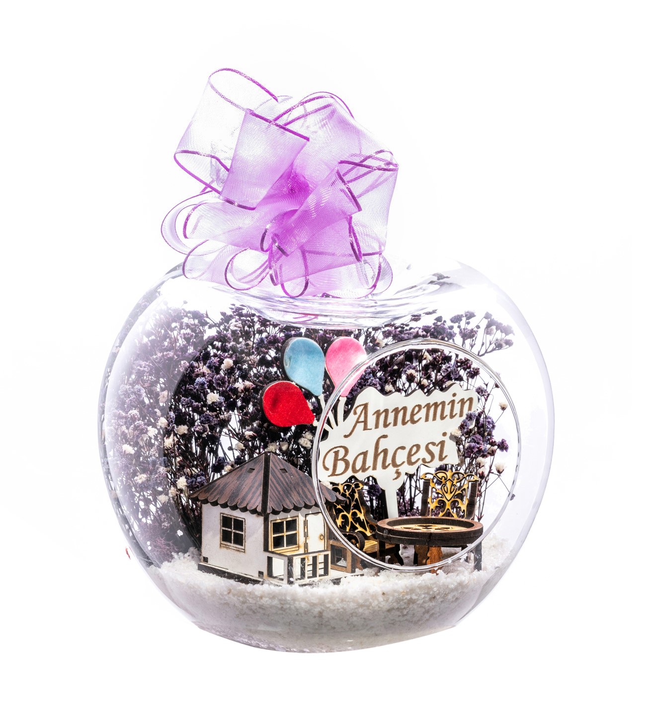 Küçük boy elma cam fanus içerisinde tasarladığımız bu kurdeleli güzel teraryum; beyaz kum, kurutulmuş bitkiler, şoklanmış yosunlar, bir adet ahşap annemin bahçesi yazılı balonlu tabela, bir adet beyaz ahşap ev ve otantik ahşap bahçe mobilyalarını simgeleyen objeler kullanılarak tamamlanmıştır. Ev ve ofis ortamlarının tamamında sergilenebilir teraryumun içinde, kurutulmuş bitkiler bulunduğundan hava alması önemlidir. Açık olan kısmının kapatılmaması veya büfe vb. kapalı alanlara konulmaması gereklidir. Özellikle her ortamda yıllarca, zevkle izlenebilecek özel bir teraryumdur. Yaklaşık Ölçüleri: 20x20cm NOT: Teraryumlarda kullanılan camlar, üfleme cam işçiliğiyle üretildiğinden bazı detaylarda farklılıklar gözlenebilir. Örneğin, sap kısmı ve ağız bitiş noktalarının her biri kendine özgüdür.