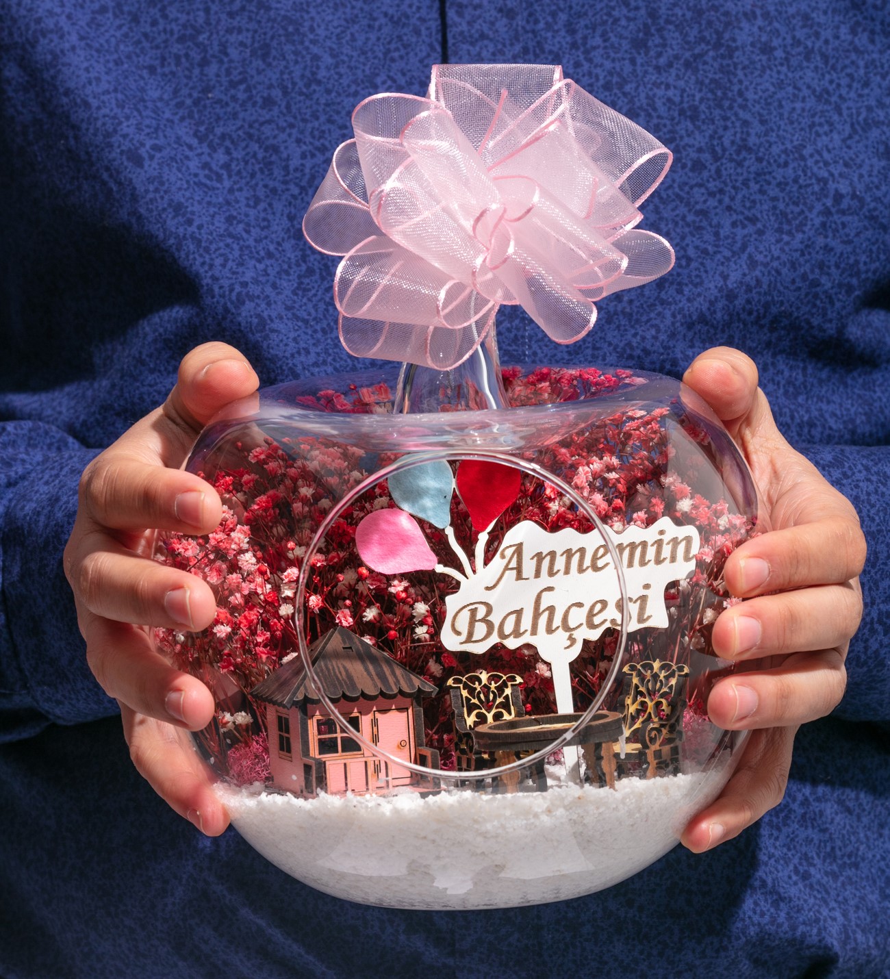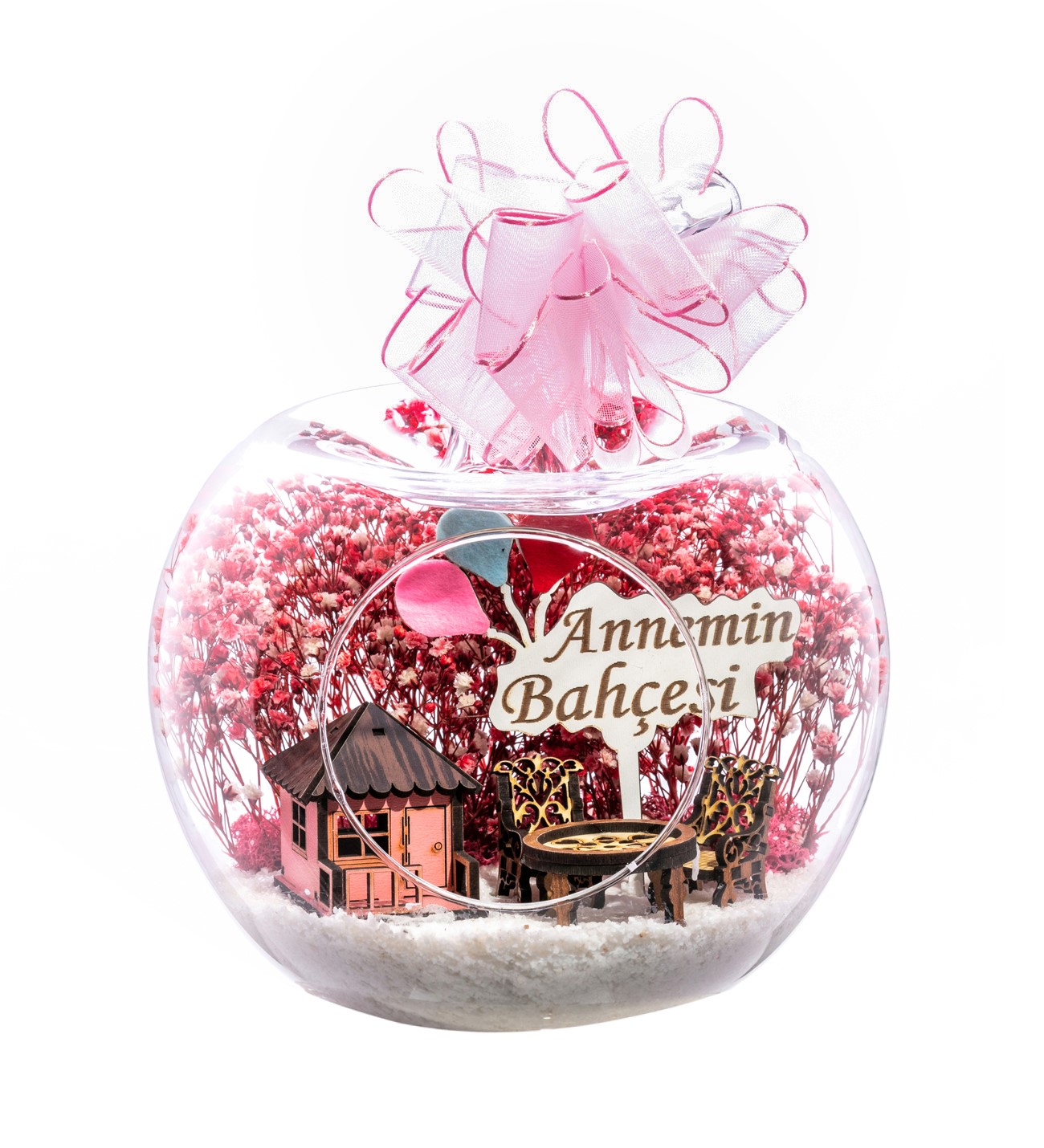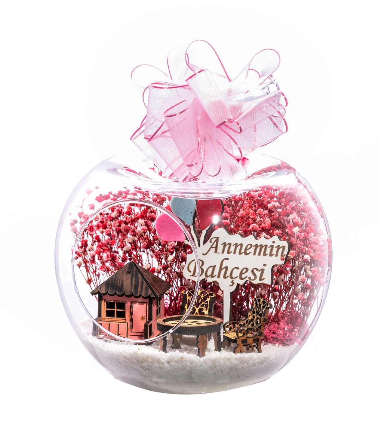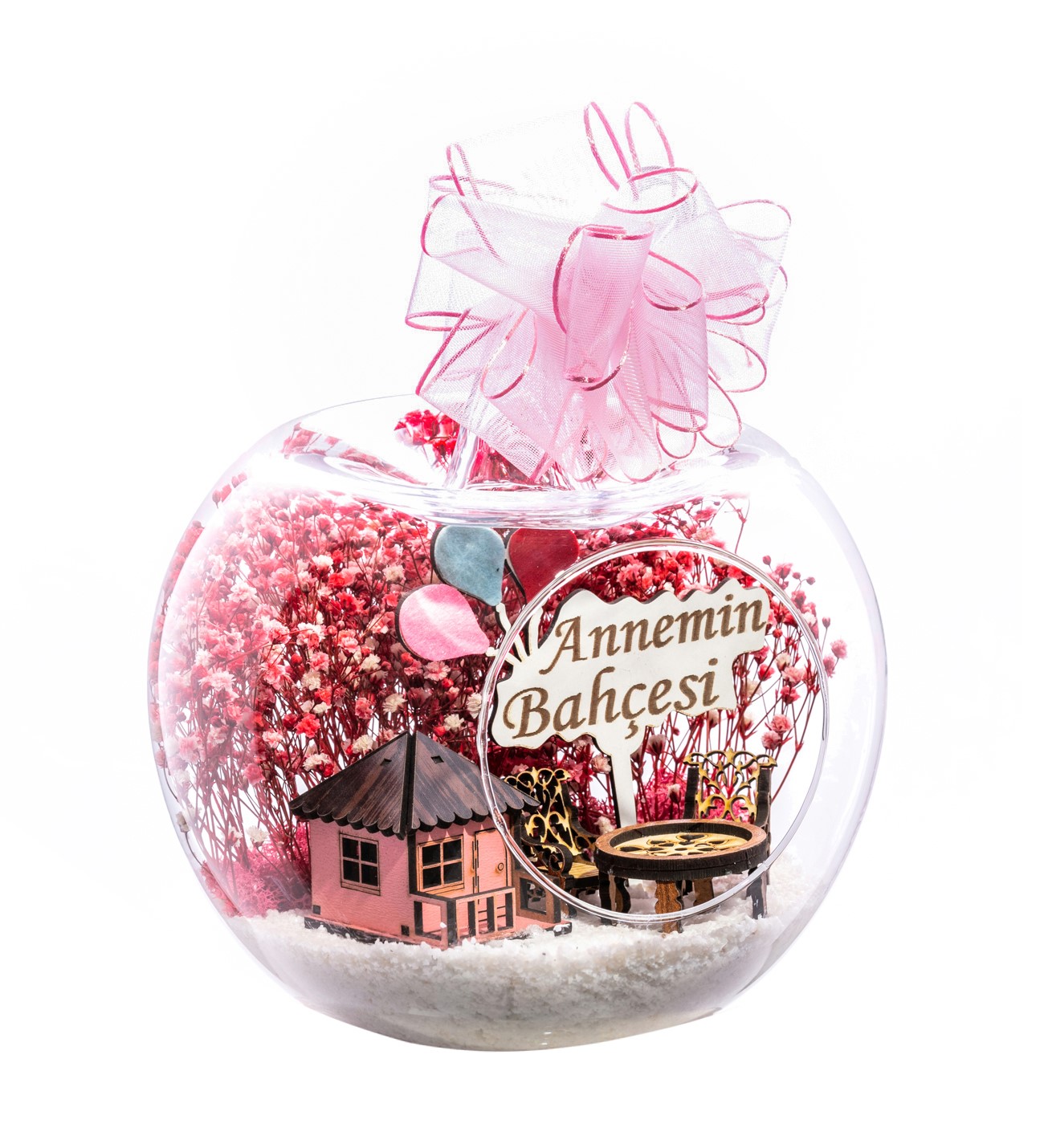 Küçük boy elma cam fanus içerisinde tasarladığımız bu kurdeleli güzel teraryum; beyaz kum, kurutulmuş bitkiler, şoklanmış yosunlar, bir adet ahşap annemin bahçesi yazılı balonlu tabela, bir adet beyaz ahşap ev ve otantik ahşap bahçe mobilyalarını simgeleyen objeler kullanılarak tamamlanmıştır. Ev ve ofis ortamlarının tamamında sergilenebilir teraryumun içinde, kurutulmuş bitkiler bulunduğundan hava alması önemlidir. Açık olan kısmının kapatılmaması veya büfe vb. kapalı alanlara konulmaması gereklidir. Özellikle her ortamda yıllarca, zevkle izlenebilecek özel bir teraryumdur. Yaklaşık Ölçüleri: 20x20cm NOT: Teraryumlarda kullanılan camlar, üfleme cam işçiliğiyle üretildiğinden bazı detaylarda farklılıklar gözlenebilir. Örneğin, sap kısmı ve ağız bitiş noktalarının her biri kendine özgüdür.