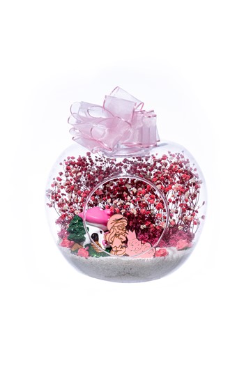 Küçük boy elma cam fanus içerisinde tasarladığımız bu kurdeleli güzel teraryum; beyaz kum, karışık renkli kurutulmuş bitkiler, renkli yapay mini güller, bir adet ahşap annemin bahçesi yazılı balonlu tabela ve bir adet göz göze bakan çifti simgeleyen objeler kullanılarak tamamlanmıştır. Ev ve ofis ortamlarının tamamında sergilenebilir teraryumun içinde, kurutulmuş bitkiler bulunduğundan hava alması önemlidir. Açık olan kısmının kapatılmaması veya büfe vb. kapalı alanlara konulmaması gereklidir. Özellikle her ortamda yıllarca, zevkle izlenebilecek özel bir teraryumdur. Yaklaşık Ölçüleri: 20x20cm NOT: Teraryumlarda kullanılan camlar, üfleme cam işçiliğiyle üretildiğinden bazı detaylarda farklılıklar gözlenebilir. Örneğin, sap kısmı ve ağız bitiş noktalarının her biri kendine özgüdür.