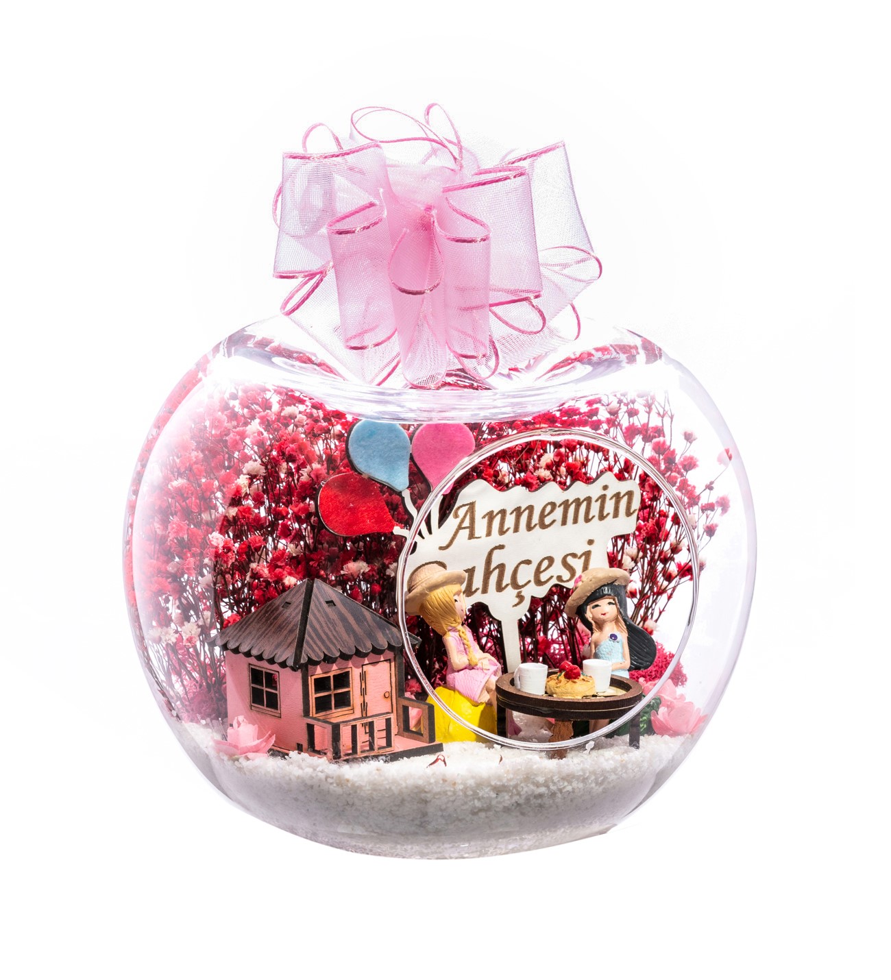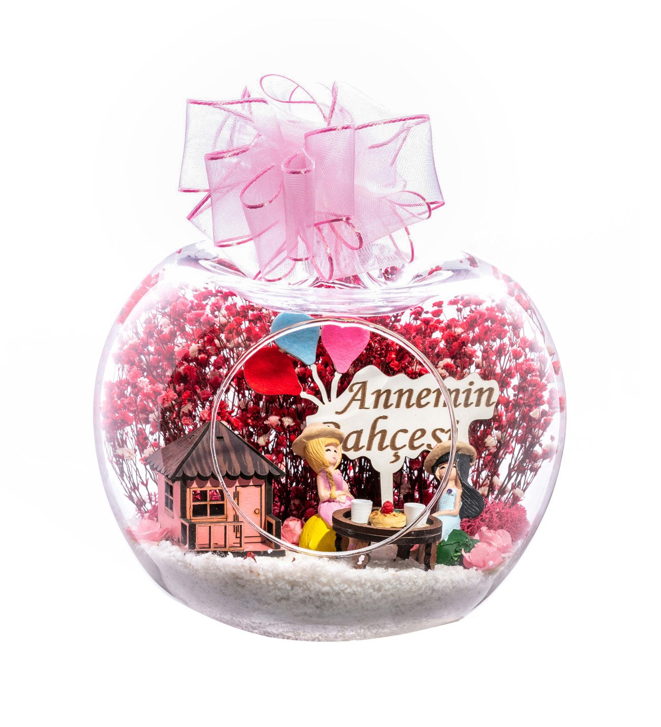 Küçük boy elma cam fanus içerisinde tasarladığımız bu kurdeleli güzel teraryum; beyaz kum, kurutulmuş bitkiler, şoklanmış yosunlar, yapay mini güller, bir adet ahşap annemin bahçesi yazılı balonlu tabela, bir adet pembe ahşap ev, bir adet üzerinde turtası ve kupalarıyla otantik ahşap sehpa ve sohbet eden iki genç kadını simgeleyen objeler kullanılarak tamamlanmıştır. Ev ve ofis ortamlarının tamamında sergilenebilir teraryumun içinde, kurutulmuş bitkiler bulunduğundan hava alması önemlidir. Açık olan kısmının kapatılmaması veya büfe vb. kapalı alanlara konulmaması gereklidir. Özellikle her ortamda yıllarca, zevkle izlenebilecek özel bir teraryumdur. Yaklaşık Ölçüleri: 20x20cm NOT: Teraryumlarda kullanılan camlar, üfleme cam işçiliğiyle üretildiğinden bazı detaylarda farklılıklar gözlenebilir. Örneğin, sap kısmı ve ağız bitiş noktalarının her biri kendine özgüdür.