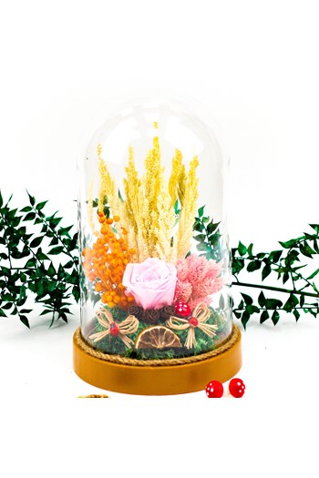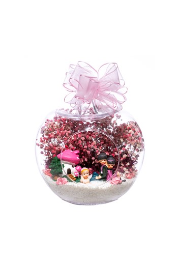 Küçük boy yumurta cam fanus içerisinde tasarladığımız teraryum; beyaz kum, kurutulmuş bitkiler, şoklanmış yosunlar, yapay mini güller, bir adet ahşap mavi ev, bir adet ahşap annemin bahçesi yazılı balonlu tabela ve bir adet sırt sırta oturan çifti simgeleyen objelerle tamamlanmıştır. Ev ve ofis ortamlarının tamamında sergilenebilir teraryumun içinde canlı bitki bulunmadığından, herhangi bir bakıma ihtiyacı yoktur. Özellikle her ortamda yıllarca, zevkle izlenebilecek özel bir teraryumdur. Yaklaşık Ölçüleri: 18x22cm NOT: Teraryumlarda kullanılan camlar, üfleme cam işçiliğiyle üretildiğinden bazı detaylarda farklılıklar gözlenebilir. Örneğin, sap kısmı ve ağız bitiş noktalarının her biri kendine özgüdür.