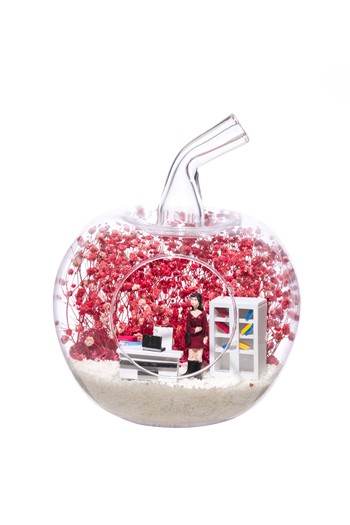 Küçük boy elma cam fanus içerisinde tasarladığımız bu kurdeleli güzel teraryum; beyaz kum, karışık renkli kurutulmuş bitkiler, renkli yapay mini güller, renkli simli kalpler, bir adet ahşap annemin bahçesi yazılı balonlu tabela, bir adet üzerinde turtasıyla sohbet masası ve iki adet genç kadını simgeleyen objeler kullanılarak tamamlanmıştır. Ev ve ofis ortamlarının tamamında sergilenebilir teraryumun içinde, kurutulmuş bitkiler bulunduğundan hava alması önemlidir. Açık olan kısmının kapatılmaması veya büfe vb. kapalı alanlara konulmaması gereklidir. Özellikle her ortamda yıllarca, zevkle izlenebilecek özel bir teraryumdur. Yaklaşık Ölçüleri: 20x20cm NOT: Teraryumlarda kullanılan camlar, üfleme cam işçiliğiyle üretildiğinden bazı detaylarda farklılıklar gözlenebilir. Örneğin, sap kısmı ve ağız bitiş noktalarının her biri kendine özgüdür.