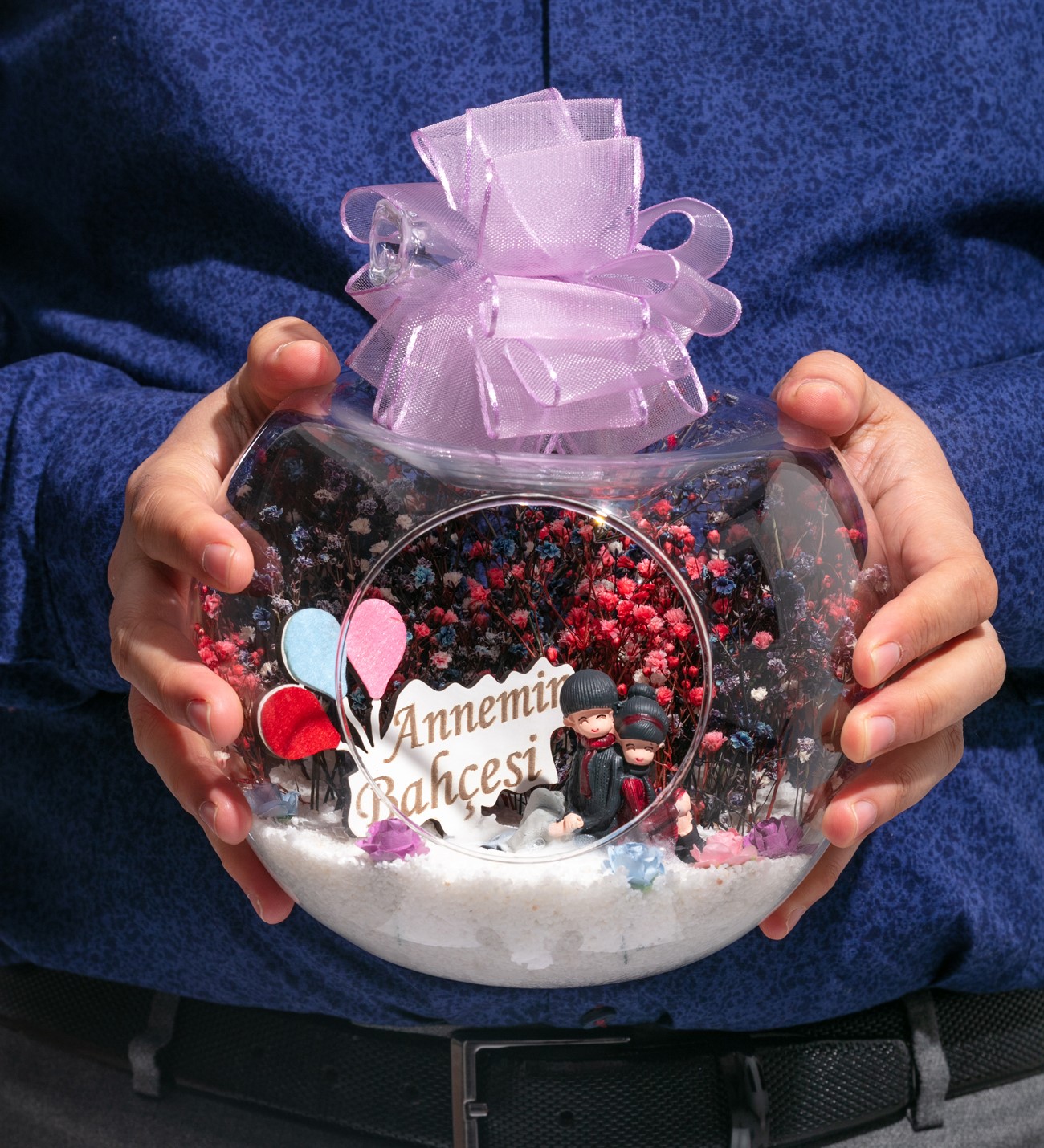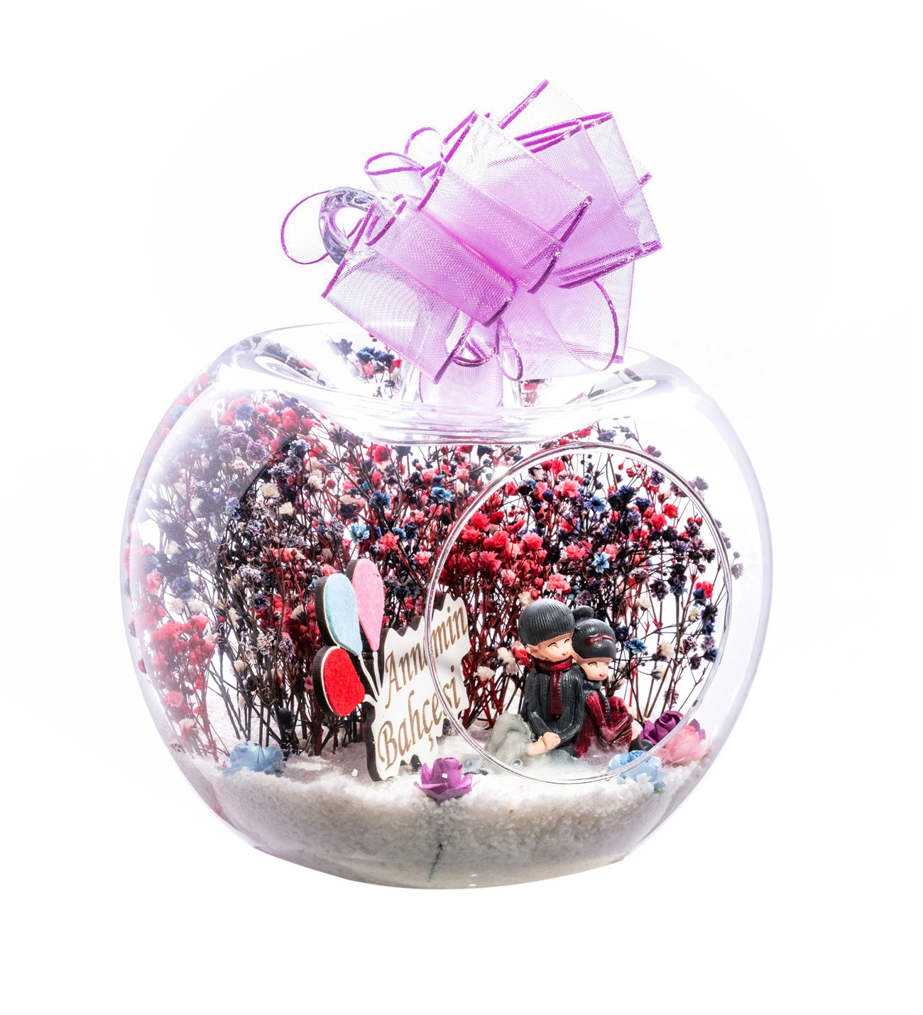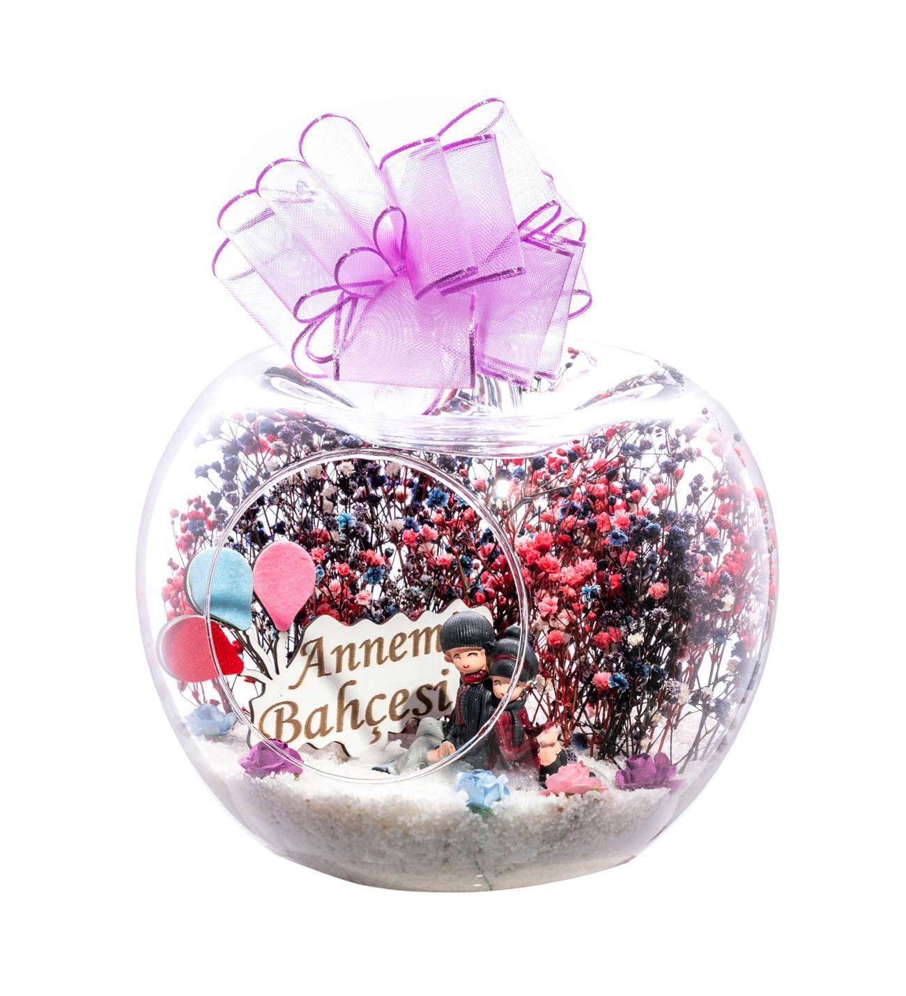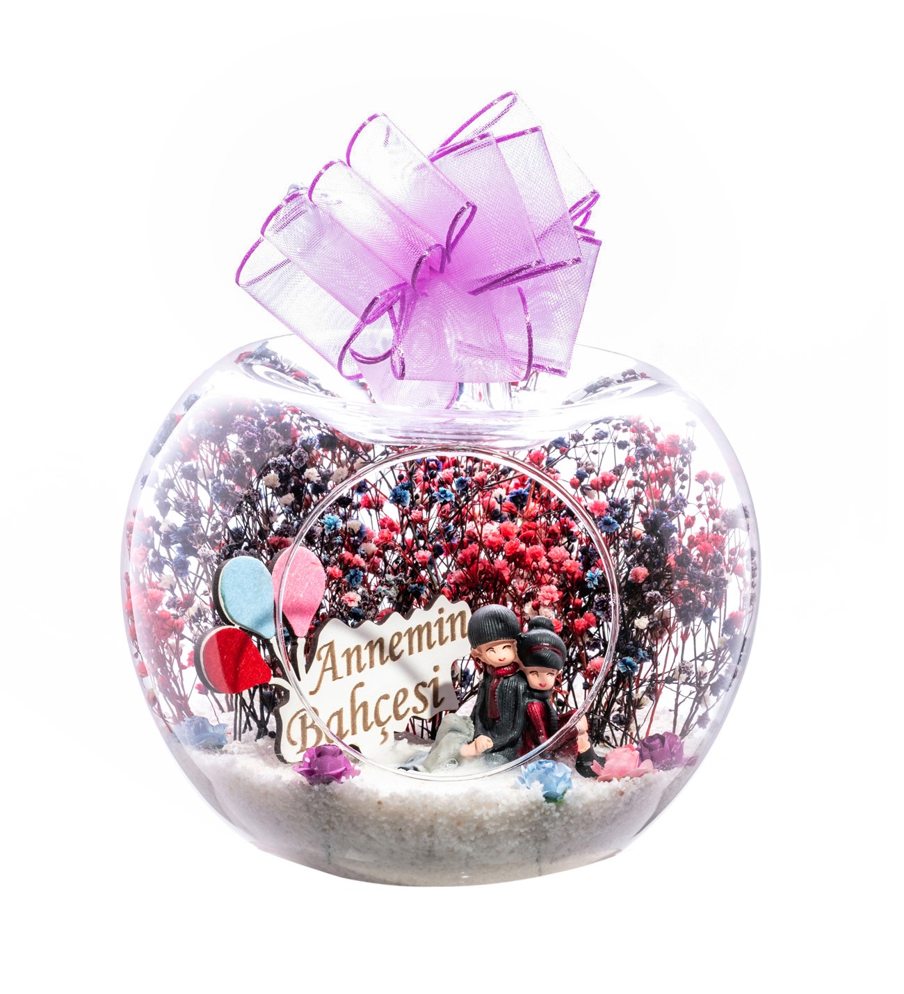 Küçük boy elma cam fanus içerisinde tasarladığımız bu kurdeleli güzel teraryum; beyaz kum, karışık renkli kurutulmuş bitkiler, renkli yapay mini güller, bir adet ahşap annemin bahçesi yazılı balonlu tabela ve bir adet sırt sırta oturan çifti simgeleyen objeler kullanılarak tamamlanmıştır. Ev ve ofis ortamlarının tamamında sergilenebilir teraryumun içinde, kurutulmuş bitkiler bulunduğundan hava alması önemlidir. Açık olan kısmının kapatılmaması veya büfe vb. kapalı alanlara konulmaması gereklidir. Özellikle her ortamda yıllarca, zevkle izlenebilecek özel bir teraryumdur. Yaklaşık Ölçüleri: 20x20cm NOT: Teraryumlarda kullanılan camlar, üfleme cam işçiliğiyle üretildiğinden bazı detaylarda farklılıklar gözlenebilir. Örneğin, sap kısmı ve ağız bitiş noktalarının her biri kendine özgüdür.