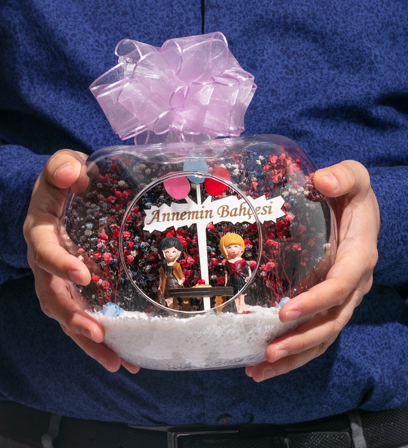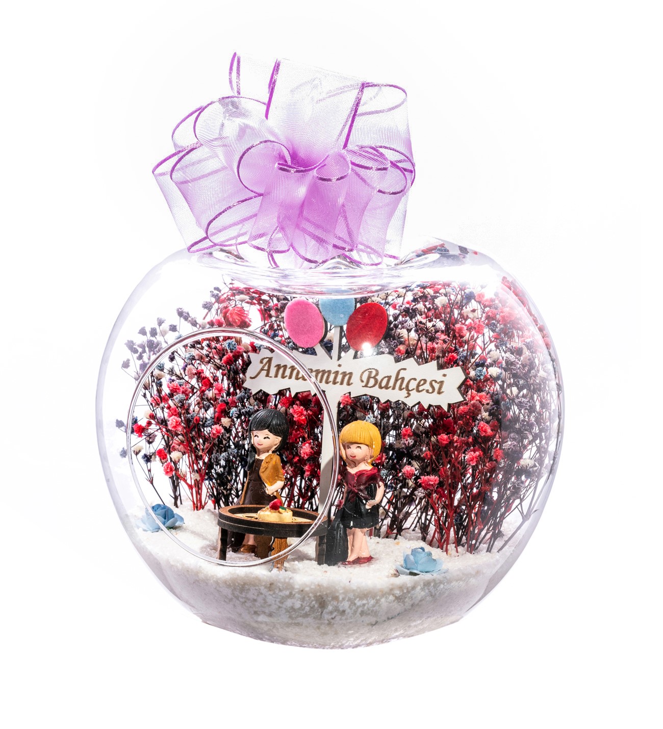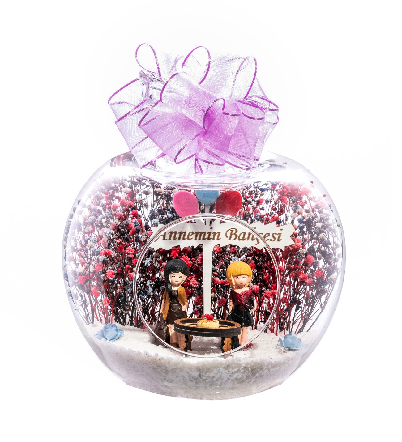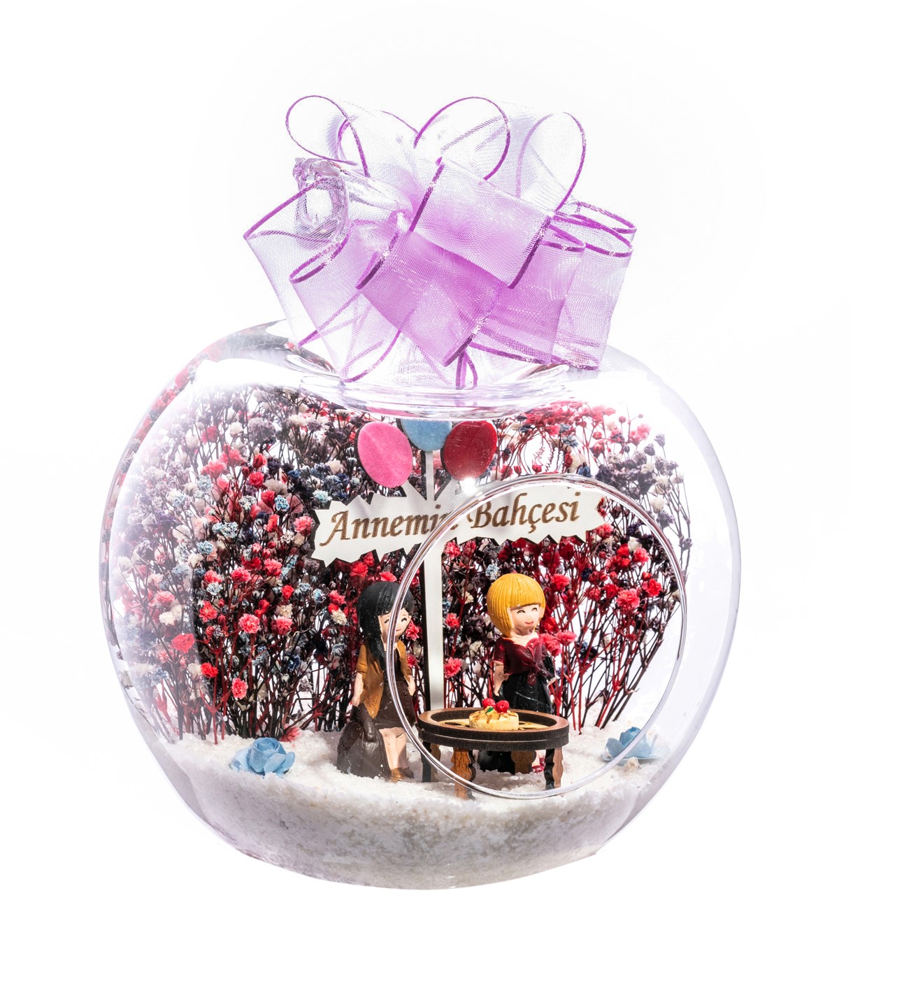 Küçük boy elma cam fanus içerisinde tasarladığımız bu kurdeleli güzel teraryum; beyaz kum, karışık renkli kurutulmuş bitkiler, renkli yapay mini güller, bir adet ahşap annemin bahçesi yazılı balonlu tabela, bir adet üzerinde turtasıyla sohbet masası ve iki adet genç kadını simgeleyen objeler kullanılarak tamamlanmıştır. Ev ve ofis ortamlarının tamamında sergilenebilir teraryumun içinde, kurutulmuş bitkiler bulunduğundan hava alması önemlidir. Açık olan kısmının kapatılmaması veya büfe vb. kapalı alanlara konulmaması gereklidir. Özellikle her ortamda yıllarca, zevkle izlenebilecek özel bir teraryumdur. Yaklaşık Ölçüleri: 20x20cm NOT: Teraryumlarda kullanılan camlar, üfleme cam işçiliğiyle üretildiğinden bazı detaylarda farklılıklar gözlenebilir. Örneğin, sap kısmı ve ağız bitiş noktalarının her biri kendine özgüdür.