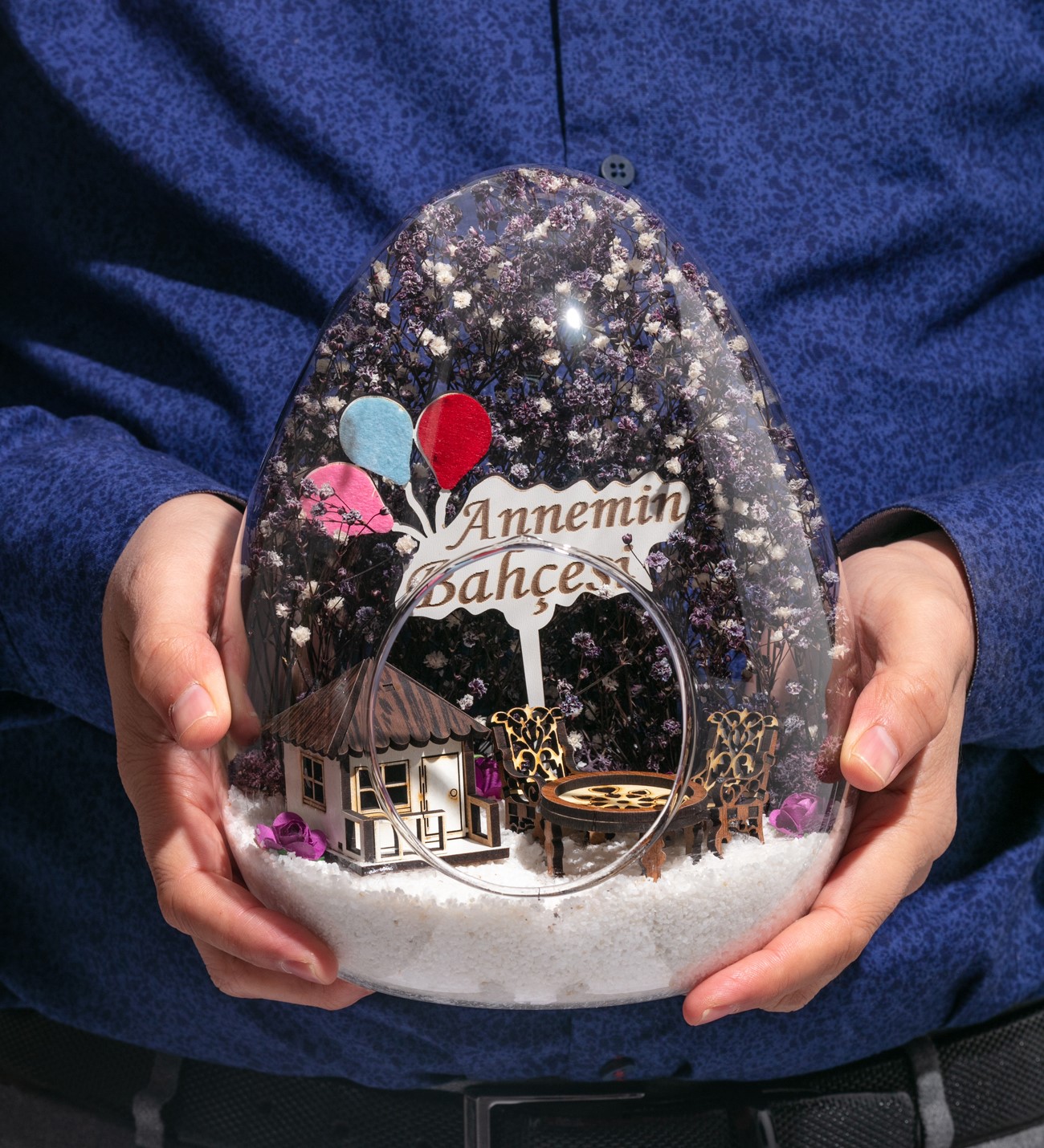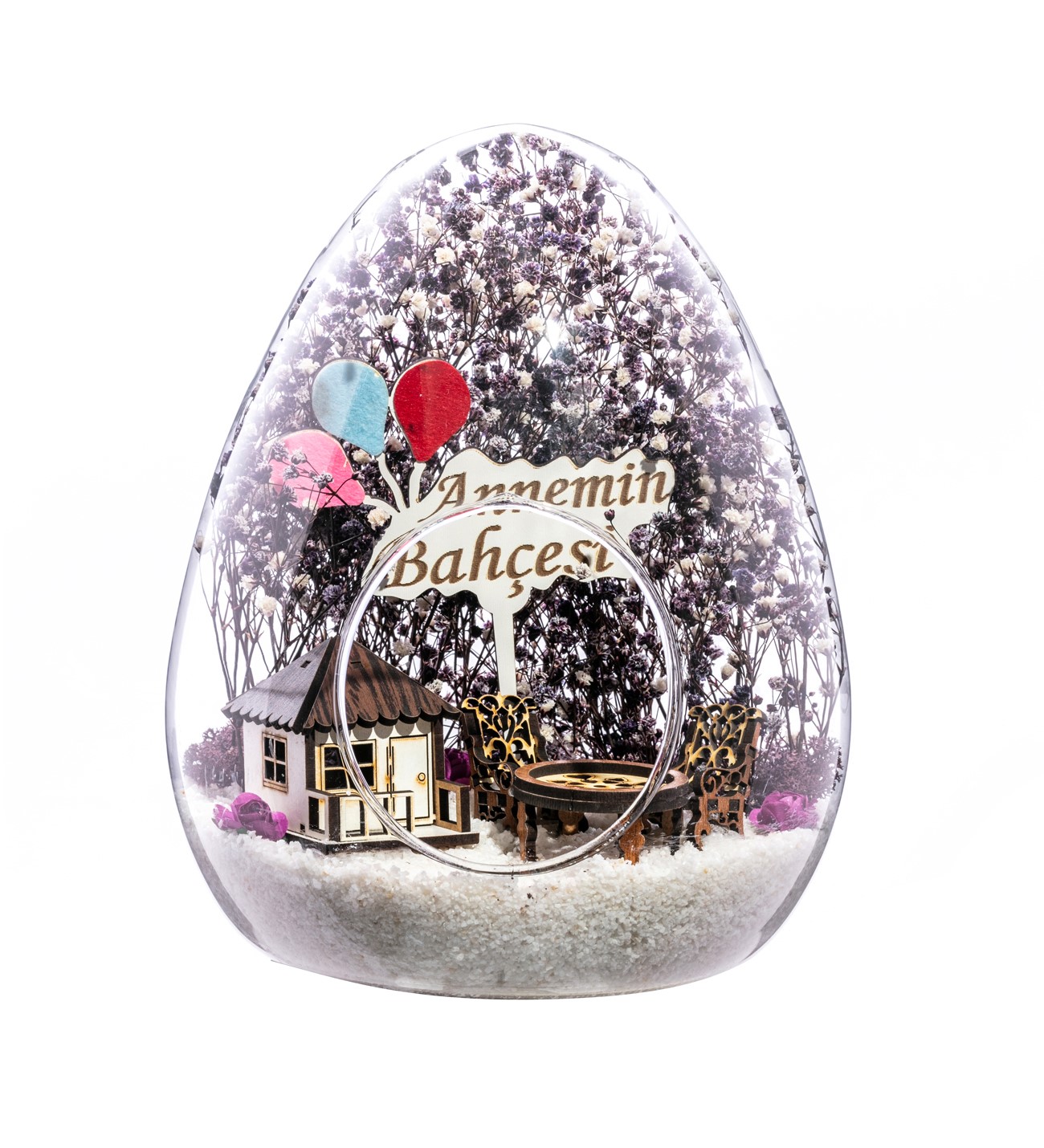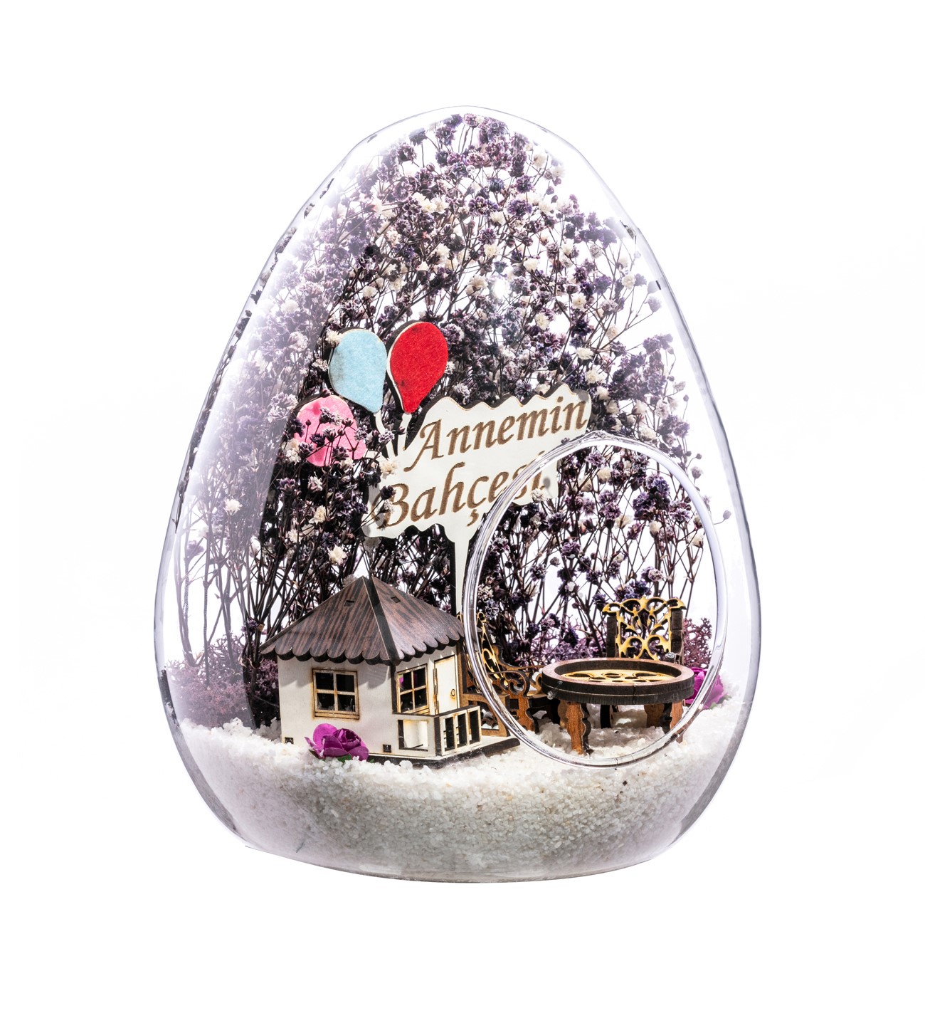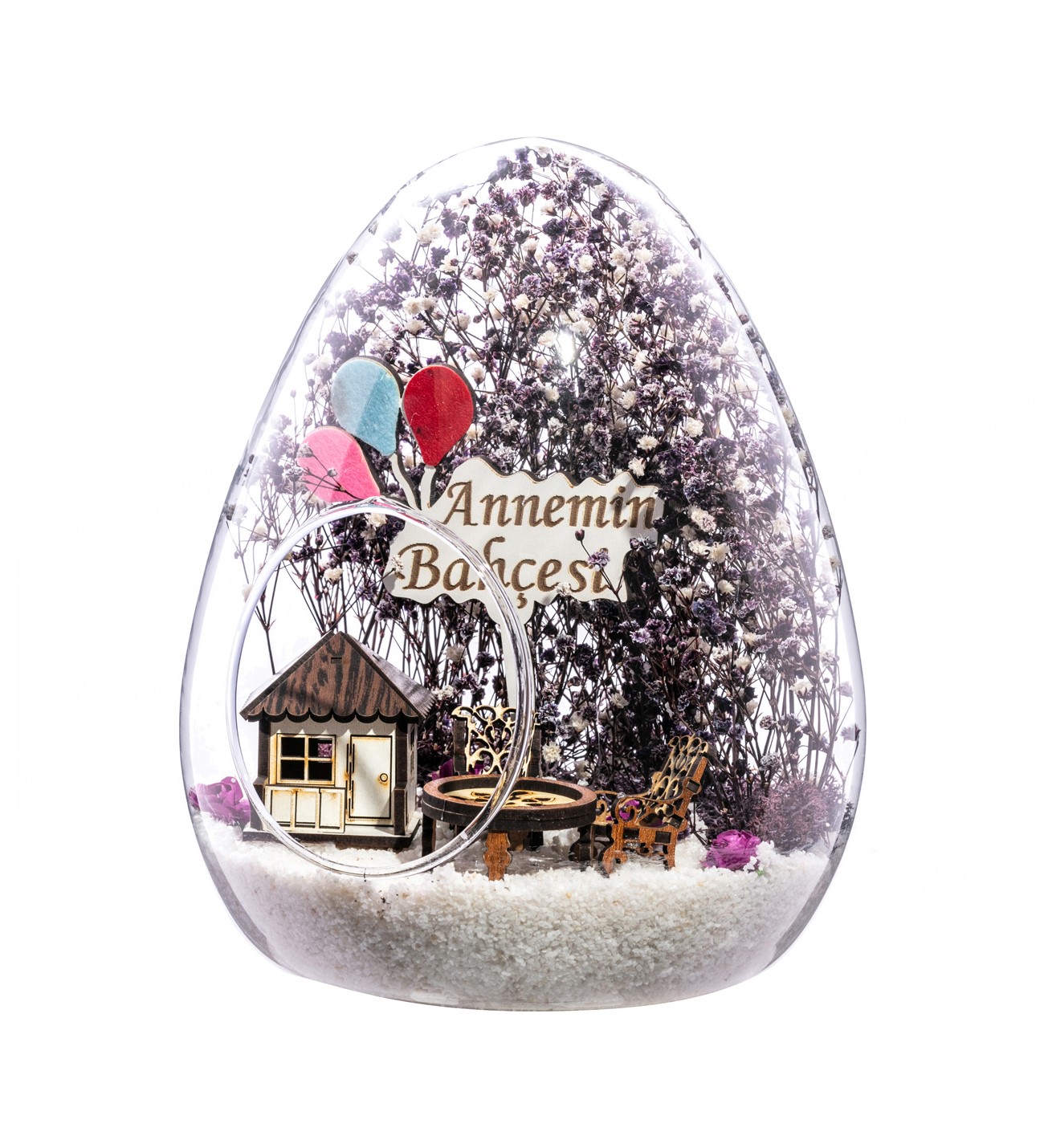 Küçük boy yumurta cam fanus içerisinde tasarladığımız teraryum; beyaz kum, kurutulmuş bitkiler, şoklanmış yosunlar, yapay mini güller, bir adet ahşap beyaz ev, bir adet ahşap annemin bahçesi yazılı balonlu tabela ve otantik ahşaptan bahçe mobilyalarını simgeleyen objelerle tamamlanmıştır. Ev ve ofis ortamlarının tamamında sergilenebilir teraryumun içinde canlı bitki bulunmadığından, herhangi bir bakıma ihtiyacı yoktur. Özellikle her ortamda yıllarca, zevkle izlenebilecek özel bir teraryumdur. Yaklaşık Ölçüleri: 18x22cm NOT: Teraryumlarda kullanılan camlar, üfleme cam işçiliğiyle üretildiğinden bazı detaylarda farklılıklar gözlenebilir. Örneğin, sap kısmı ve ağız bitiş noktalarının her biri kendine özgüdür.