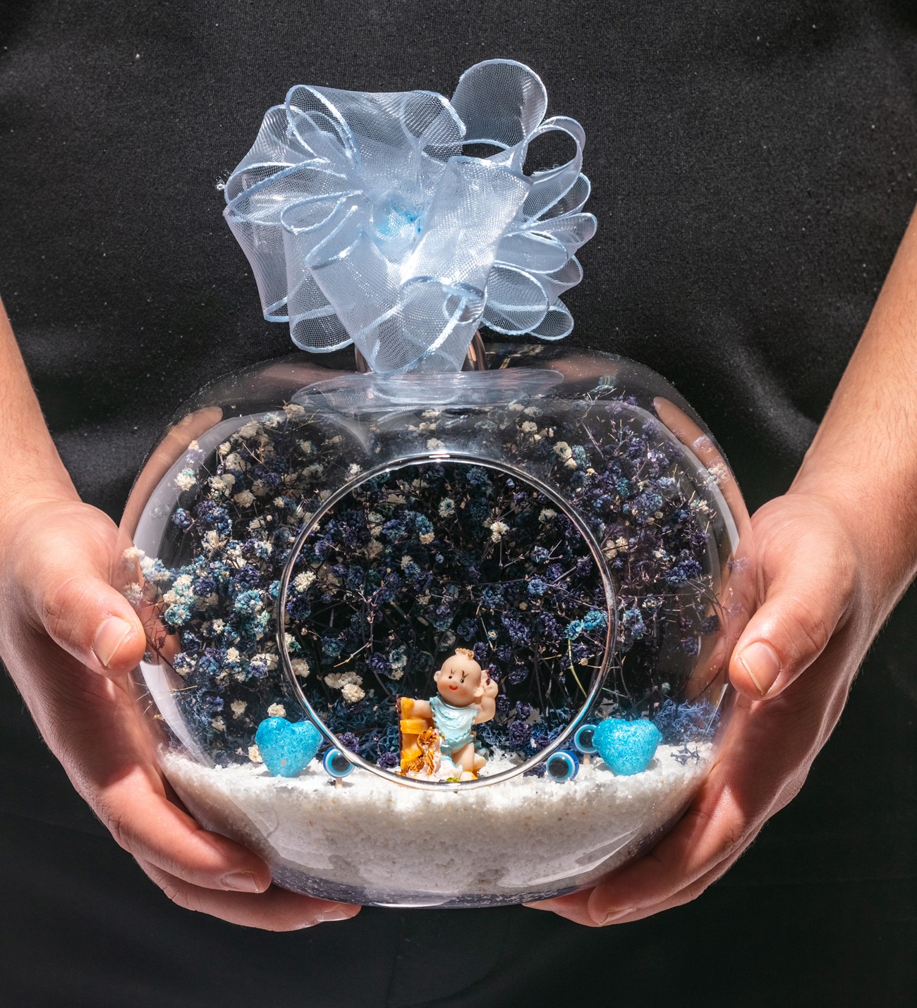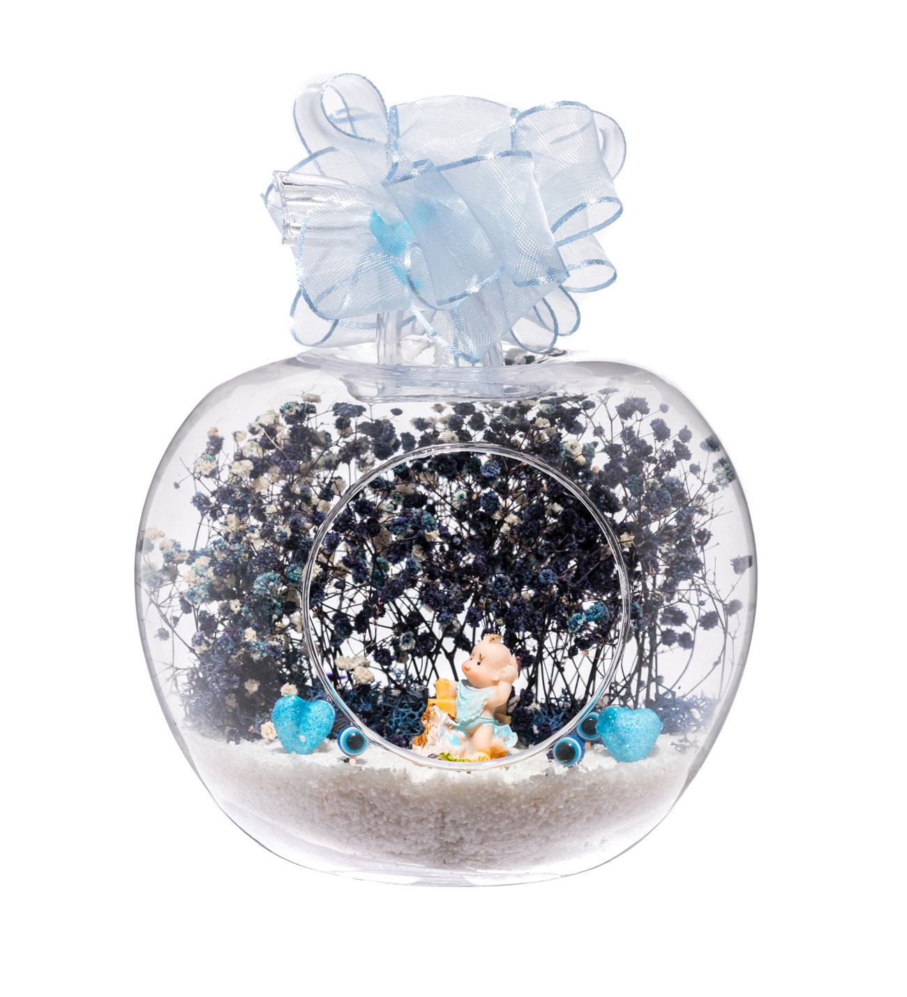 Kurdelesiyle şıklığı tamamlanmış, küçük boy elma cam fanus içerisinde tasarladığımız bu güzel teraryum; beyaz kum, kurutulmuş bitkiler, nazar boncukları, simli kalpler ve köpeğiyle oynayan erkek bebek objeyle beraber kurgulanmıştır. Ev ve ofis ortamlarının tamamında sergilenebilir teraryumun içinde, kurutulmuş bitkiler bulunduğundan hava alması önemlidir. Açık olan kısmının kapatılmaması veya büfe vb. kapalı alanlara konulmaması gereklidir. Özellikle her ortamda, zevkle izlenebilecek özel bir teraryumdur. Yaklaşık Ölçüleri: 20x20cm NOT: Teraryumlarda kullanılan camlar, üfleme cam işçiliğiyle üretildiğinden bazı detaylarda farklılıklar gözlenebilir. Örneğin, sap kısmı ve ağız bitiş noktalarının her biri kendine özgüdür.