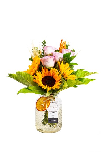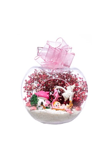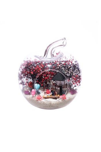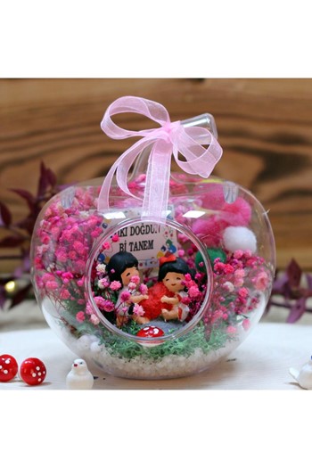 Kurdelesiyle şıklığı tamamlanmış küçük boy elma cam fanus içerisinde tasarladığımız bu güzel teraryum; beyaz kum, kurutulmuş bitkiler, yapay mini güller, bir adet HOŞGELDİN BEBEK yazılı ahşap balonlu tabela ve ponponlu bereli erkek bebek objeyle kurgulanmıştır. Ev ve ofis ortamlarının tamamında sergilenebilir teraryumun içinde, kurutulmuş bitkiler bulunduğundan hava alması önemlidir. Açık olan kısmının kapatılmaması veya büfe vb. kapalı alanlara konulmaması gereklidir. Özellikle her ortamda, zevkle izlenebilecek özel bir teraryumdur. Yaklaşık Ölçüleri: 20x20cm NOT: Teraryumlarda kullanılan camlar, üfleme cam işçiliğiyle üretildiğinden bazı detaylarda farklılıklar gözlenebilir. Örneğin, sap kısmı ve ağız bitiş noktalarının her biri kendine özgüdür.