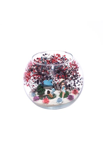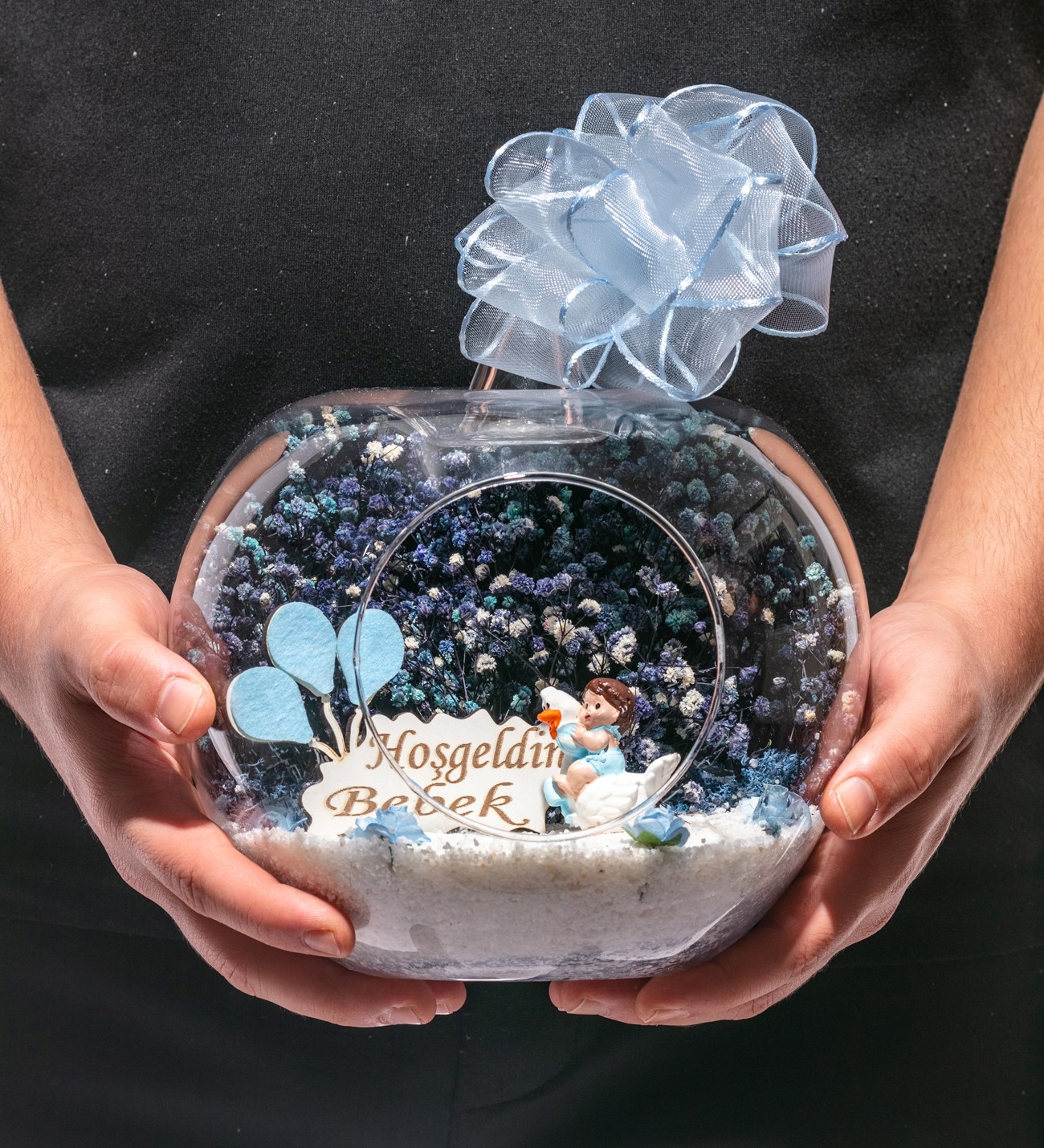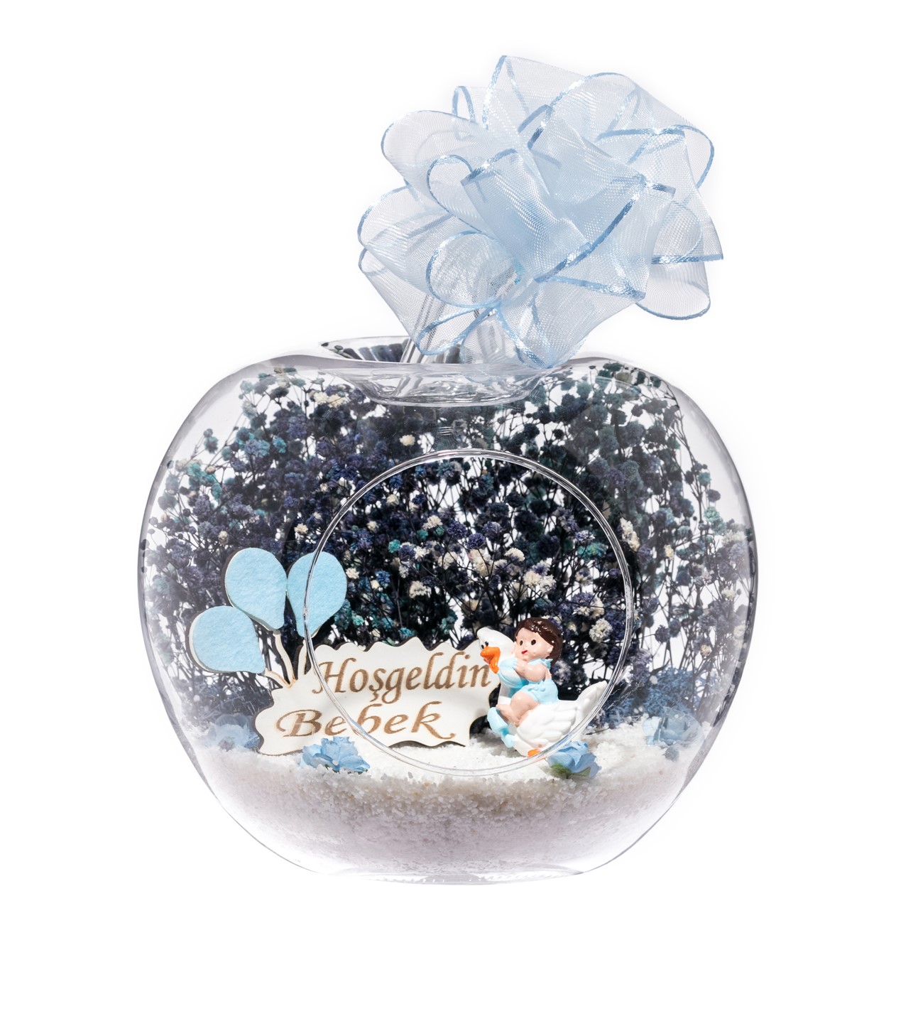Kurdelesiyle şıklığı tamamlanmış küçük boy elma cam fanus içerisinde tasarladığımız bu güzel teraryum; beyaz kum, kurutulmuş bitkiler, yapay mini güller, bir adet HOŞGELDİN BEBEK yazılı ahşap balonlu tabela ve şirin erkek bebek objeyle kurgulanmıştır. Ev ve ofis ortamlarının tamamında sergilenebilir teraryumun içinde, kurutulmuş bitkiler bulunduğundan hava alması önemlidir. Açık olan kısmının kapatılmaması veya büfe vb. kapalı alanlara konulmaması gereklidir. Özellikle her ortamda, zevkle izlenebilecek özel bir teraryumdur. Yaklaşık Ölçüleri: 20x20cm NOT: Teraryumlarda kullanılan camlar, üfleme cam işçiliğiyle üretildiğinden bazı detaylarda farklılıklar gözlenebilir. Örneğin, sap kısmı ve ağız bitiş noktalarının her biri kendine özgüdür.