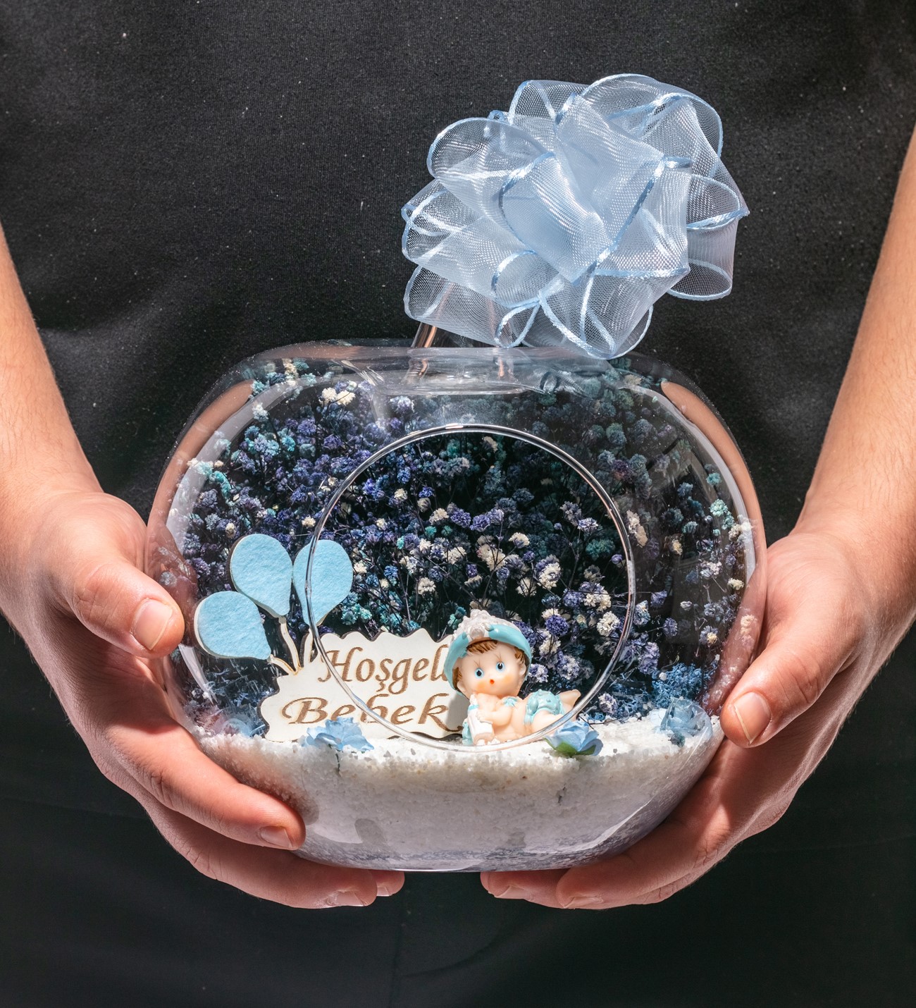 Kurdelesiyle şıklığı tamamlanmış küçük boy elma cam fanus içerisinde tasarladığımız bu güzel teraryum; beyaz kum, kurutulmuş bitkiler, yapay mini güller, bir adet HOŞGELDİN BEBEK yazılı ahşap balonlu tabela ve uzanmış erkek bebek objeyle kurgulanmıştır. Ev ve ofis ortamlarının tamamında sergilenebilir teraryumun içinde, kurutulmuş bitkiler bulunduğundan hava alması önemlidir. Açık olan kısmının kapatılmaması veya büfe vb. kapalı alanlara konulmaması gereklidir. Özellikle her ortamda, zevkle izlenebilecek özel bir teraryumdur. Yaklaşık Ölçüleri: 20x20cm NOT: Teraryumlarda kullanılan camlar, üfleme cam işçiliğiyle üretildiğinden bazı detaylarda farklılıklar gözlenebilir. Örneğin, sap kısmı ve ağız bitiş noktalarının her biri kendine özgüdür.