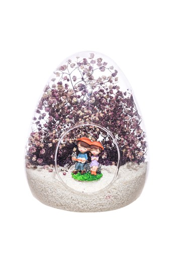 Kurdelesiyle şıklığı tamamlanmış, küçük boy elma cam fanus içerisinde tasarladığımız bu güzel teraryum; beyaz kum, kurutulmuş bitkiler, nazar boncukları, simli kalpler ve bereli kız bebek objeyle beraber kurgulanmıştır. Ev ve ofis ortamlarının tamamında sergilenebilir teraryumun içinde, kurutulmuş bitkiler bulunduğundan hava alması önemlidir. Açık olan kısmının kapatılmaması veya büfe vb. kapalı alanlara konulmaması gereklidir. Özellikle her ortamda, zevkle izlenebilecek özel bir teraryumdur. Yaklaşık Ölçüleri: 20x20cm NOT: Teraryumlarda kullanılan camlar, üfleme cam işçiliğiyle üretildiğinden bazı detaylarda farklılıklar gözlenebilir. Örneğin, sap kısmı ve ağız bitiş noktalarının her biri kendine özgüdür.