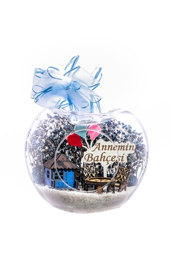 Kurdelesiyle şıklığı tamamlanmış, küçük boy elma cam fanus içerisinde tasarladığımız bu güzel teraryum; beyaz kum, kurutulmuş bitkiler, nazar boncukları, simli kalpler ve uzanmış kız bebek objeyle beraber kurgulanmıştır. Ev ve ofis ortamlarının tamamında sergilenebilir teraryumun içinde, kurutulmuş bitkiler bulunduğundan hava alması önemlidir. Açık olan kısmının kapatılmaması veya büfe vb. kapalı alanlara konulmaması gereklidir. Özellikle her ortamda, zevkle izlenebilecek özel bir teraryumdur. Yaklaşık Ölçüleri: 20x20cm NOT: Teraryumlarda kullanılan camlar, üfleme cam işçiliğiyle üretildiğinden bazı detaylarda farklılıklar gözlenebilir. Örneğin, sap kısmı ve ağız bitiş noktalarının her biri kendine özgüdür.