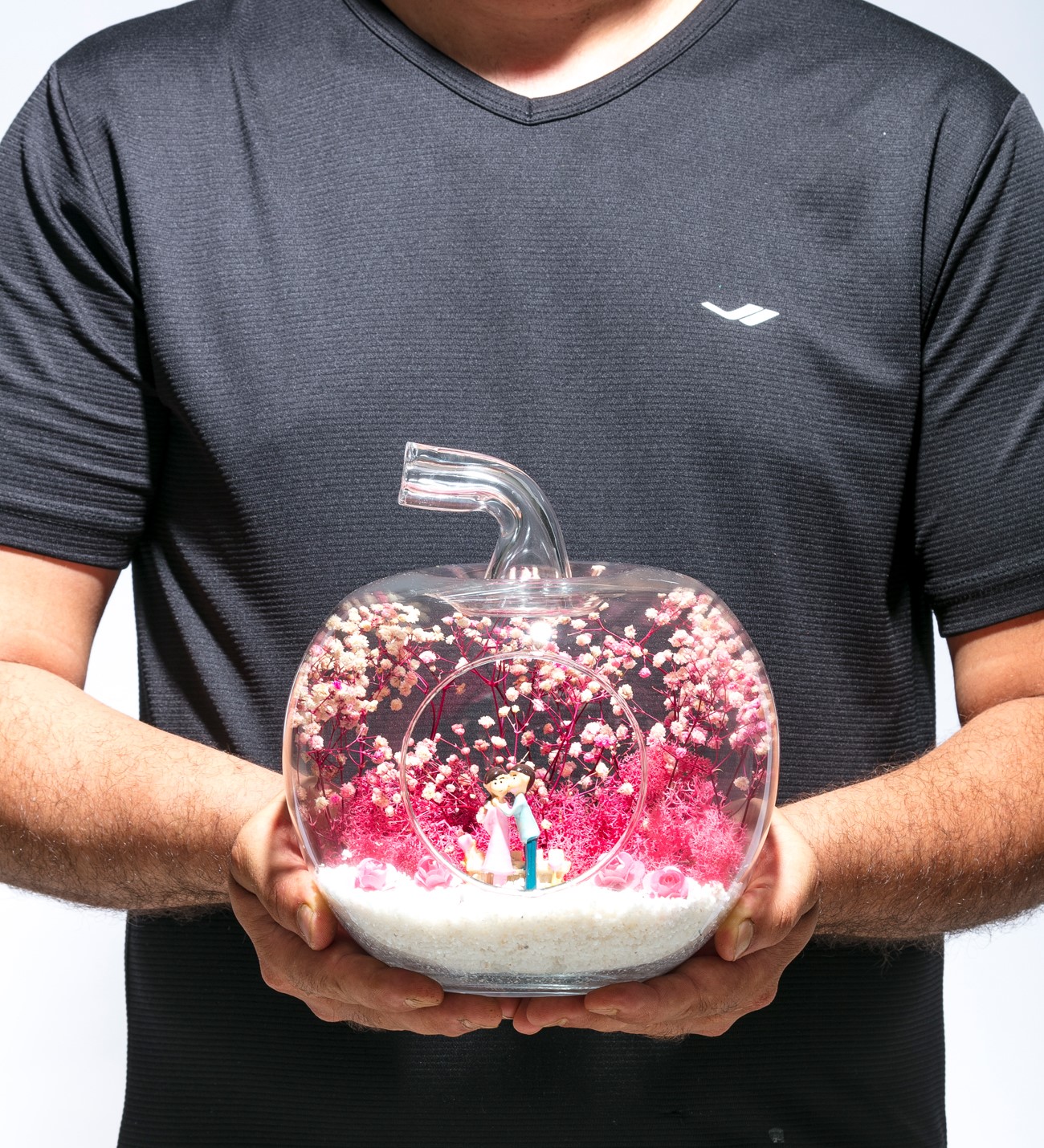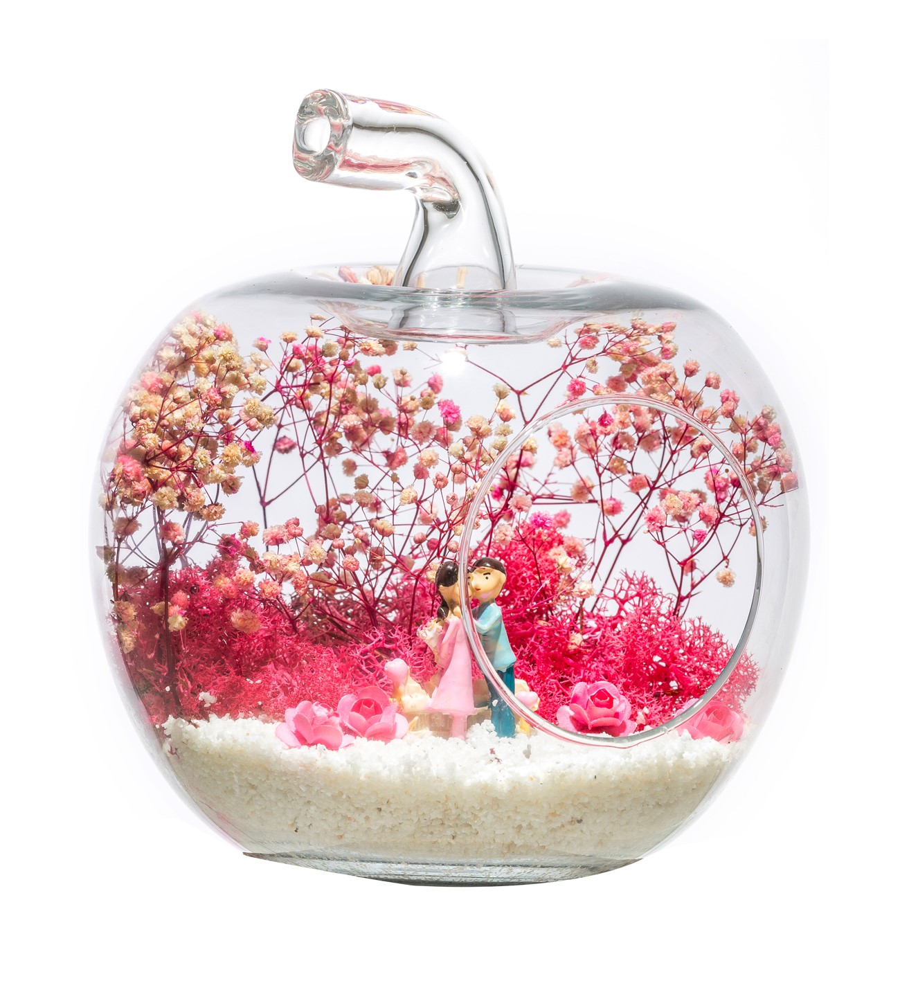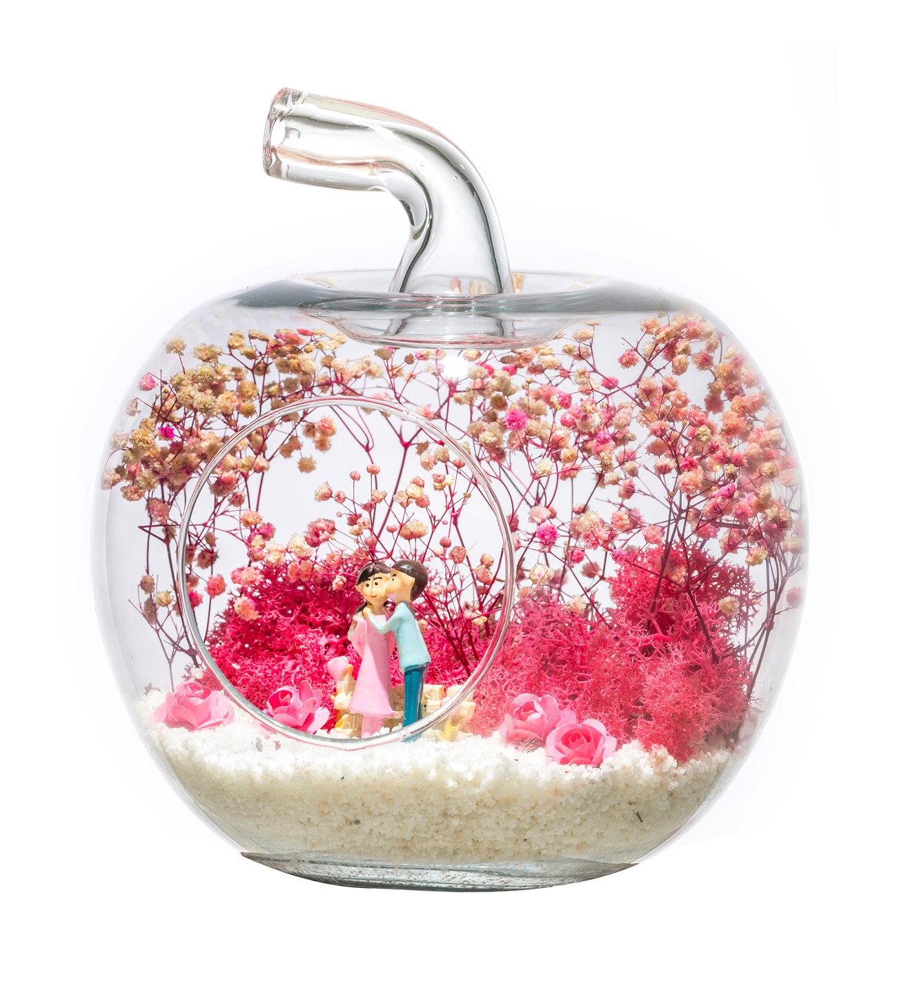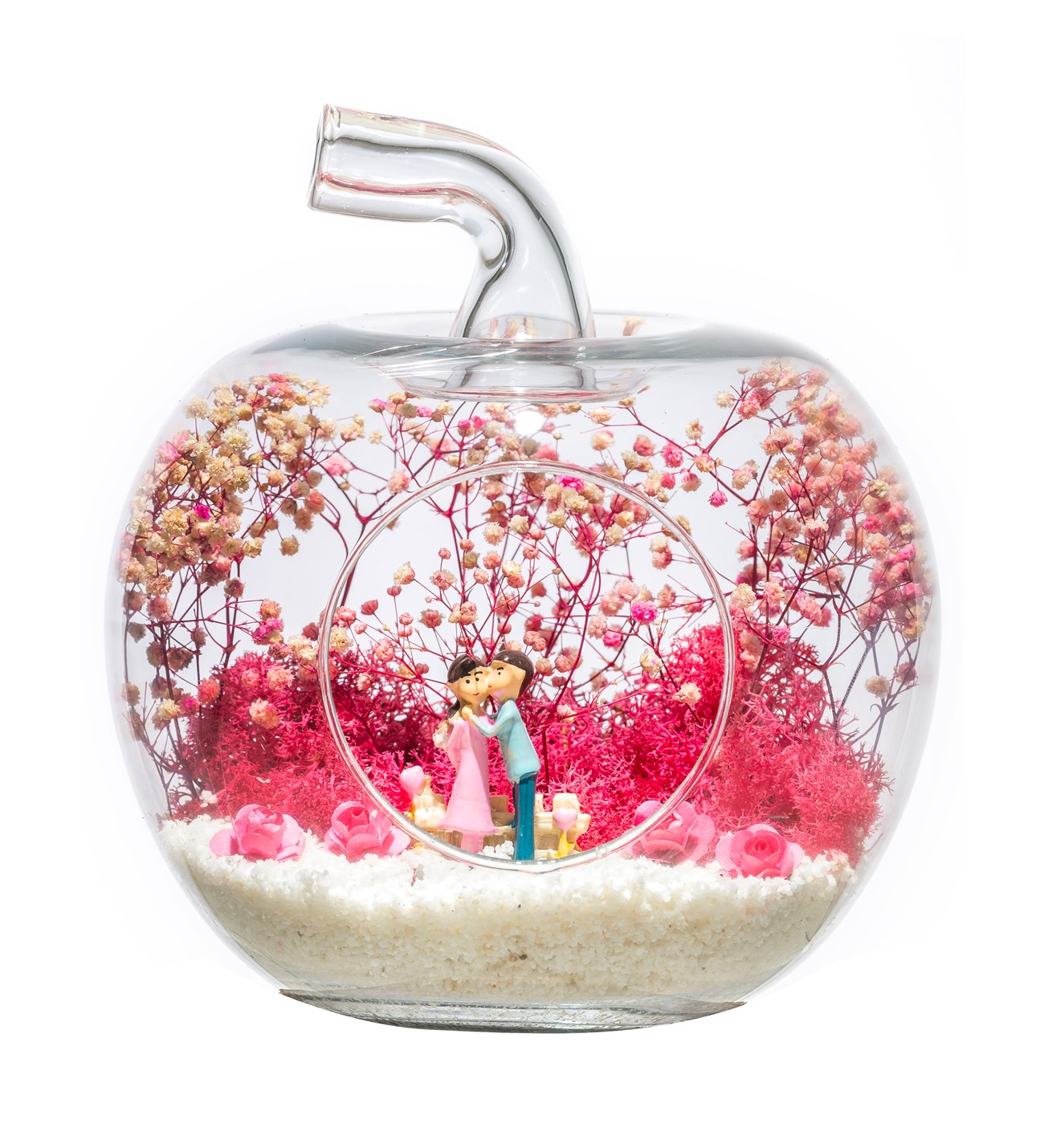 Küçük boy elma cam fanus içerisinde tasarladığımız bu teraryum, içerdiği anlam düşünülerek bakıldığında insanın içine huzur verecek şekilde tasarlandı. Tasarımımız; beyaz kum, şoklanmış yosunlar, yapay çiçekler, kurutulmuş bitkilerle beraber bir adet aşkın tadını çıkartan sevgililer görselleriyle tamamlanmıştır. Ev ve ofis ortamlarının tamamında sergilenebilir teraryumun içinde canlı bitki bulunmadığından, herhangi bir bakıma ihtiyacı yoktur. Özellikle her ortamda yıllarca, zevkle izlenebilecek çok özel bir teraryumdur. Yaklaşık Ölçüleri: 20x20cm