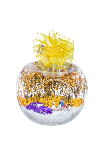 Küçük boy yumurta cam fanus içerisinde tasarladığımız bu güzel teraryum; beyaz kum, kurutulmuş bitkiler, şoklanmış yosunlar, yapay güller, bir adet pembe ahşap ev görseli, bir adet ışığı iki farklı renkte yanan led sokak lambası görseli ve bir adet motorsikletle yeni hayatlarına doğru yol alan aşıkları simgeleyen obje kullanılarak tamamlanmıştır. Ev ve ofis ortamlarının tamamında sergilenebilir teraryumun içinde, kurutulmuş ve şoklanmış bitkiler bulunduğundan hava alması önemlidir. Açık olan kısmının kapatılmaması veya büfe vb. kapalı alanlara konulmaması gereklidir. Özellikle her ortamda yıllarca, zevkle izlenebilecek özel bir teraryumdur. Yaklaşık Ölçüleri: 18x22cm NOT: Teraryumlarda kullanılan camlar, üfleme cam işçiliğiyle üretildiğinden bazı detaylarda farklılıklar gözlenebilir. Örneğin, yumurta şekli ve ağız bitiş noktalarının her biri kendine özgüdür.