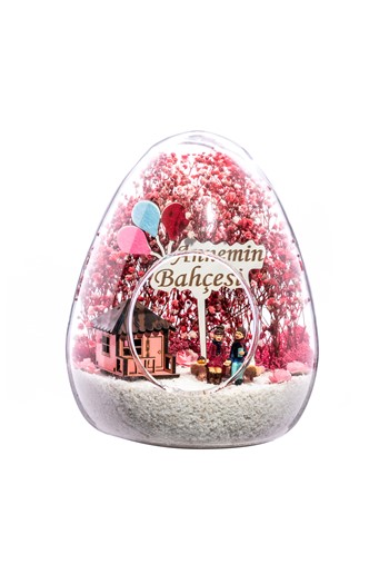 Küçük boy elma cam fanus içerisinde tasarladığımız bu çok özel teraryum, iddialı renkleriyle bulunduğu ortamı aydınlatacak ve izleyen herkese mutluluk dağıtacaktır. Tasarımımız; siyah kum, şoklanmış yosunlar, kurutulmuş bitkilerle beraber bir adet ışığı yanan lamba, bir adet solmayan gül ve sırt sırta yaslanarak oturmuş aşkın hazzını paylaşan sevgilileri simgeleyen objelerle tamamlanmıştır.