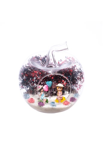 Küçük boy elma cam fanus içerisinde tasarladığımız bu güzel teraryum; beyaz kum, şoklanmış yosunlar, kurutulmuş bitkiler, yapay çiçekler, bir adet ahşap kırmızı ev, bir adet sırt sırta oturan çift, bir adet ışığı 2 farklı renkte yanan lamba ve üzerinde kurdelesiyle sizler için tasarlanmıştır. Ev ve ofis ortamlarının tamamında sergilenebilir teraryumun içinde canlı bitki bulunmadığından, herhangi bir bakıma ihtiyacı yoktur. Özellikle her ortamda yıllarca, zevkle izlenebilecek özel bir teraryumdur. Yaklaşık Ölçüleri: 20x20cm NOT: Teraryumlarda kullanılan camlar, üfleme cam işçiliğiyle üretildiğinden bazı detaylarda farklılıklar gözlenebilir. Örneğin, sap kısmı ve ağız bitiş noktalarının her biri kendine özgüdür.