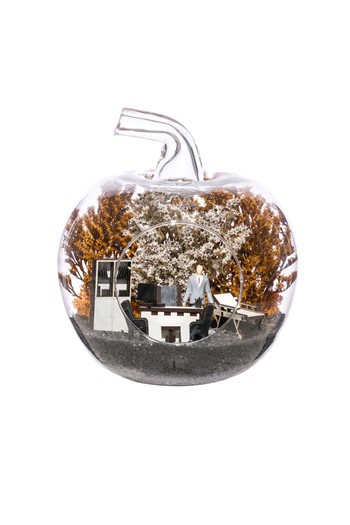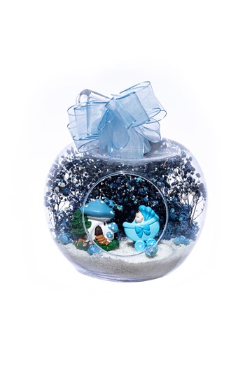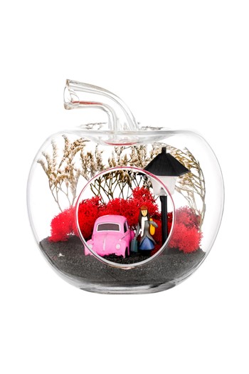 Küçük boy elma cam fanus içerisinde tasarladığımız bu anlamlı teraryum; beyaz kum, kurutulmuş bitkiler, şoklanmış yosunlar, yapay mini güller, bir adet ahşap yeşil ev ve bahçelerinde yan yana oturmuş keyifle sohbet eden aşıkları simgeleyen objeler kullanılarak tamamlanmıştır. Ev ve ofis ortamlarının tamamında sergilenebilir teraryumun içinde, kurutulmuş ve şoklanmış bitkiler bulunduğundan hava alması önemlidir. Açık olan kısmının kapatılmaması veya büfe vb. kapalı alanlara konulmaması gereklidir. Özellikle her ortamda yıllarca, zevkle izlenebilecek özel bir teraryumdur. Yaklaşık Ölçüleri: 20x20cm NOT: Teraryumlarda kullanılan camlar, üfleme cam işçiliğiyle üretildiğinden bazı detaylarda farklılıklar gözlenebilir. Örneğin, sap kısmı ve ağız bitiş noktalarının her biri kendine özgüdür.