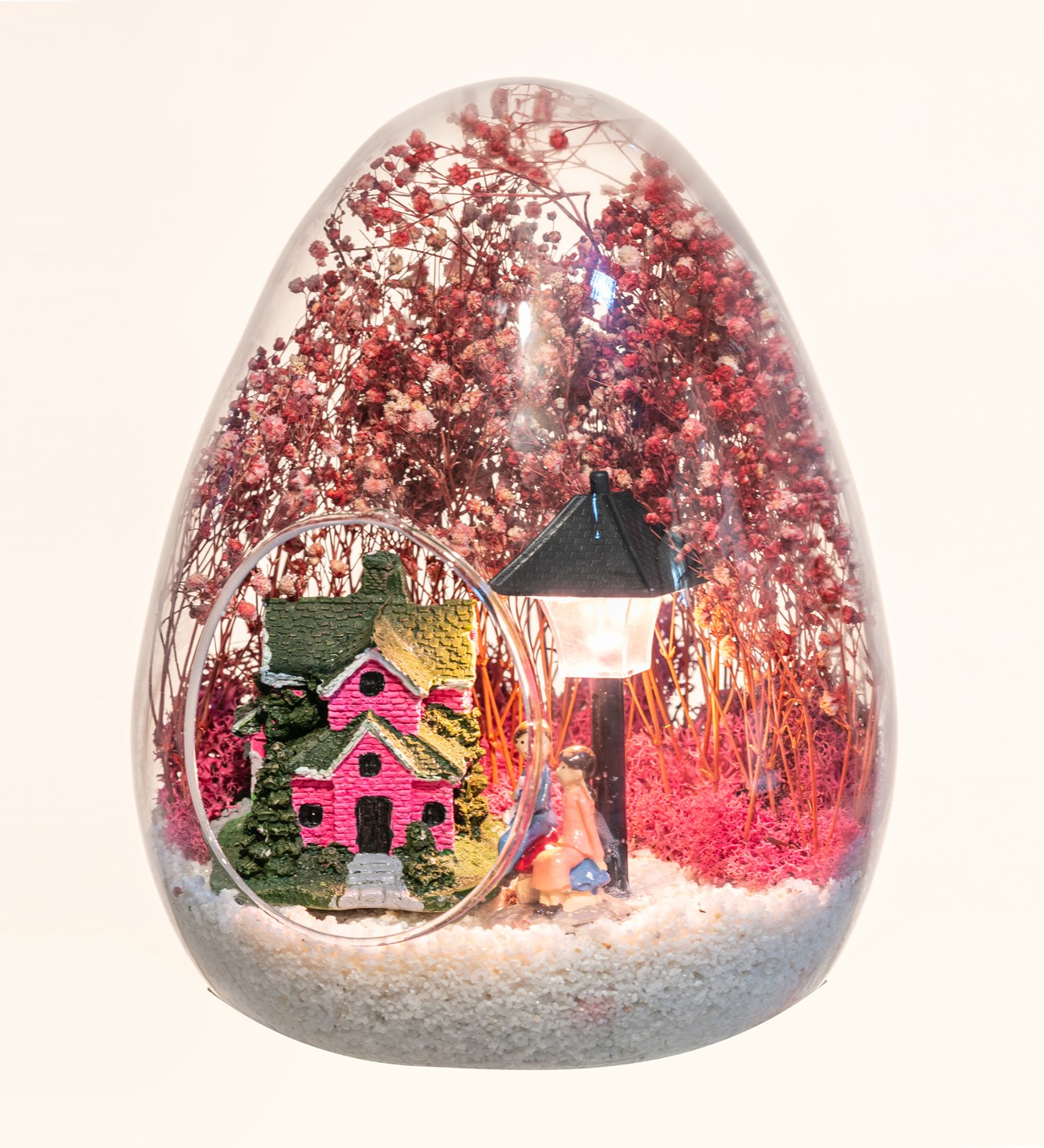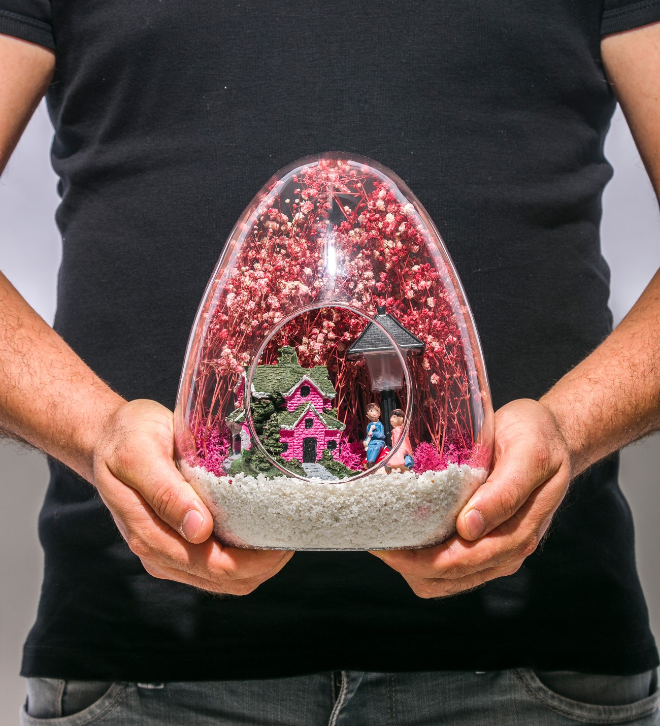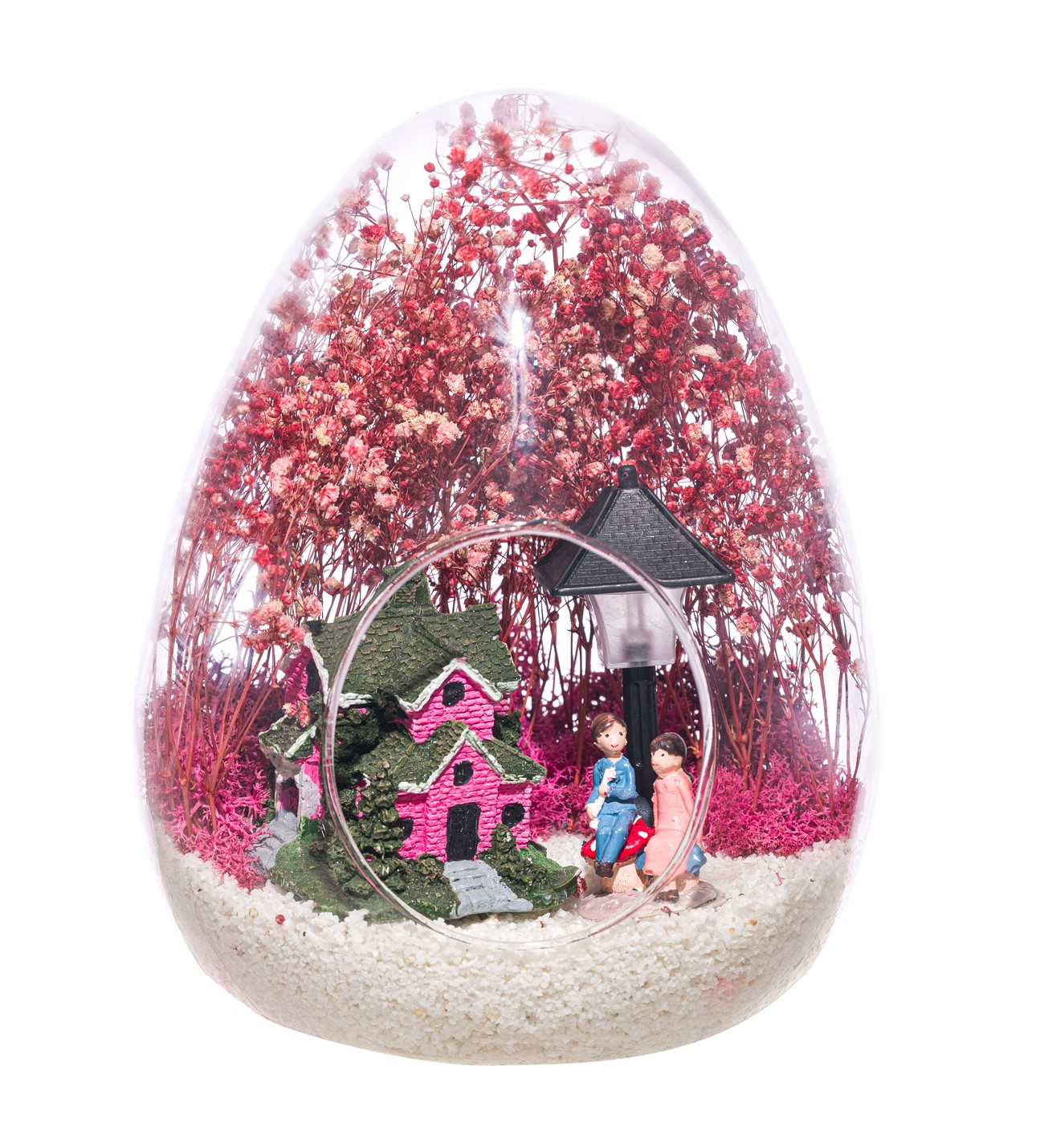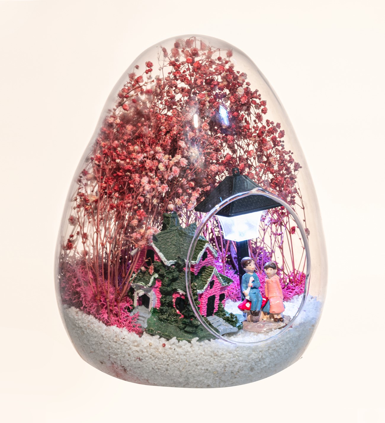 Küçük boy yumurta cam fanus içerisinde tasarladığımız bu güzel teraryum; beyaz kum, kurutulmuş bitkiler, şoklanmış yosunlar, bir adet taş ev, bir adet ışığı iki farklı renkte yanan lamba ve yan yana aşklarının senfonisini dinleyen iki yetişkin görselleriyle tamamlanmıştır. Ev ve ofis ortamlarının tamamında sergilenebilir teraryumun içinde, kurutulmuş ve şoklanmış bitkiler bulunduğundan hava alması önemlidir. Açık olan kısmının kapatılmaması veya büfe vb. kapalı alanlara konulmaması gereklidir. Özellikle her ortamda yıllarca, zevkle izlenebilecek özel bir teraryumdur. Yaklaşık Ölçüleri: 18x22cm NOT: Teraryumlarda kullanılan camlar, üfleme cam işçiliğiyle üretildiğinden bazı detaylarda farklılıklar gözlenebilir. Örneğin, sap kısmı ve ağız bitiş noktalarının her biri kendine özgüdür.