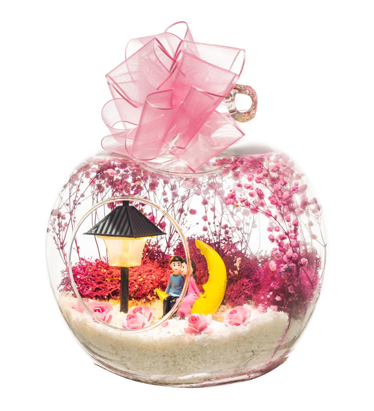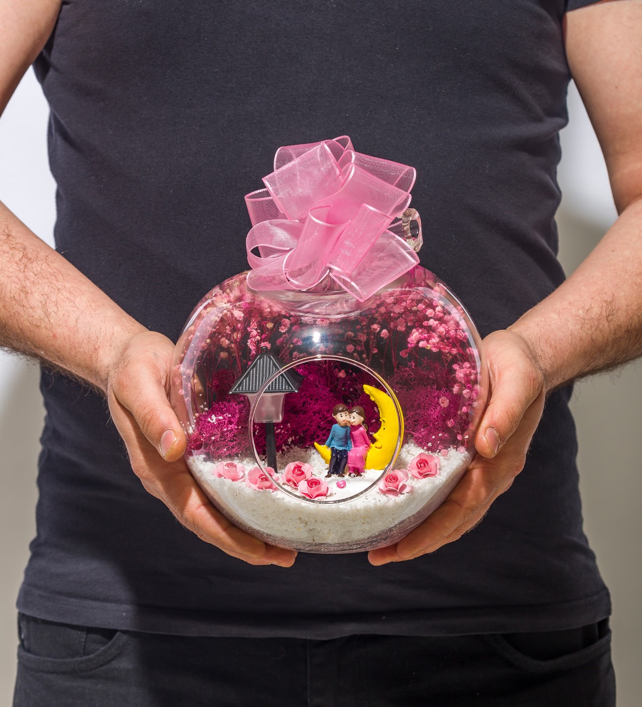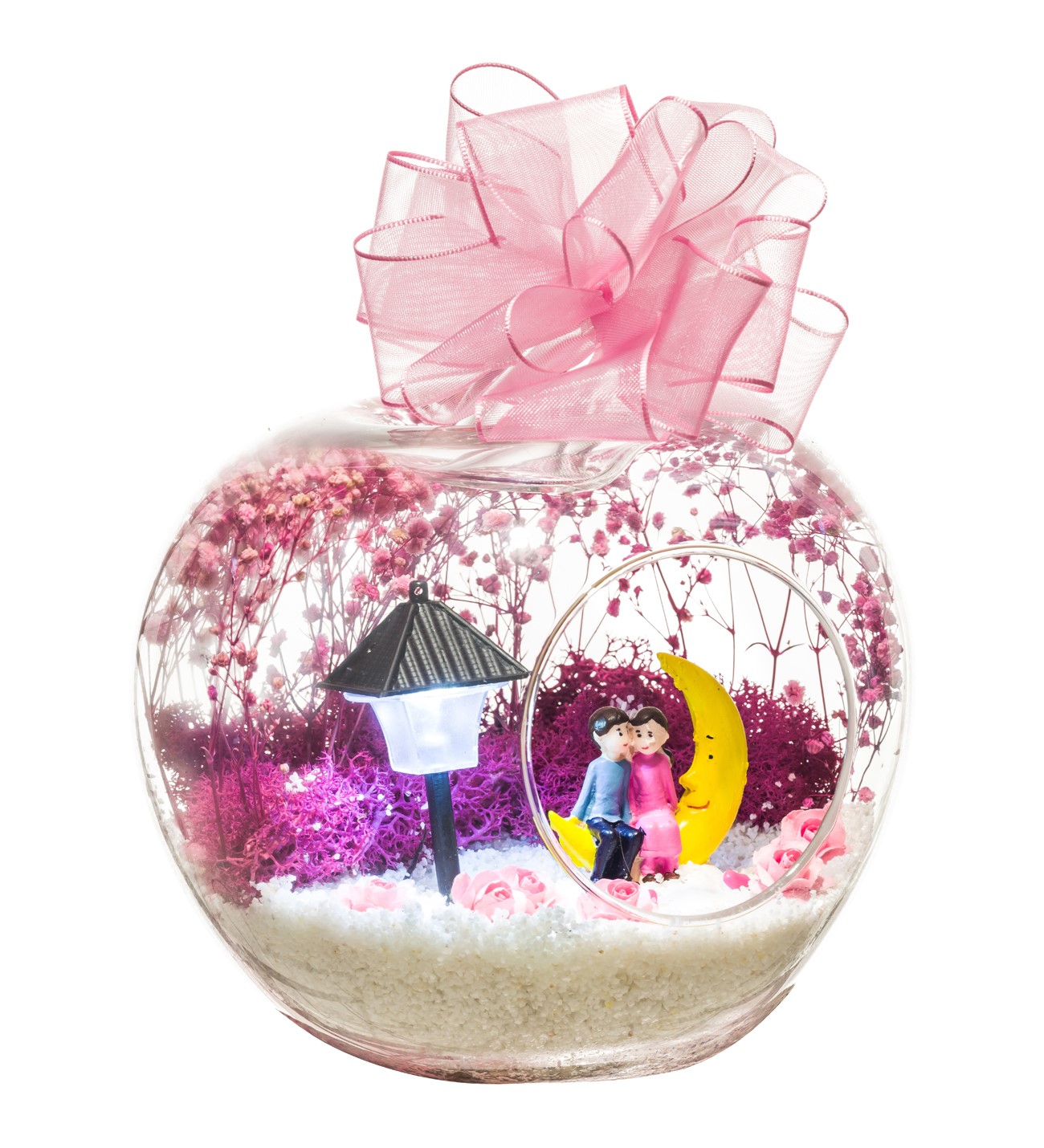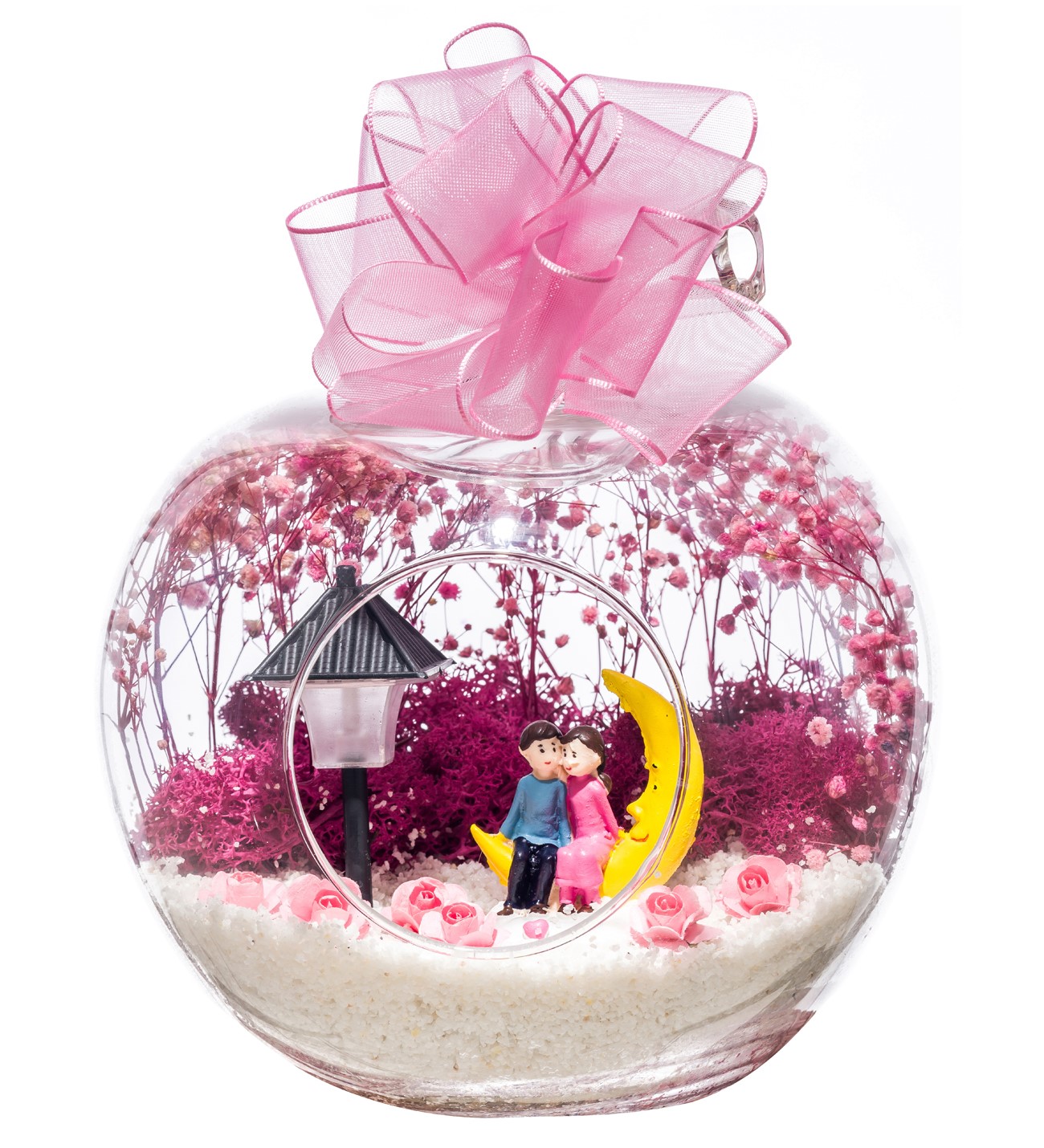Küçük boy elma cam fanus içerisinde tasarladığımız bu, pembe kurdeleyle hediye paketi görünümü kazanmış özel teraryum; beyaz kum, şoklanmış yosunlar, kurutulmuş bitkiler ve çiçekler, bir adet ışığı 2 farklı renkte yanan lamba, bir adet hayallerinde ay üzerinde yan yana oturmuş sohbet eden sevgilileri simgeleyen objelerle tamamlanmıştır. Ev ve ofis ortamlarının tamamında sergilenebilir teraryumun içinde canlı bitki bulunmadığından, herhangi bir bakıma ihtiyacı yoktur. Özellikle her ortamda yıllarca, zevkle izlenebilecek özel bir teraryumdur. Yaklaşık Ölçüleri: 20x20cm NOT: Teraryumlarda kullanılan camlar, üfleme cam işçiliğiyle üretildiğinden bazı detaylarda farklılıklar gözlenebilir. Örneğin, sap kısmı ve ağız bitiş noktalarının her biri kendine özgüdür.