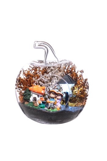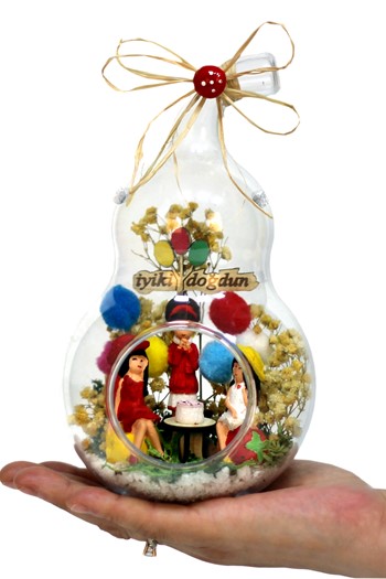 Orta boy açık cam fanus içerisinde hazırlanan, isminin hakkını veren bu özgün teraryum; beyaz kum, karışık renkli kurutulmuş bitkiler, üzerinde renkli balonlarıyla bir adet taş ev, bir adet ışığı iki farklı renkte yanan led lamba, bir adet üzerinde bir çiftle ahşap köprü ve evin bahçesinde oynayan iki adet çocuğu simgeleyen objeler ile birlikte kurgulanmıştır. Ev ve ofis ortamlarının tamamında sergilenebilir teraryumun içinde, kurutulmuş ve şoklanmış bitkiler bulunduğundan hava alması önemlidir. Açık olan kısmının kapatılmaması veya büfe vb. kapalı alanlara konulmaması gereklidir. Özellikle her ortamda yıllarca, zevkle izlenebilecek özel bir teraryumdur. Yaklaşık Ölçüler: 19x23 cm'dir.