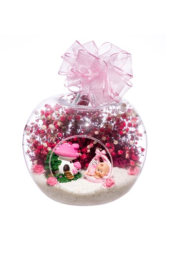 Orta boy açık cam fanus içerisinde hazırlanan, isminin hakkını veren bu özgün teraryum; beyaz kum, karışık renkli kurutulmuş bitkiler, renkli mini yapay güller, renkli simli kalpler, üzerinde renkli balonlarıyla bir adet taş ev, bir adet ışığı iki farklı renkte yanan led lamba ve bir adet genç kız objeler ile birlikte kurgulanmıştır. Ev ve ofis ortamlarının tamamında sergilenebilir teraryumun içinde, kurutulmuş ve şoklanmış bitkiler bulunduğundan hava alması önemlidir. Açık olan kısmının kapatılmaması veya büfe vb. kapalı alanlara konulmaması gereklidir. Özellikle her ortamda yıllarca, zevkle izlenebilecek özel bir teraryumdur. Yaklaşık Ölçüler: 19x23 cm'dir.