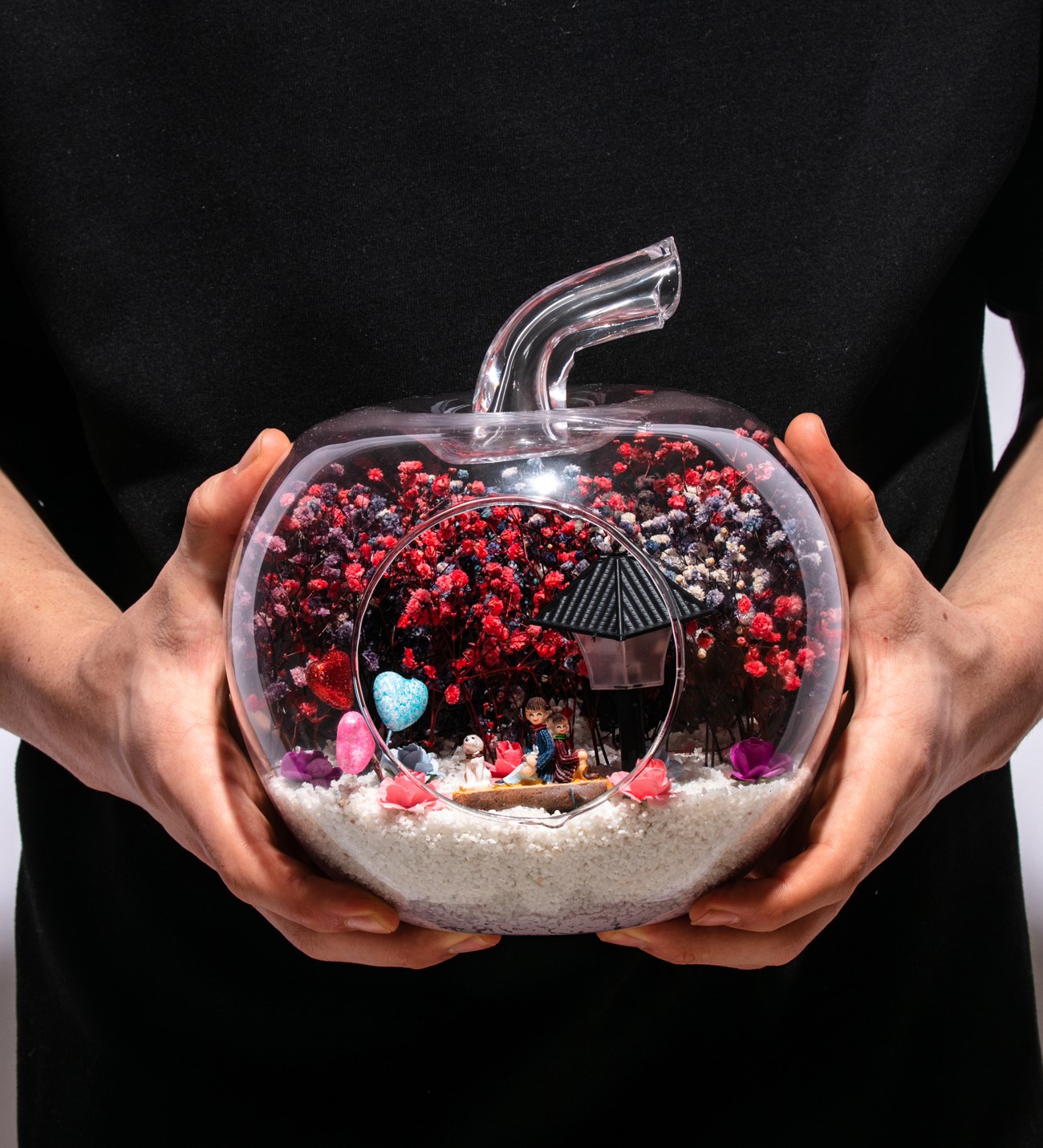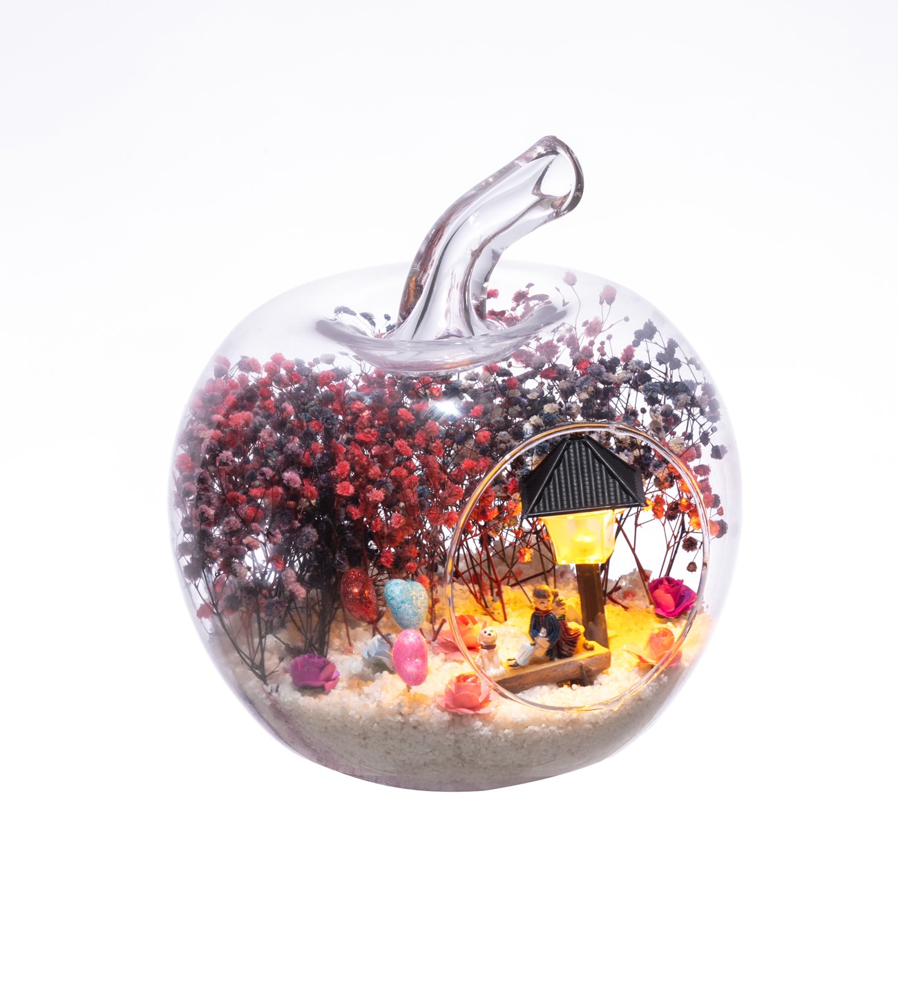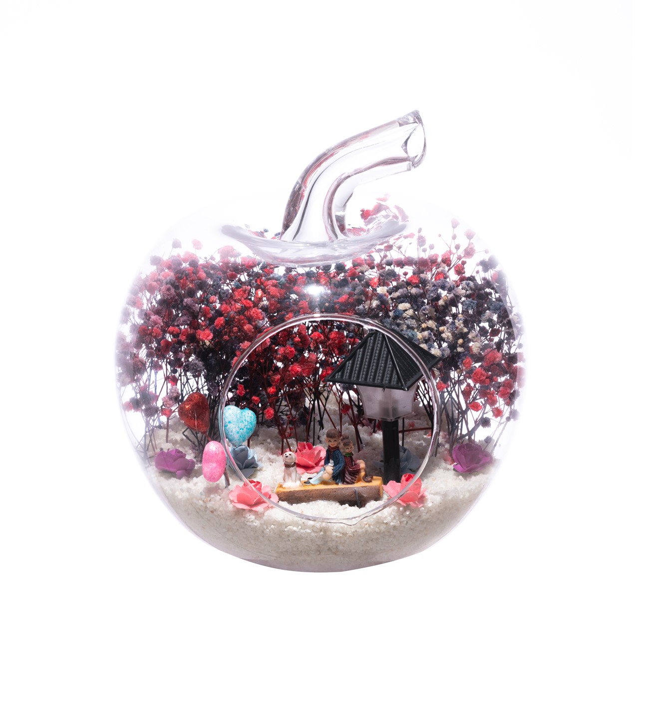 Küçük boy elma cam fanus içerisinde tasarladığımız bu çok güzel teraryum; beyaz kum, karışık renkli kurutulmuş bitkiler, renkli yapay mini güller, renkli simli kalpler, bir adet ışığı iki farklı renkte yanan led lamba ve bankta sırt sırta oturmuş, anı paylaşan aşıkları simgeleyen objeler kullanılarak tamamlanmıştır. Ev ve ofis ortamlarının tamamında sergilenebilir teraryumun içinde, kurutulmuş bitkiler bulunduğundan hava alması önemlidir. Açık olan kısmının kapatılmaması veya büfe vb. kapalı alanlara konulmaması gereklidir. Özellikle her ortamda yıllarca, zevkle izlenebilecek özel bir teraryumdur. Yaklaşık Ölçüleri: 20x20cm NOT: Teraryumlarda kullanılan camlar, üfleme cam işçiliğiyle üretildiğinden bazı detaylarda farklılıklar gözlenebilir. Örneğin, sap kısmı ve ağız bitiş noktalarının her biri kendine özgüdür.