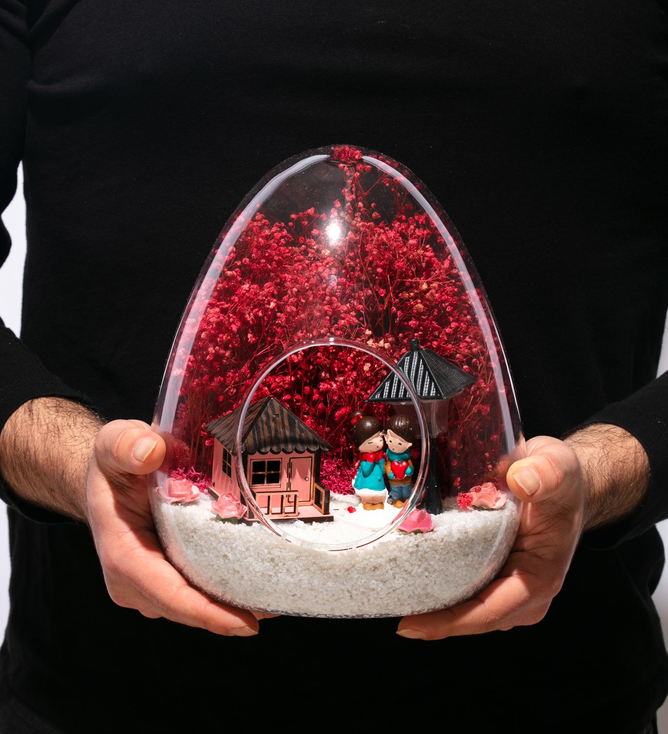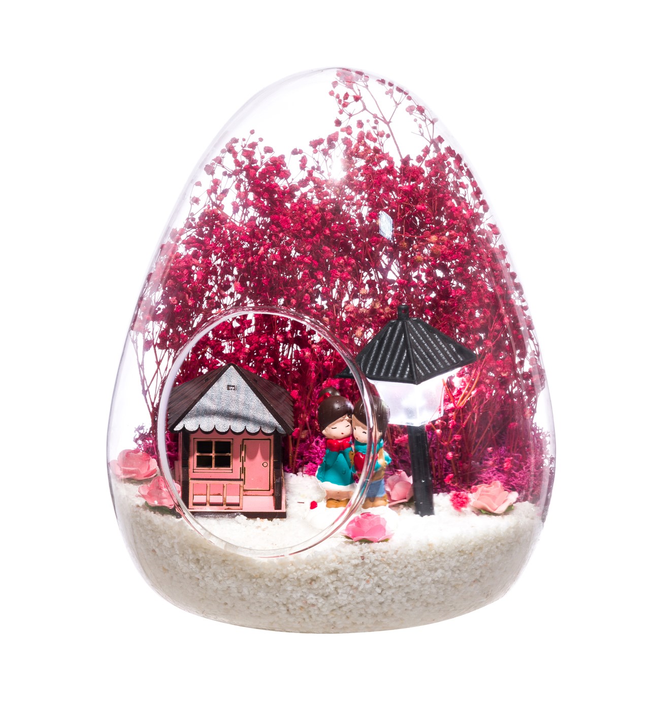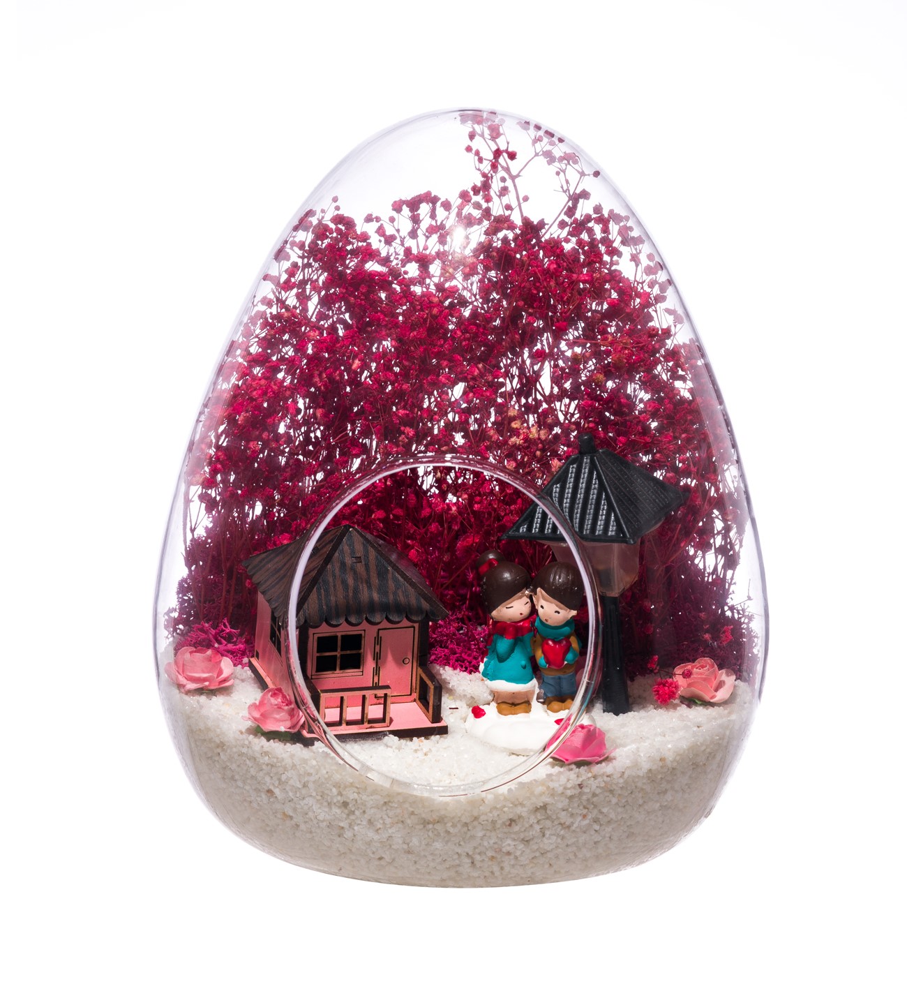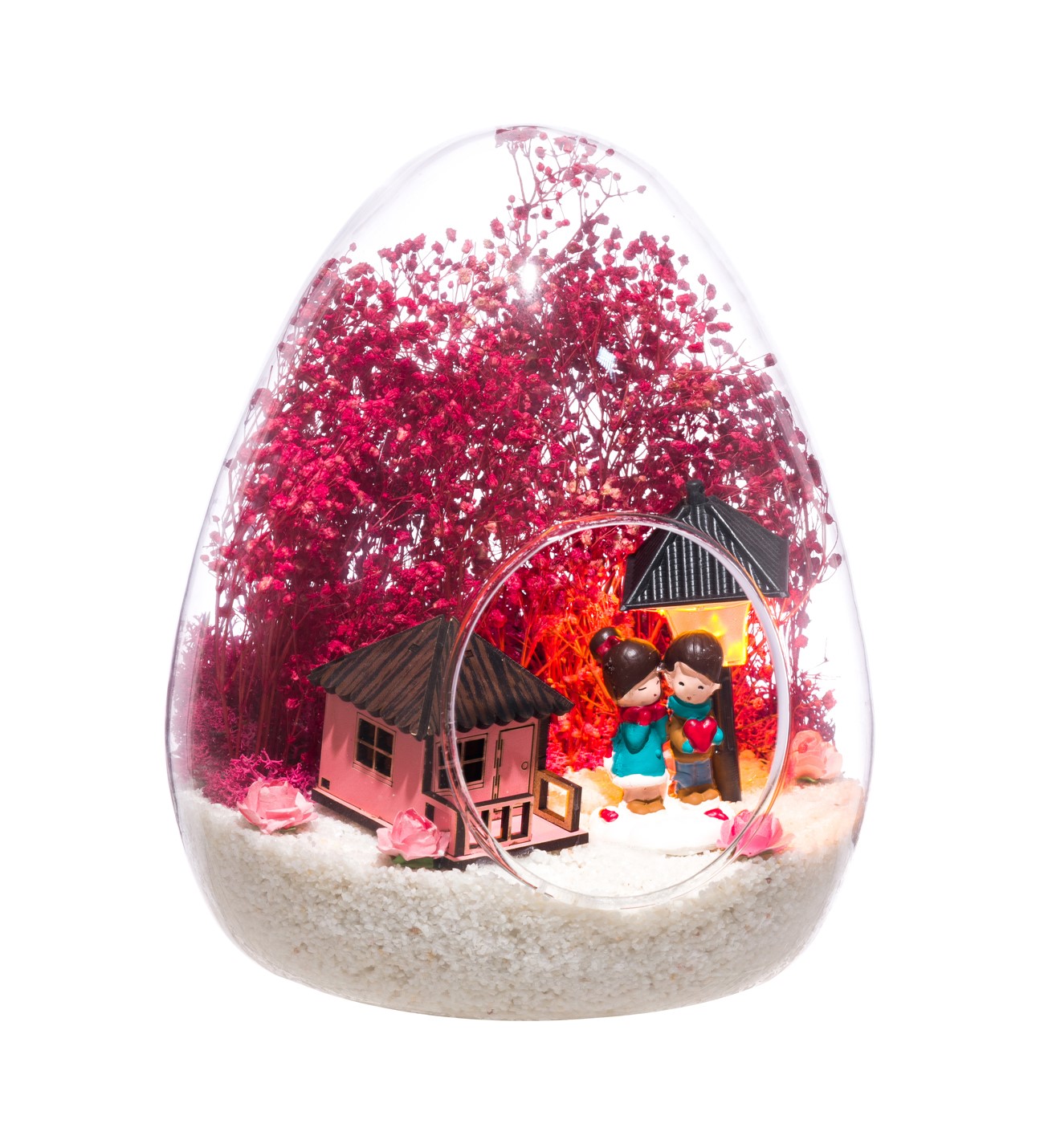 Küçük boy yumurta cam fanus içerisinde tasarladığımız bu güzel teraryum; beyaz kum, kurutulmuş bitkiler, şoklanmış yosunlar, yapay güller, bir adet pembe ahşap ev görseli, bir adet ışığı iki farklı renkte yanan led sokak lambası görseli ve bir adet yan yana sohbet eden sevgilileri simgeleyen obje kullanılarak tamamlanmıştır. Ev ve ofis ortamlarının tamamında sergilenebilir teraryumun içinde, kurutulmuş ve şoklanmış bitkiler bulunduğundan hava alması önemlidir. Açık olan kısmının kapatılmaması veya büfe vb. kapalı alanlara konulmaması gereklidir. Özellikle her ortamda yıllarca, zevkle izlenebilecek özel bir teraryumdur. Yaklaşık Ölçüleri: 18x22cm NOT: Teraryumlarda kullanılan camlar, üfleme cam işçiliğiyle üretildiğinden bazı detaylarda farklılıklar gözlenebilir. Örneğin, yumurta şekli ve ağız bitiş noktalarının her biri kendine özgüdür.
