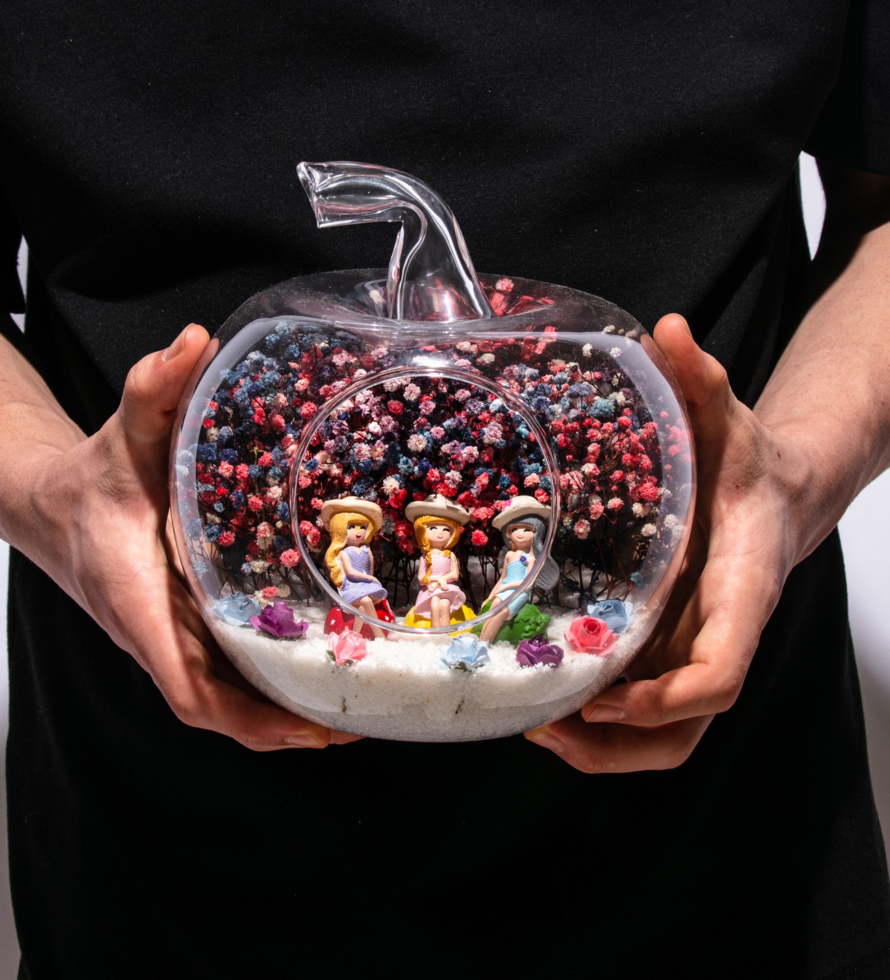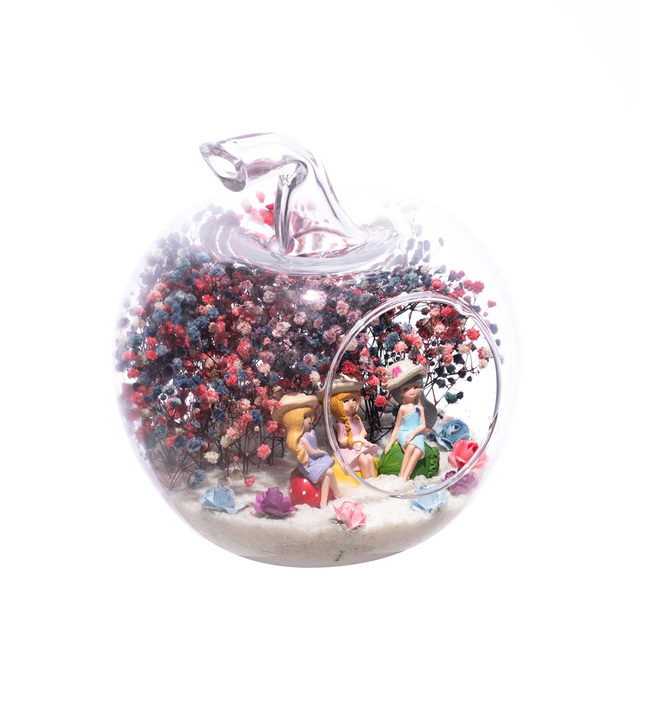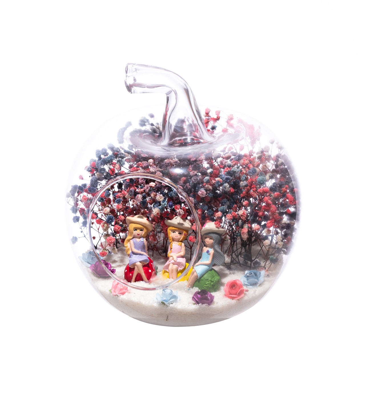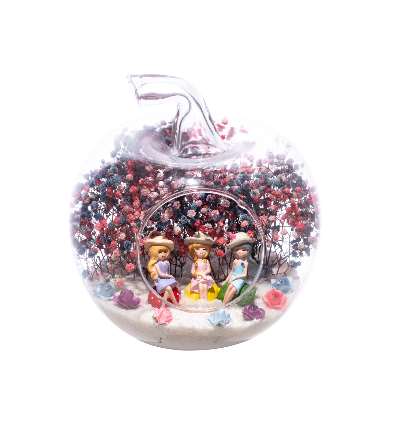 Küçük boy elma cam fanus içerisinde tasarladığımız bu çok güzel teraryum; beyaz kum, karışık renkli kurutulmuş bitkiler, renkli mini yapay güller ve beraber oturmuş sohbet eden üç adet genç kızı simgeleyen objeler kullanılarak tamamlanmıştır. Ev ve ofis ortamlarının tamamında sergilenebilir teraryumun içinde, kurutulmuş bitkiler bulunduğundan hava alması önemlidir. Açık olan kısmının kapatılmaması veya büfe vb. kapalı alanlara konulmaması gereklidir. Özellikle her ortamda yıllarca, zevkle izlenebilecek özel bir teraryumdur. Yaklaşık Ölçüleri: 20x20cm NOT: Teraryumlarda kullanılan camlar, üfleme cam işçiliğiyle üretildiğinden bazı detaylarda farklılıklar gözlenebilir. Örneğin, sap kısmı ve ağız bitiş noktalarının her biri kendine özgüdür.