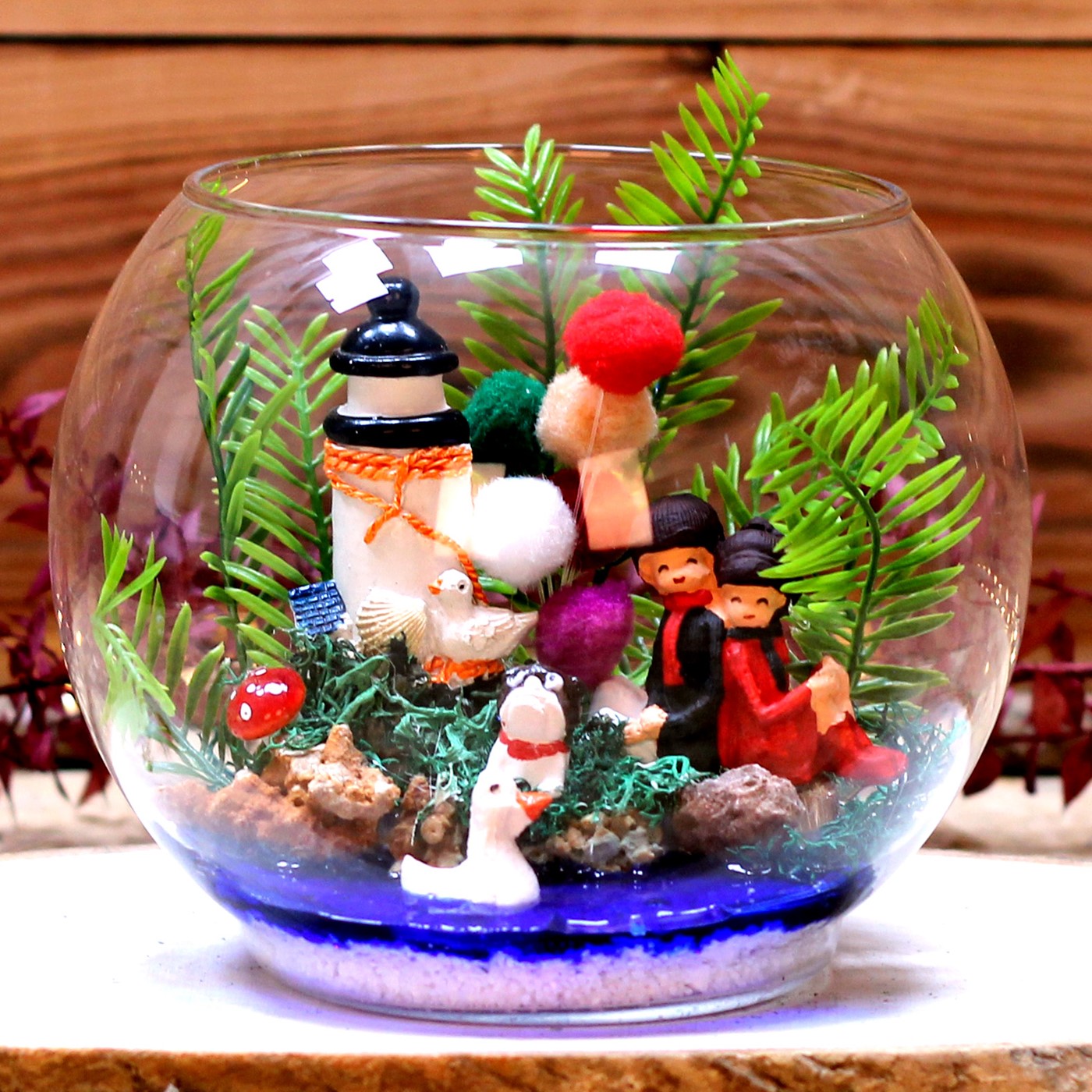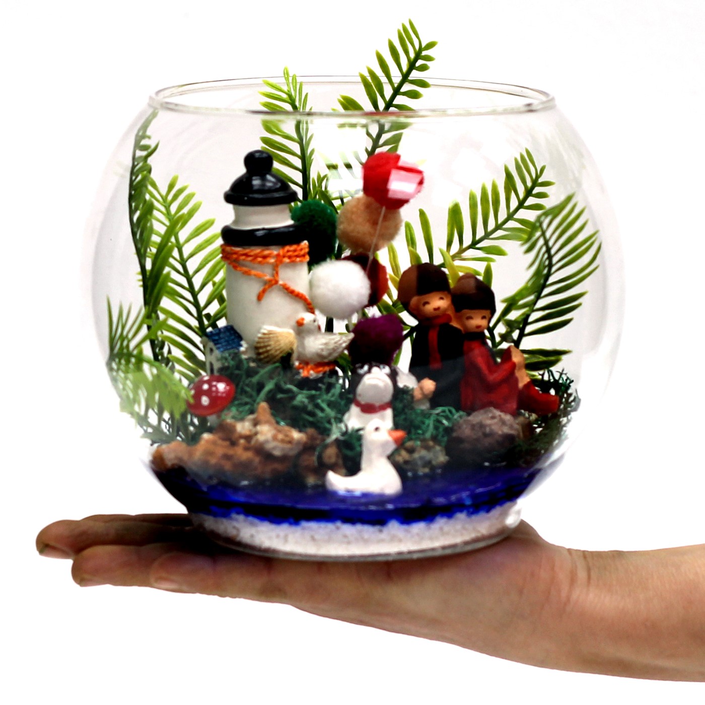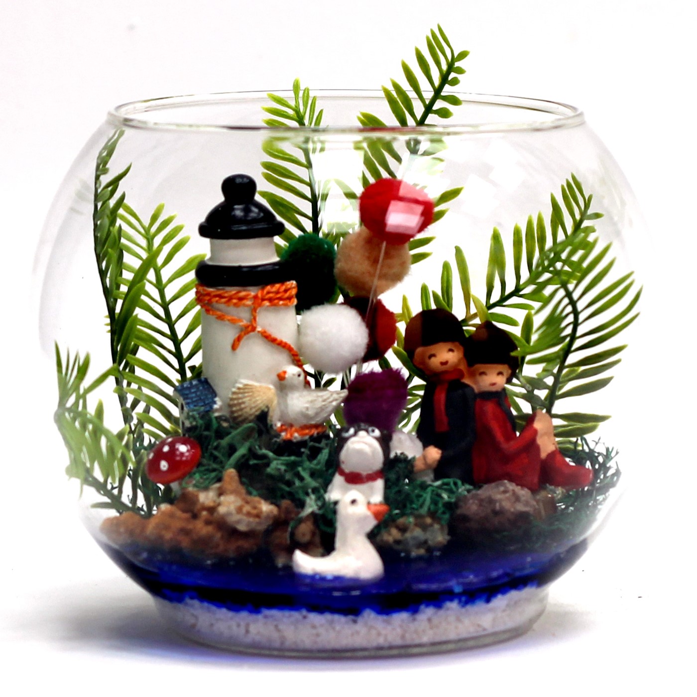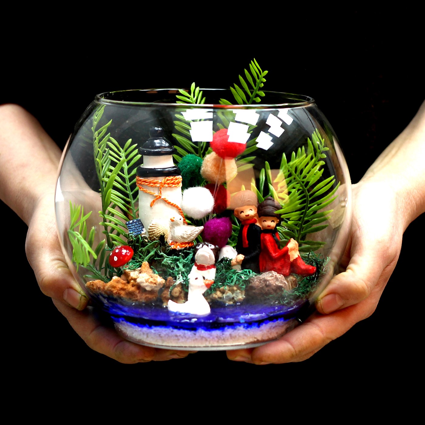 Sevgiliye hediye,erkek arkadaşa hediye kız arkadaşa hediye verebileceğiniz sevginizi en iyi şekilde yansıtıp mutluluk duyacağı bir hediye.</p> <p>Ürün özellikleri: Cam Fanus İçerisine hazırladığımız, yapay yeşillik bir adet ponponlardan yaptığımız balon,deniz feneri figürü,köpek ördek ve sırt sırta oturan sevgili figürleri bulunmaktadır. Özel jel ile göl manzarası verilmiştir.</p> <p>Ürün herhangi bir bakıma ihtiyaç duymadığı için her ortama uygundur.</p> <p>Ürün Ölçüleri: En:18cm Boy:18cm'dir.