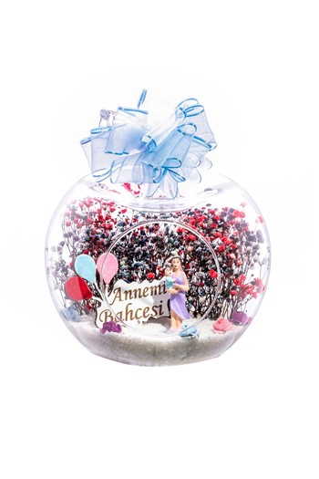Kurdele takılmış küçük boy elma cam fanus içerisinde tasarladığımız bu çok anlamlı teraryum; beyaz kum, şoklanmış yosunlar, kurutulmuş bitkiler, bir adet antika otomobil görseli, bir adet ahşap beyaz ev ve bahçesinde çocuklarını sevgiyle sarmalamış bir anne görseli kullanılarak tamamlanmıştır. Ev ve ofis ortamlarının tamamında sergilenebilir teraryumun içinde, kurutulmuş ve şoklanmış bitkiler bulunduğundan hava alması önemlidir. Açık olan kısmının kapatılmaması veya büfe vb. kapalı alanlara konulmaması gereklidir. Özellikle her ortamda yıllarca, zevkle izlenebilecek özel bir teraryumdur. Yaklaşık Ölçüleri: 20x20cm NOT: Teraryumlarda kullanılan camlar, üfleme cam işçiliğiyle üretildiğinden bazı detaylarda farklılıklar gözlenebilir. Örneğin, sap kısmı ve ağız bitiş noktalarının her biri kendine özgüdür.