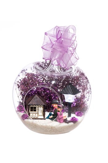 Küçük boy elma cam fanus içerisinde tasarladığımız bu kurdeleli güzel teraryum; beyaz kum, karışık renkli kurutulmuş bitkiler, renkli yapay mini güller, bir adet ahşap canım annem yazılı balonlu tabela ve bir adet kumral lacivert elbiseli genç kadını simgeleyen objeler kullanılarak tamamlanmıştır. Ev ve ofis ortamlarının tamamında sergilenebilir teraryumun içinde, kurutulmuş bitkiler bulunduğundan hava alması önemlidir. Açık olan kısmının kapatılmaması veya büfe vb. kapalı alanlara konulmaması gereklidir. Özellikle her ortamda yıllarca, zevkle izlenebilecek özel bir teraryumdur. Yaklaşık Ölçüleri: 20x20cm NOT: Teraryumlarda kullanılan camlar, üfleme cam işçiliğiyle üretildiğinden bazı detaylarda farklılıklar gözlenebilir. Örneğin, sap kısmı ve ağız bitiş noktalarının her biri kendine özgüdür.