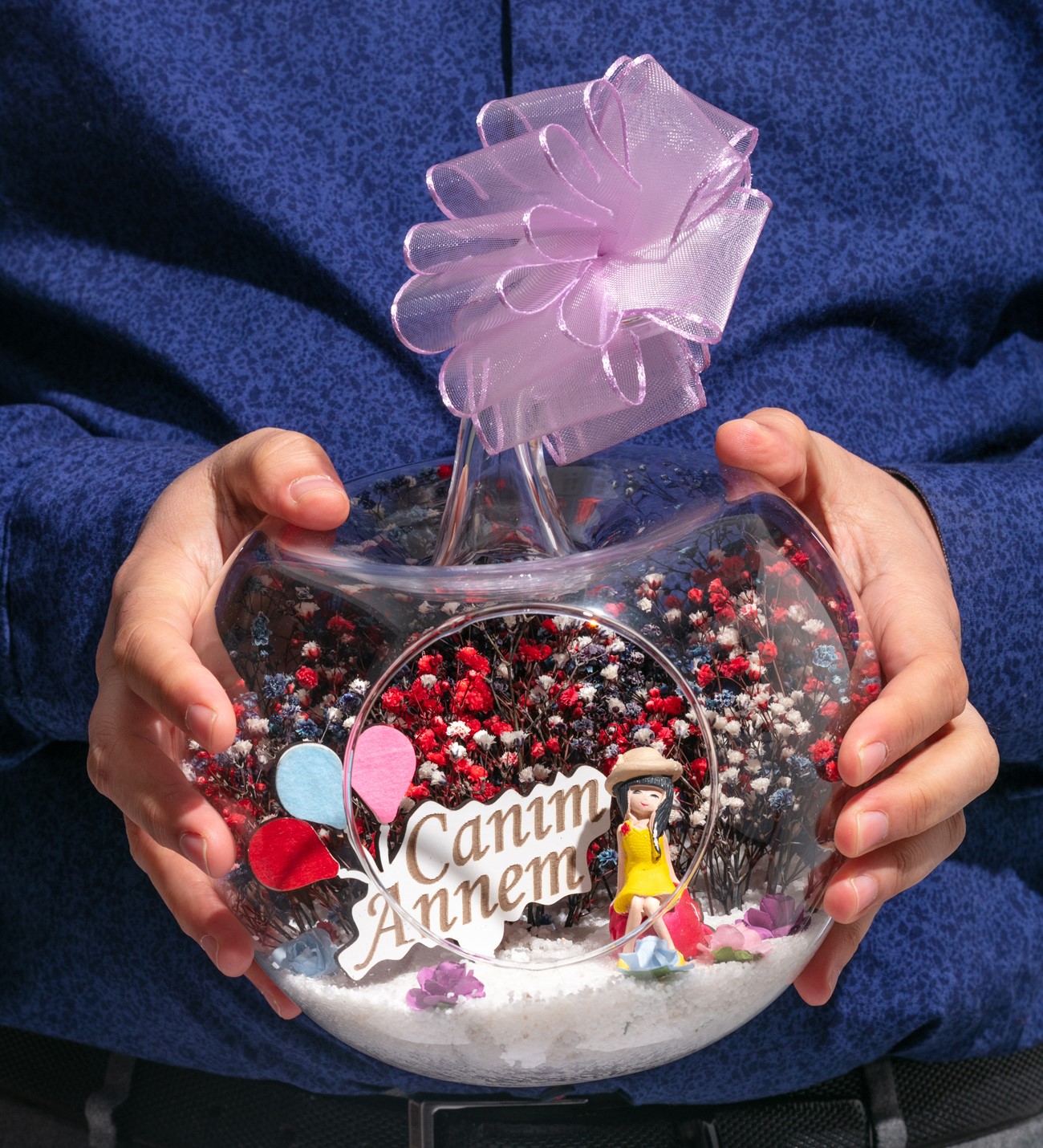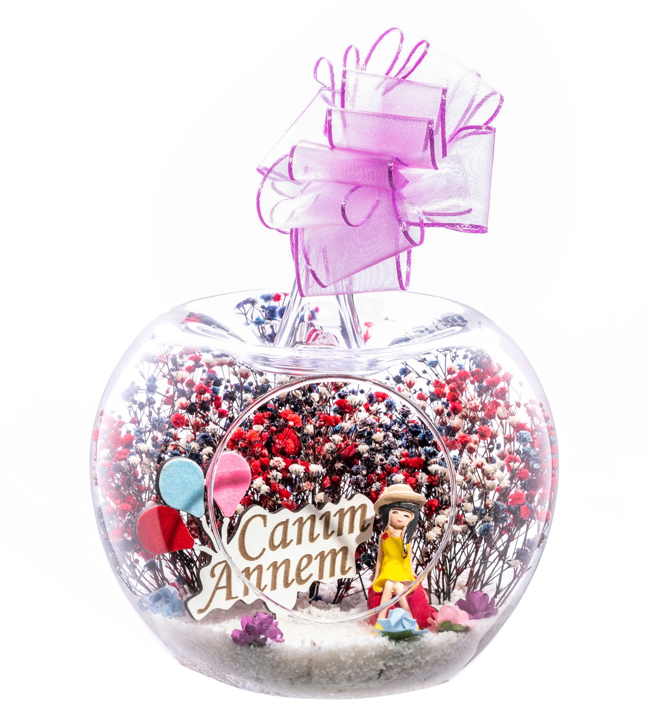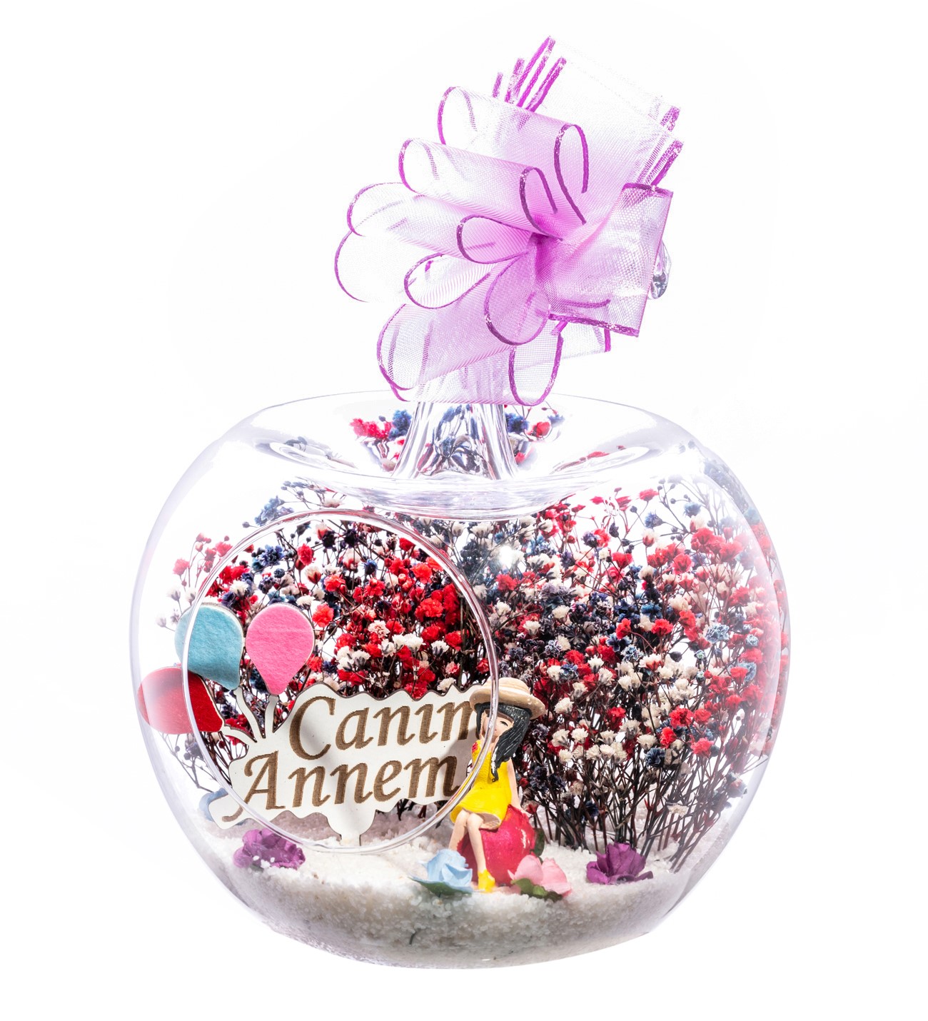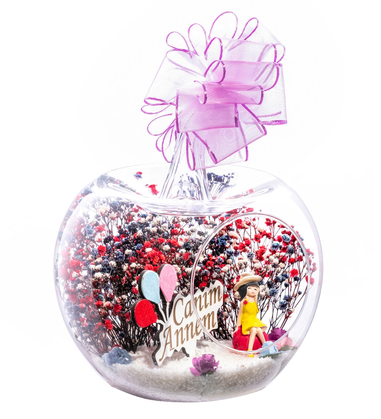 Küçük boy elma cam fanus içerisinde tasarladığımız bu kurdeleli güzel teraryum; beyaz kum, karışık renkli kurutulmuş bitkiler, renkli yapay mini güller, bir adet ahşap canım annem yazılı balonlu tabela ve bir adet sarı elbiseli genç kadını simgeleyen objeler kullanılarak tamamlanmıştır. Ev ve ofis ortamlarının tamamında sergilenebilir teraryumun içinde, kurutulmuş bitkiler bulunduğundan hava alması önemlidir. Açık olan kısmının kapatılmaması veya büfe vb. kapalı alanlara konulmaması gereklidir. Özellikle her ortamda yıllarca, zevkle izlenebilecek özel bir teraryumdur. Yaklaşık Ölçüleri: 20x20cm NOT: Teraryumlarda kullanılan camlar, üfleme cam işçiliğiyle üretildiğinden bazı detaylarda farklılıklar gözlenebilir. Örneğin, sap kısmı ve ağız bitiş noktalarının her biri kendine özgüdür.