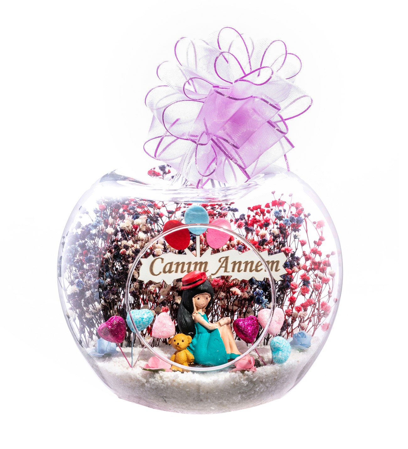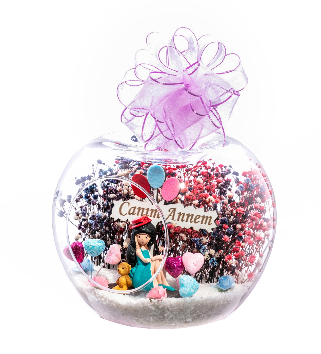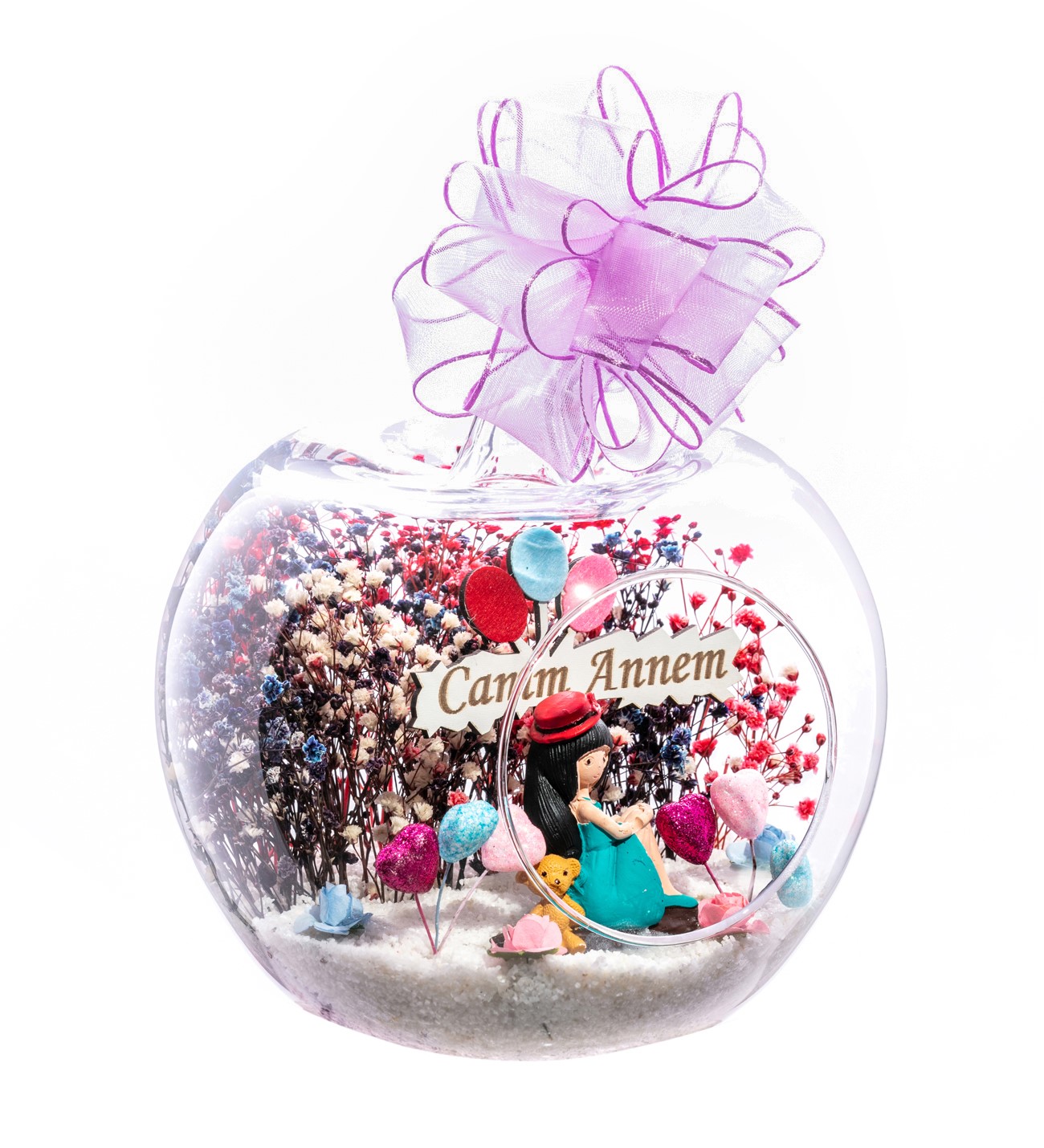Küçük boy elma cam fanus içerisinde tasarladığımız bu kurdeleli güzel teraryum; beyaz kum, karışık renkli kurutulmuş bitkiler, renkli yapay mini güller, renkli simli kalpler, bir adet ahşap canım annem yazılı balonlu tabela ve bir adet kırmızı şapkalı genç kadını simgeleyen objeler kullanılarak tamamlanmıştır. Ev ve ofis ortamlarının tamamında sergilenebilir teraryumun içinde, kurutulmuş bitkiler bulunduğundan hava alması önemlidir. Açık olan kısmının kapatılmaması veya büfe vb. kapalı alanlara konulmaması gereklidir. Özellikle her ortamda yıllarca, zevkle izlenebilecek özel bir teraryumdur. Yaklaşık Ölçüleri: 20x20cm NOT: Teraryumlarda kullanılan camlar, üfleme cam işçiliğiyle üretildiğinden bazı detaylarda farklılıklar gözlenebilir. Örneğin, sap kısmı ve ağız bitiş noktalarının her biri kendine özgüdür.