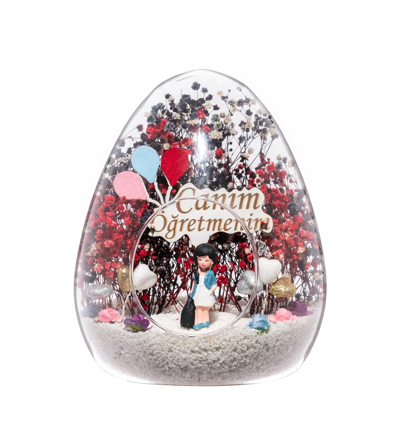 Küçük boy yumurta cam fanus içerisinde tasarladığımız, bu özgün teraryum; beyaz kum, karışık renkli kuru bitkiler, yapay mini güller, renkli simli kalpler, bir adet ahşap balonlu CANIM ÖĞRETMENİM yazılı tabela ve bir adet bayan obje kullanılarak tamamlanmıştır. Ev ve ofis ortamlarının tamamında sergilenebilir teraryumun içinde, kurutulmuş ve şoklanmış bitkiler olduğundan hava alması önemlidir. Açık olan kısmının kapatılmaması veya büfe vb. kapalı alanlara konulmaması gereklidir. Özellikle her ortamda yıllarca, zevkle izlenebilecek özel bir teraryumdur. Yaklaşık Ölçüleri: 18x22cm NOT: Teraryumlarda kullanılan camlar, üfleme cam işçiliğiyle üretildiğinden bazı detaylarda farklılıklar gözlenebilir. Örneğin, ağız bitiş noktalarının her biri kendine özgüdür.