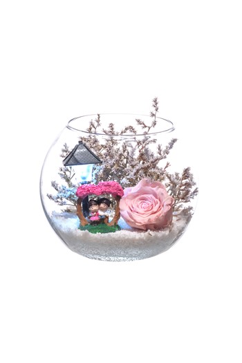 Küçük boy yumurta cam fanus içerisinde tasarladığımız, bu özgün teraryum; beyaz kum, karışık renkli kuru bitkiler, yapay mini güller, renkli simli kalpler, bir adet ahşap balonlu CANIM ÖĞRETMENİM yazılı tabela ve bir adet bayan obje kullanılarak tamamlanmıştır. Ev ve ofis ortamlarının tamamında sergilenebilir teraryumun içinde, kurutulmuş ve şoklanmış bitkiler olduğundan hava alması önemlidir. Açık olan kısmının kapatılmaması veya büfe vb. kapalı alanlara konulmaması gereklidir. Özellikle her ortamda yıllarca, zevkle izlenebilecek özel bir teraryumdur. Yaklaşık Ölçüleri: 18x22cm NOT: Teraryumlarda kullanılan camlar, üfleme cam işçiliğiyle üretildiğinden bazı detaylarda farklılıklar gözlenebilir. Örneğin, ağız bitiş noktalarının her biri kendine özgüdür.