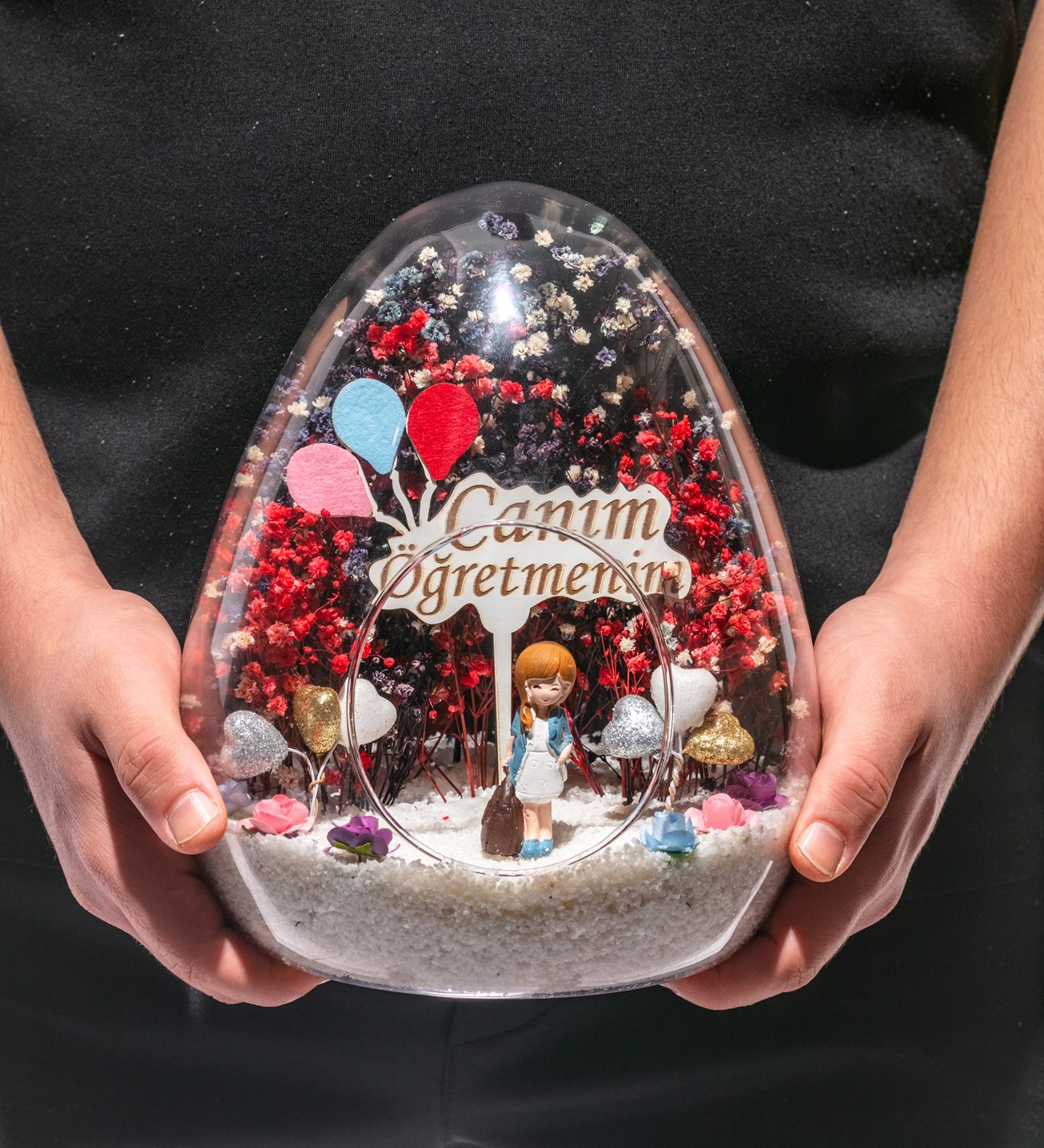 Küçük boy yumurta cam fanus içerisinde tasarladığımız, bu özgün teraryum; beyaz kum, karışık renkli kuru bitkiler, yapay mini güller, renkli simli kalpler, bir adet ahşap balonlu CANIM ÖĞRETMENİM yazılı tabela ve bir adet bayan obje kullanılarak tamamlanmıştır. Ev ve ofis ortamlarının tamamında sergilenebilir teraryumun içinde, kurutulmuş ve şoklanmış bitkiler olduğundan hava alması önemlidir. Açık olan kısmının kapatılmaması veya büfe vb. kapalı alanlara konulmaması gereklidir. Özellikle her ortamda yıllarca, zevkle izlenebilecek özel bir teraryumdur. Yaklaşık Ölçüleri: 18x22cm NOT: Teraryumlarda kullanılan camlar, üfleme cam işçiliğiyle üretildiğinden bazı detaylarda farklılıklar gözlenebilir. Örneğin, ağız bitiş noktalarının her biri kendine özgüdür.