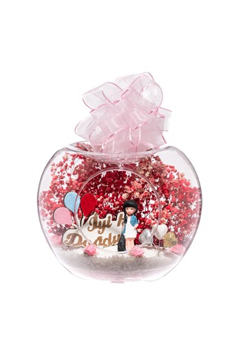Küçük boy elma cam fanus içerisinde tasarladığımız bu kurdeleli güzel teraryum; beyaz kum, karışık renkli kurutulmuş bitkiler, renkli yapay mini güller, bir adet ahşap canım öğretmenim yazılı balonlu tabela ve bir adet esmer genç kadını simgeleyen objeler kullanılarak tamamlanmıştır. Ev ve ofis ortamlarının tamamında sergilenebilir teraryumun içinde, kurutulmuş bitkiler bulunduğundan hava alması önemlidir. Açık olan kısmının kapatılmaması veya büfe vb. kapalı alanlara konulmaması gereklidir. Özellikle her ortamda yıllarca, zevkle izlenebilecek özel bir teraryumdur. Yaklaşık Ölçüleri: 20x20cm NOT: Teraryumlarda kullanılan camlar, üfleme cam işçiliğiyle üretildiğinden bazı detaylarda farklılıklar gözlenebilir. Örneğin, sap kısmı ve ağız bitiş noktalarının her biri kendine özgüdür.
