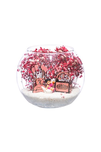 Küçük boy elma cam fanus içerisinde tasarladığımız teraryum, bu en güzel gününde gönderilen kişiyi son derece mutlu edecek şekilde tasarlandı. Tasarımımız; beyaz kum, şoklanmış yosunlar, kurutulmuş bitkilerle beraber , bir adet doğum günü pastası bulunan sehpa, iki adet sandalye, iyi ki doğdun yazan balonlu ahşap ağaç objelerle tamamlanmıştır. Ev ve ofis ortamlarının tamamında sergilenebilir teraryumun içinde canlı bitki bulunmadığından, herhangi bir bakıma ihtiyacı yoktur. Özellikle her ortamda yıllarca, zevkle izlenebilecek çok özel bir teraryumdur. Yaklaşık Ölçüleri: 20x20cm NOT: Teraryumlarda kullanılan camlar, üfleme cam işçiliğiyle üretildiğinden bazı detaylarda farklılıklar gözlenebilir. Örneğin, sap kısmı ve ağız bitiş noktalarının her biri kendine özgüdür.