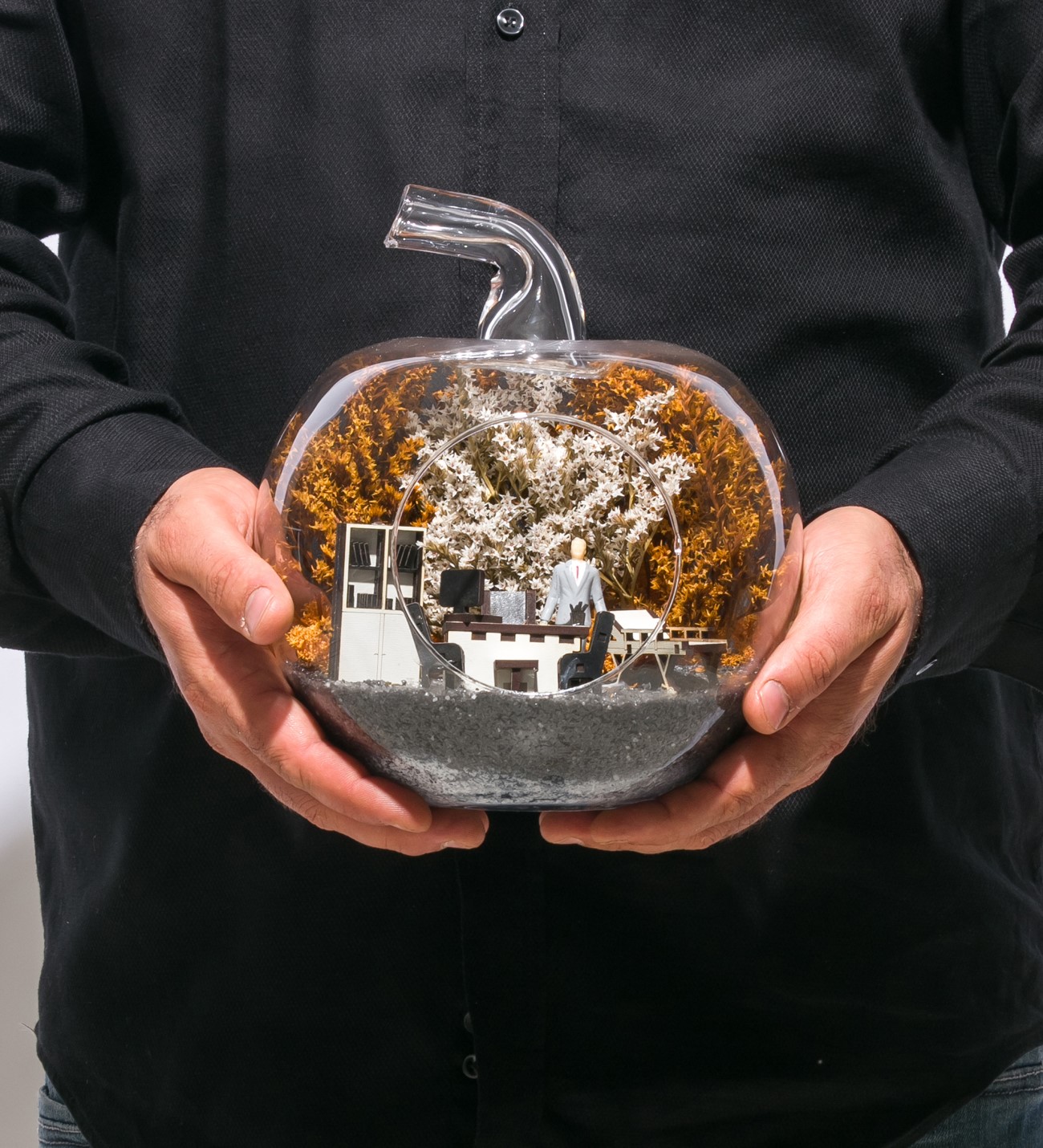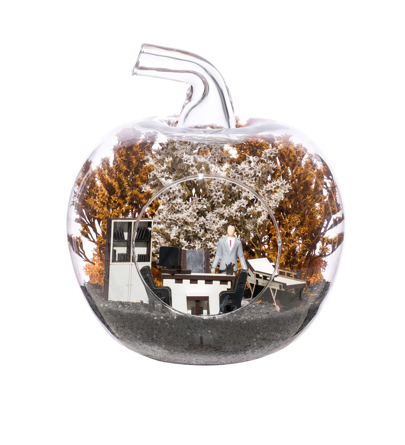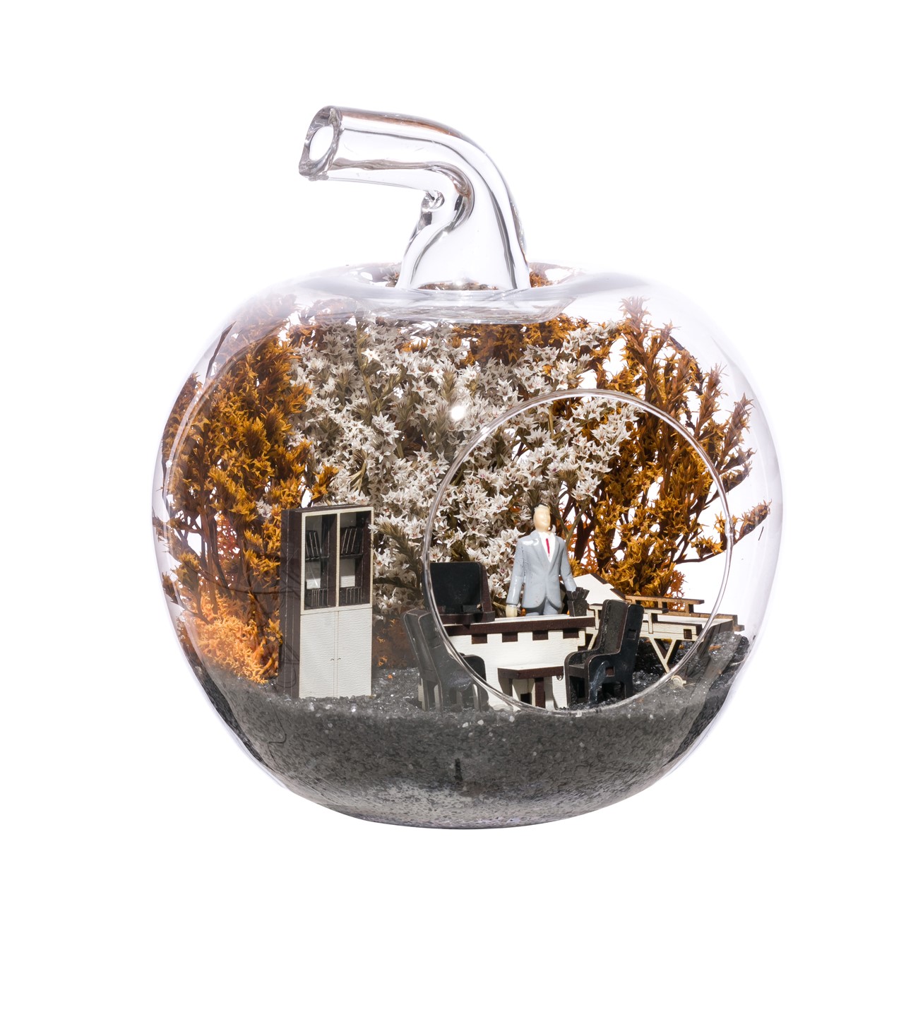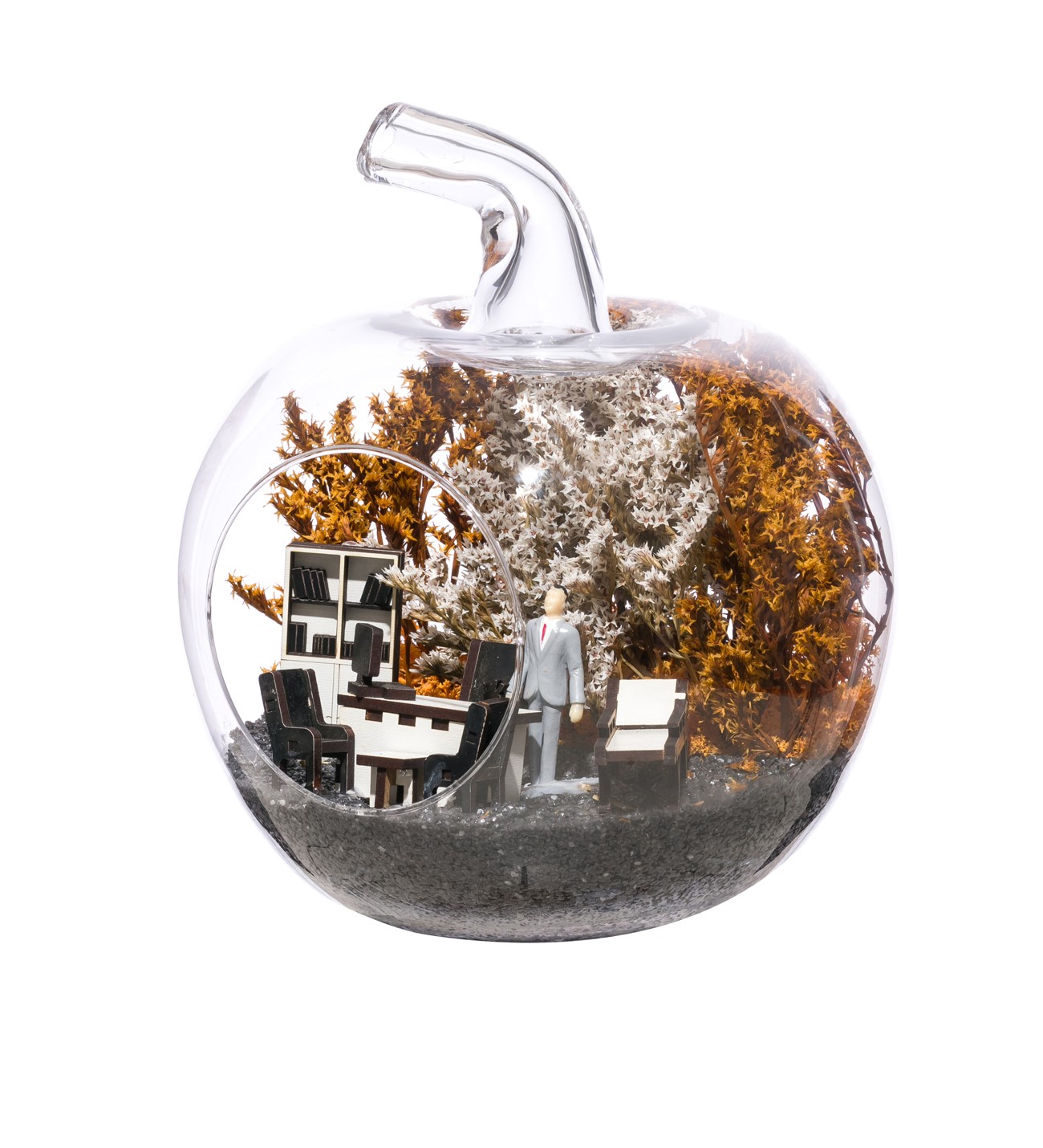 Küçük boy elma cam fanus içerisinde tasarladığımız bu alıcısına özel teraryum; siyah kum, kurutulmuş bitkiler, şoklanmış yosunlar, bir adet erkek obje ve doktor odasını simgeleyen ahşap objelerle tamamlanmıştır. Ev ve ofis ortamlarının tamamında sergilenebilir teraryumun içinde kurutulmuş bitkiler bulunduğundan hava alması önemlidir. Açık olan kısmının kapatılmaması veya büfe vb. kapalı alanlara konulmaması gereklidir. Özellikle her ortamda yıllarca, zevkle izlenebilecek özel bir teraryumdur. Yaklaşık Ölçüleri: 20x20cm NOT: Teraryumlarda kullanılan camlar, üfleme cam işçiliğiyle üretildiğinden bazı detaylarda farklılıklar gözlenebilir. Örneğin, sap kısmı ve ağız bitiş noktalarının her biri kendine özgüdür.