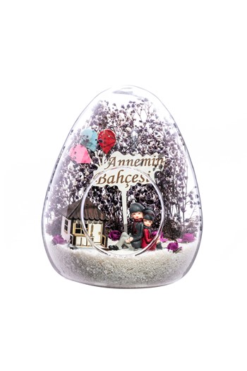 Küçük boy elma cam fanus içerisinde tasarladığımız bu güzel teraryum; beyaz kum, karışık renkli kurutulmuş bitkiler, renkli yapay mini güller, renkli simli kalpler, bir adet ahşap canım annem yazılı balonlu tabela ve bir adet sarı elbiseli genç kadını simgeleyen objeler kullanılarak tamamlanmıştır. Ev ve ofis ortamlarının tamamında sergilenebilir teraryumun içinde, kurutulmuş bitkiler bulunduğundan hava alması önemlidir. Açık olan kısmının kapatılmaması veya büfe vb. kapalı alanlara konulmaması gereklidir. Özellikle her ortamda yıllarca, zevkle izlenebilecek özel bir teraryumdur. Yaklaşık Ölçüleri: 20x20cm NOT: Teraryumlarda kullanılan camlar, üfleme cam işçiliğiyle üretildiğinden bazı detaylarda farklılıklar gözlenebilir. Örneğin, sap kısmı ve ağız bitiş noktalarının her biri kendine özgüdür.