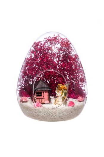 Küçük boy yumurta cam fanus içerisinde tasarladığımız bu güzel teraryum; beyaz kum, kurutulmuş bitkiler, şoklanmış yosunlar, bir adet motorsiklet görseli, bir adet anı paylaşan hanımefendi ve beyefendi görsel objelerle tamamlanmıştır. Ev ve ofis ortamlarının tamamında sergilenebilir teraryumun içinde, kurutulmuş ve şoklanmış bitkiler bulunduğundan hava alması önemlidir. Açık olan kısmının kapatılmaması veya büfe vb. kapalı alanlara konulmaması gereklidir. Özellikle her ortamda yıllarca, zevkle izlenebilecek özel bir teraryumdur. Yaklaşık Ölçüleri: 18x22cm NOT: Teraryumlarda kullanılan camlar, üfleme cam işçiliğiyle üretildiğinden bazı detaylarda farklılıklar gözlenebilir. Örneğin, ağız bitiş noktalarının her biri kendine özgüdür.